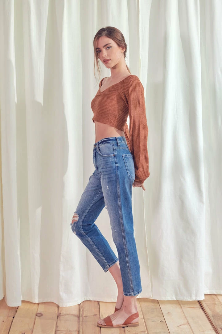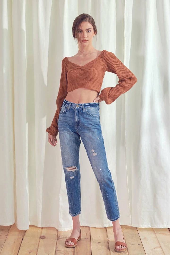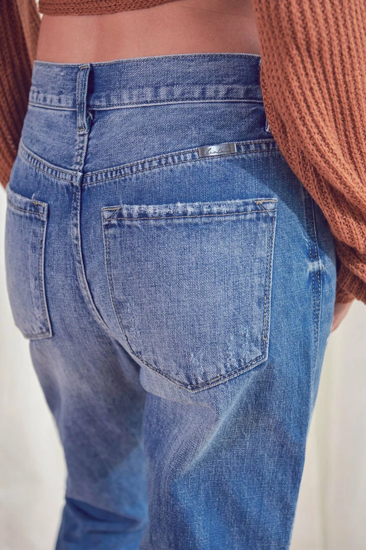 A medium-washed mom jean with faded details, 3D whiskering, and slight distress on the front of both legs. Our Lorelei Ultra High Rise Jeans sit high above the natural waistline as they relax down the thigh and leg for a laid-back look that goes great with any fit. Features a white paint-splatter detail for a unique, artsy style. Comes in rigid denim that will maintain its shape with a classic five-pocket design, single-button front, zip-fly, finished with rose gold hardware.