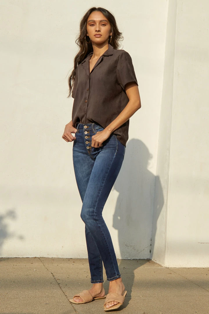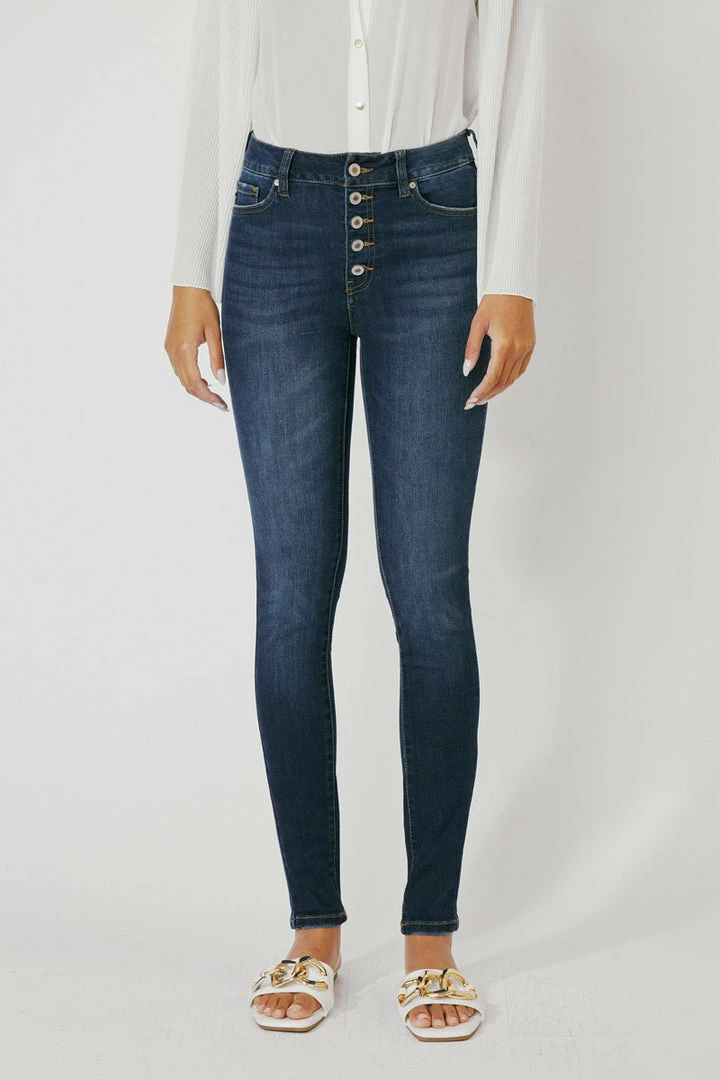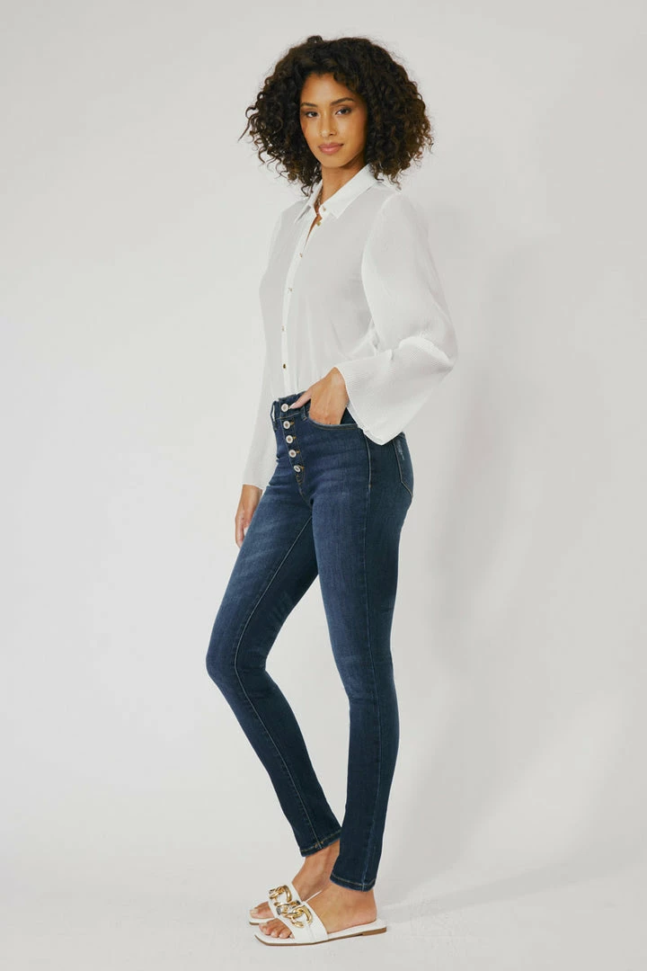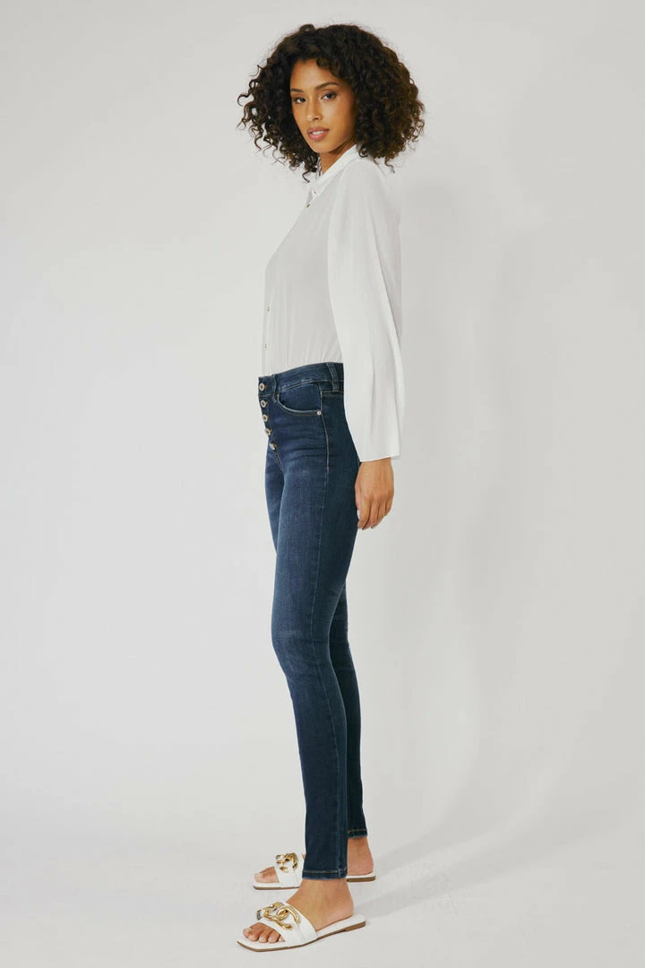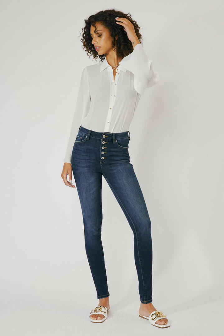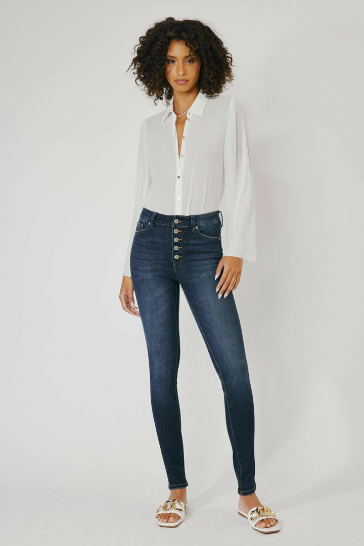 Our bestselling Lyla high-rise super skinny provides a perfect, silhouette-enhancing fit that shapes and hugs every curve with a soft feel to give you a boost of confidence! Featuring fading, whiskering, contrast stitching, 5-pocket design, and a 5-button front closure with zip fly.