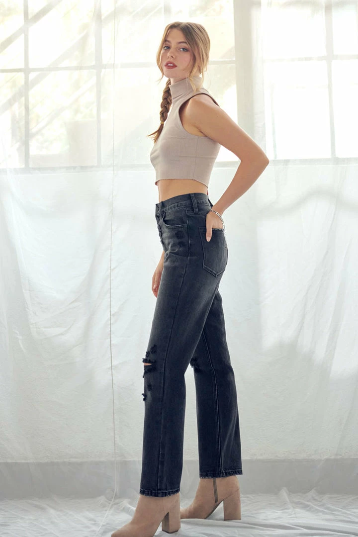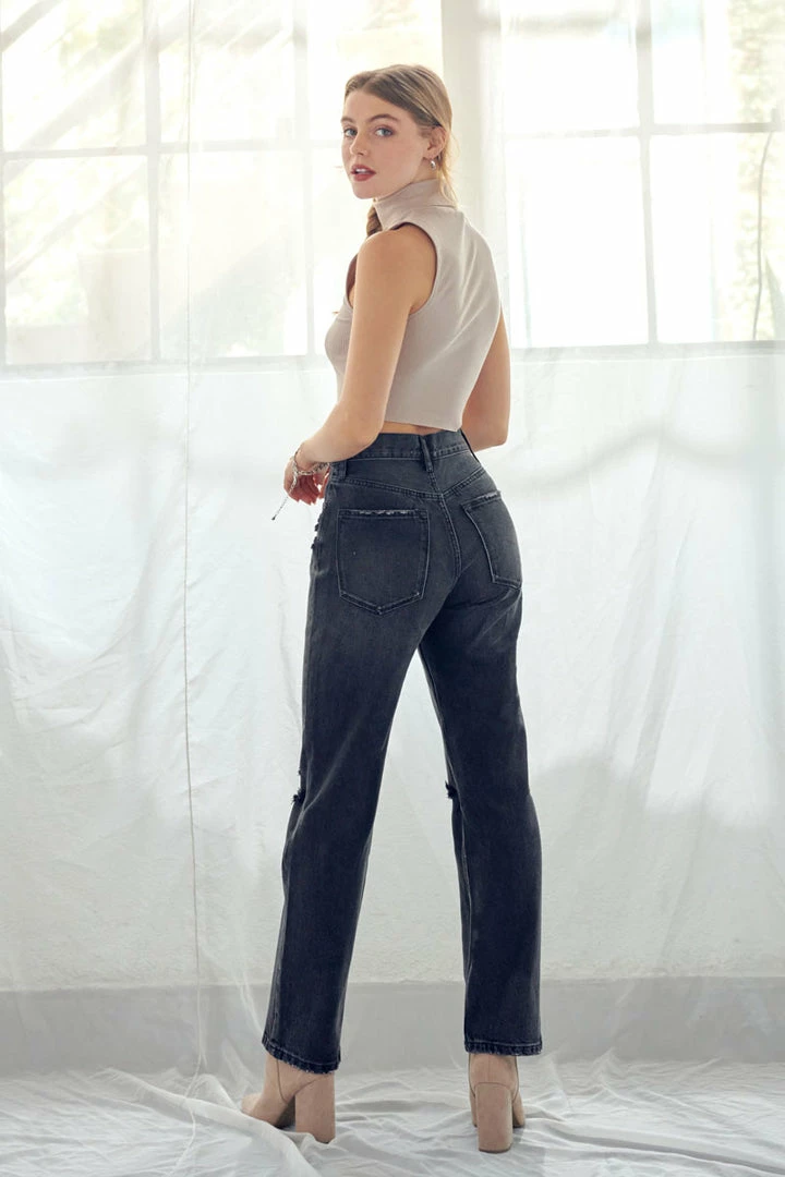Our Lynne Ultra High Rise Straight Jeans come in a dark grey wash with light whiskering and medium knee distress. Sits above the waistline for a full-body look, the denim falls straight down from the hip with a slight and barely noticeable tapered look. Features a classic 5 pocket style and exposed 5-button fly.Â