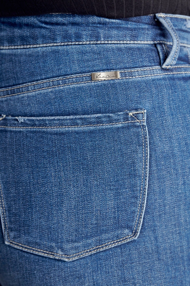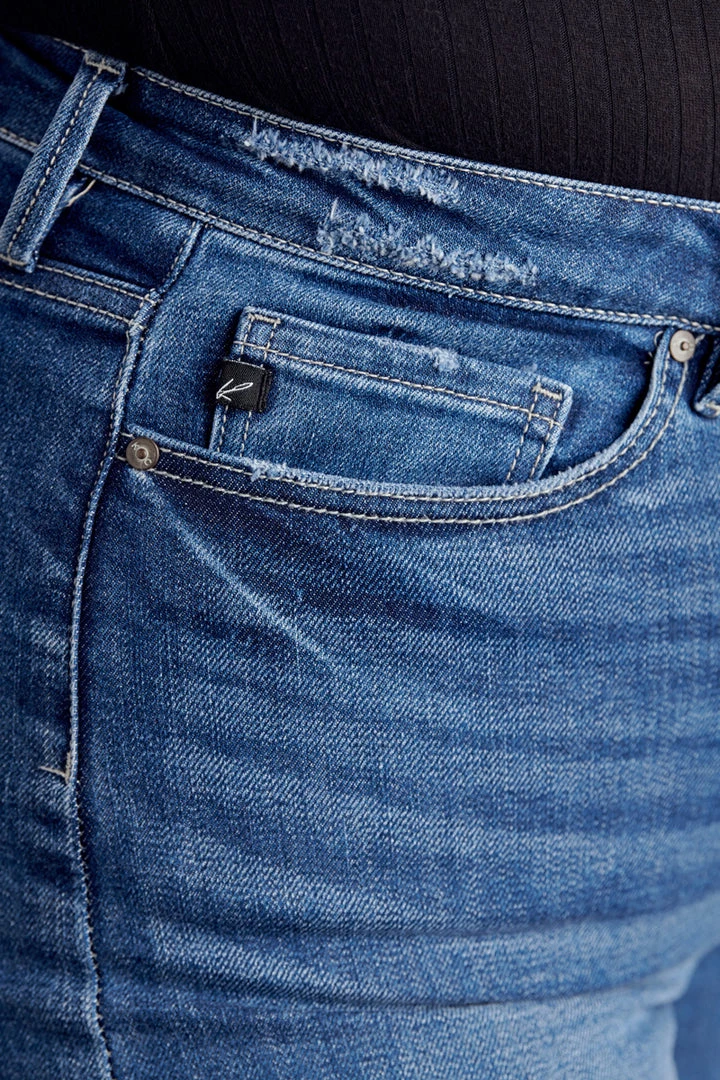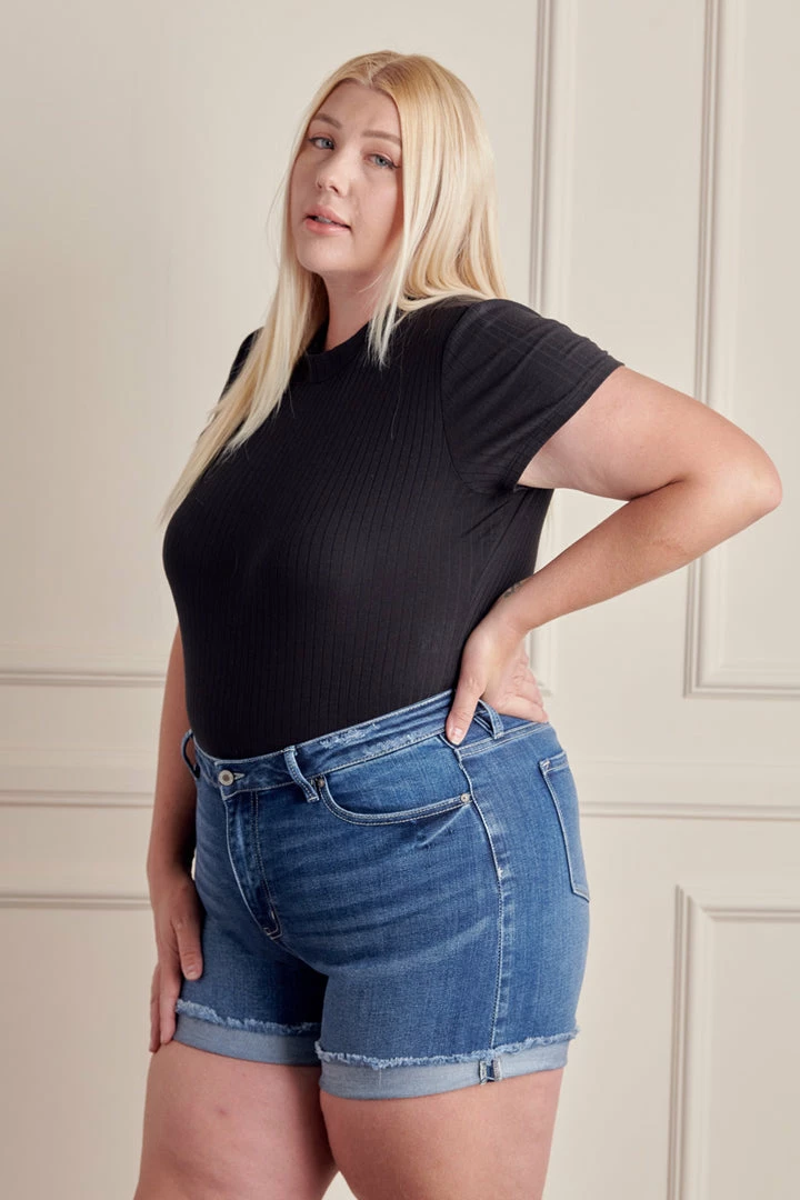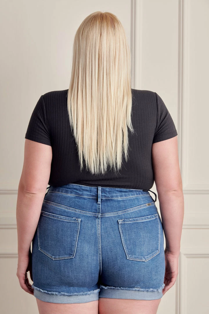Medium-washed denim shorts with single fold hem design in a plus fit for a trendy summer look. Our Macie Ultra High Rise Shorts sit above the natural waistline for a comfortable fit that will give you a flattering silhouette as it contours to your body. Made with super-stretch, breathable denim that lets you move with ease while maintaining its shape. Features a classic five-pocket design, single-button front with zip-fly closure, finished with gold-colored hardware.Â