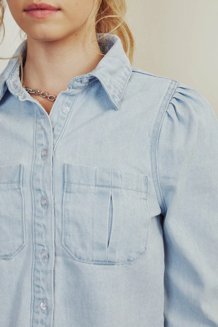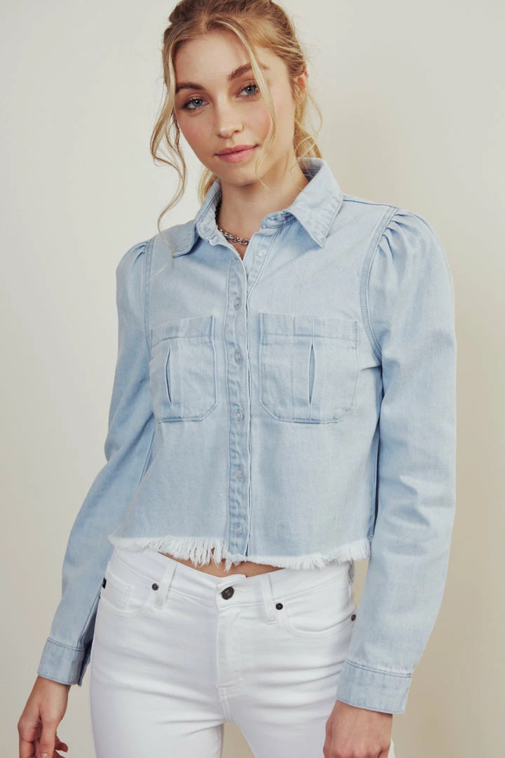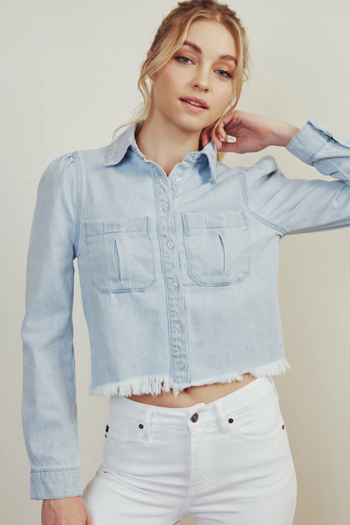 This cropped button-down shirt is a must-have in your closet! The unique design of pleats at the sleeve will give your outfit a soft touch while still keeping you stylish. Featuring a frayed bottom hem, patch pockets at the chest, and a classic button-down closure this style is perfect with some black leggings or skirts.