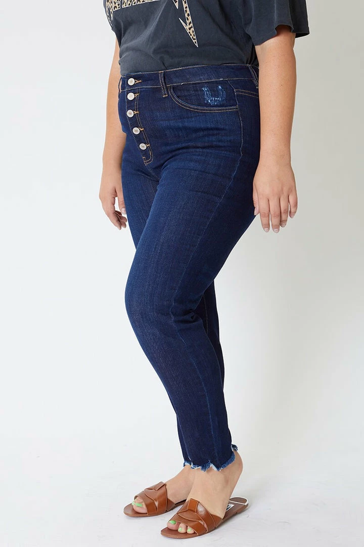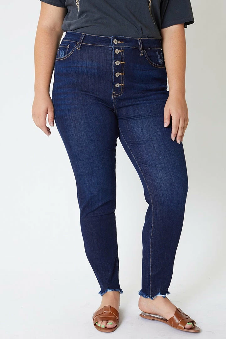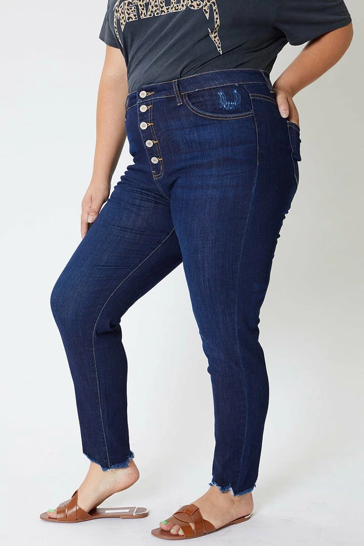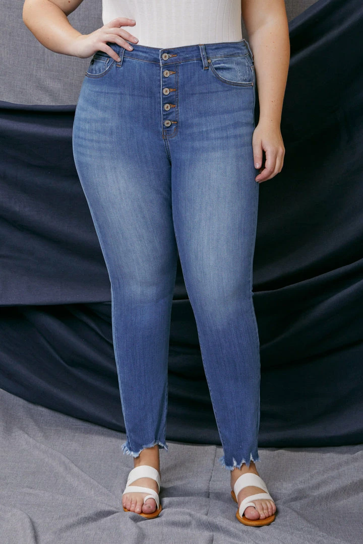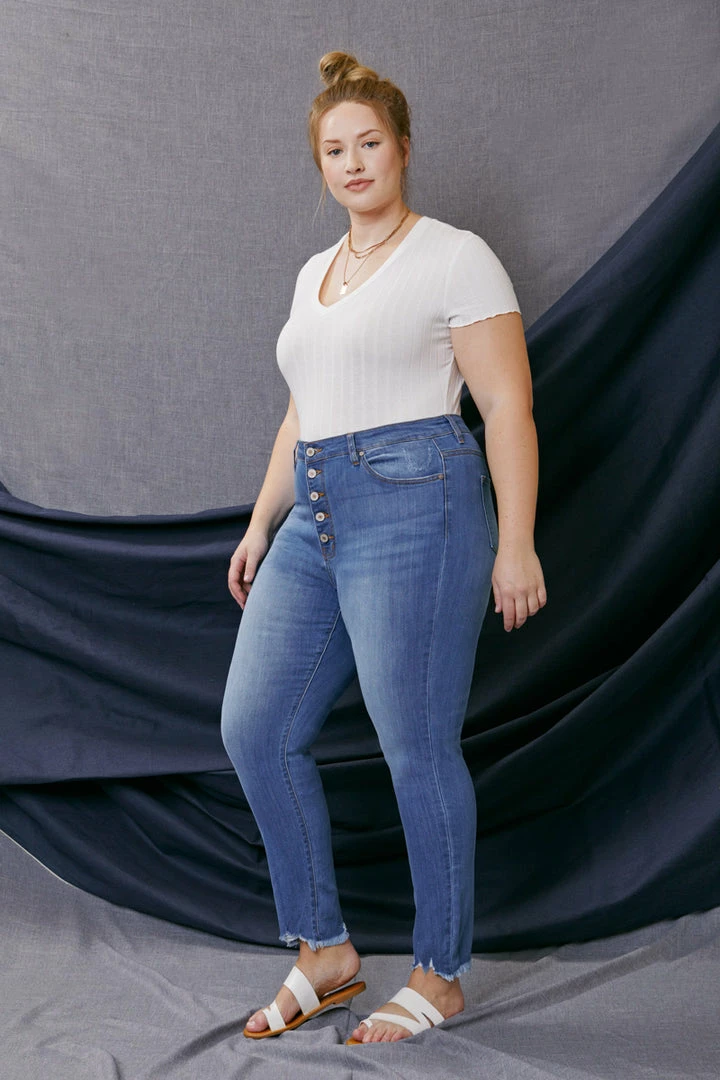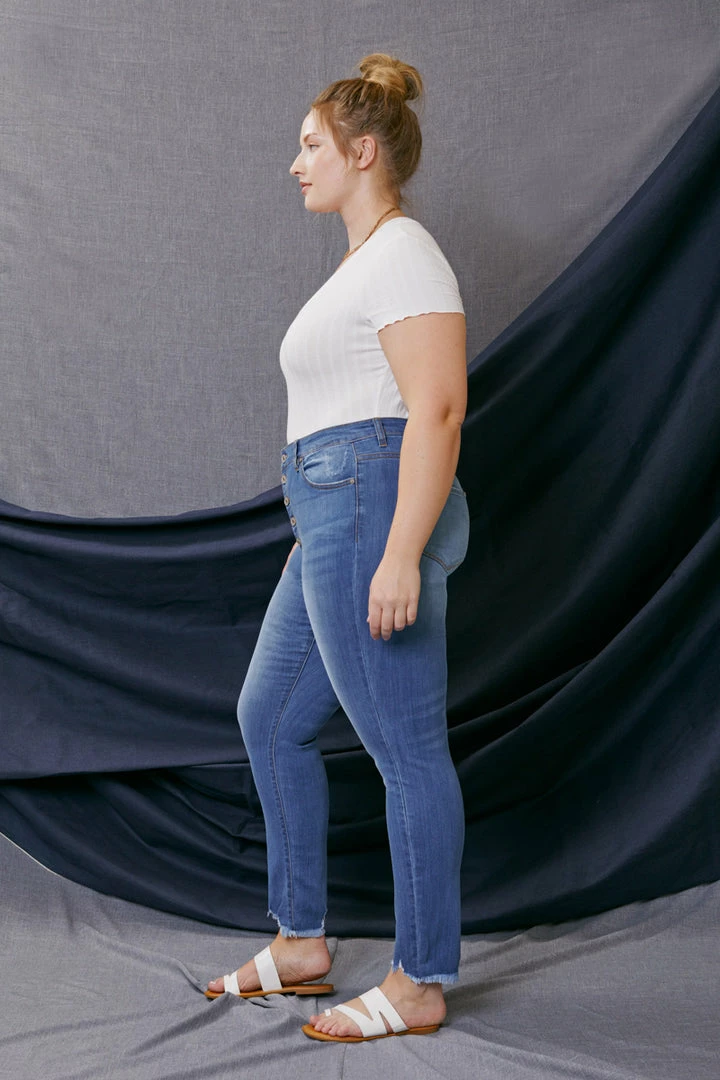 Our Martha High Rise Jeans come in a super skinny cut with a lightly faded wash available in medium, dark, and super dark. Sits high above the natural waistline as it tapers down the leg creating a figure-flattering silhouette that hugs all your curves. Made with stretchable soft denim that’s smooth and durable. Features a raw hem classic five-pocket design and a five-button front closure.