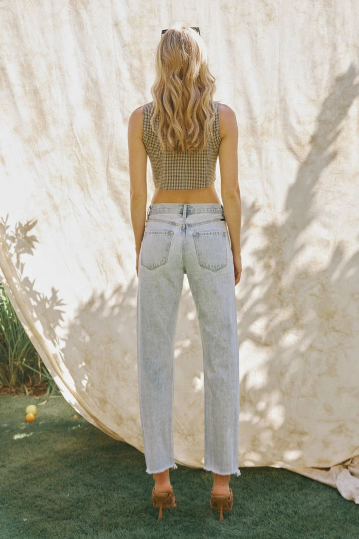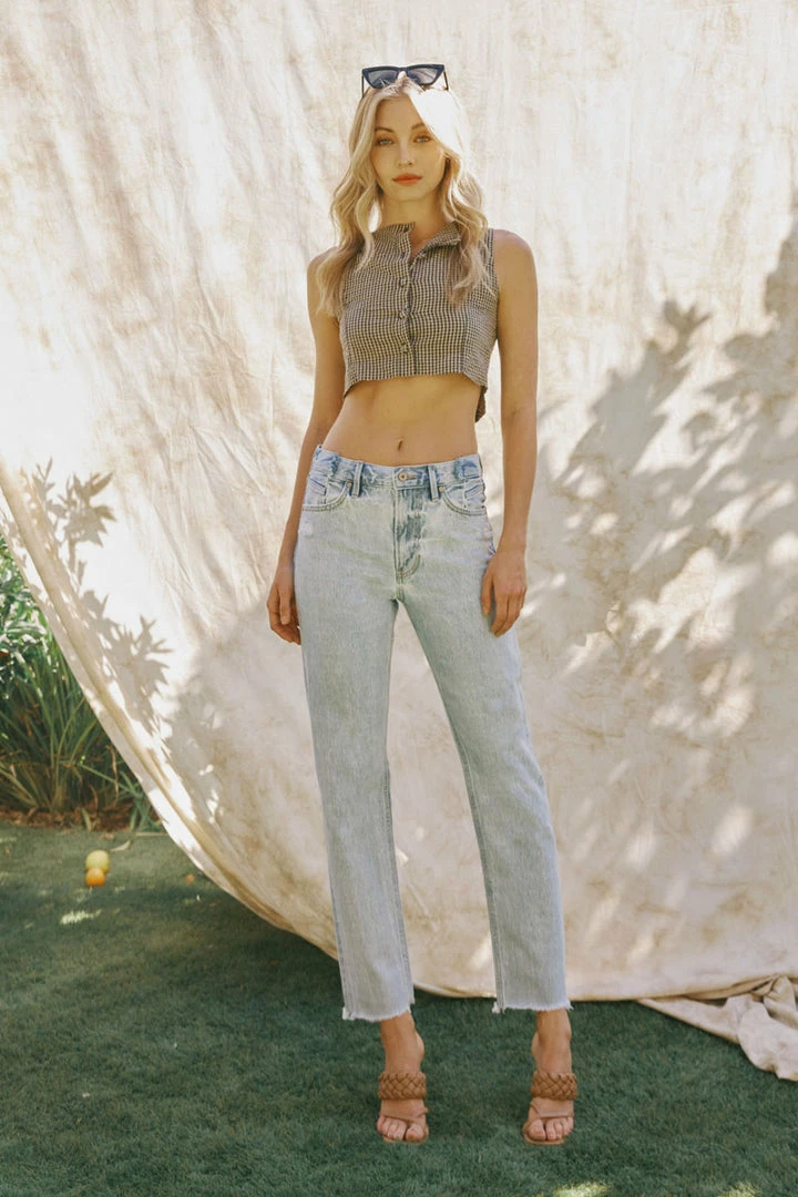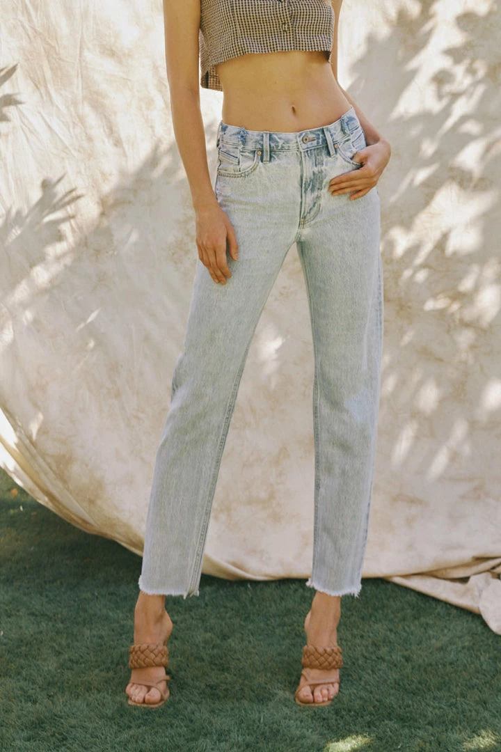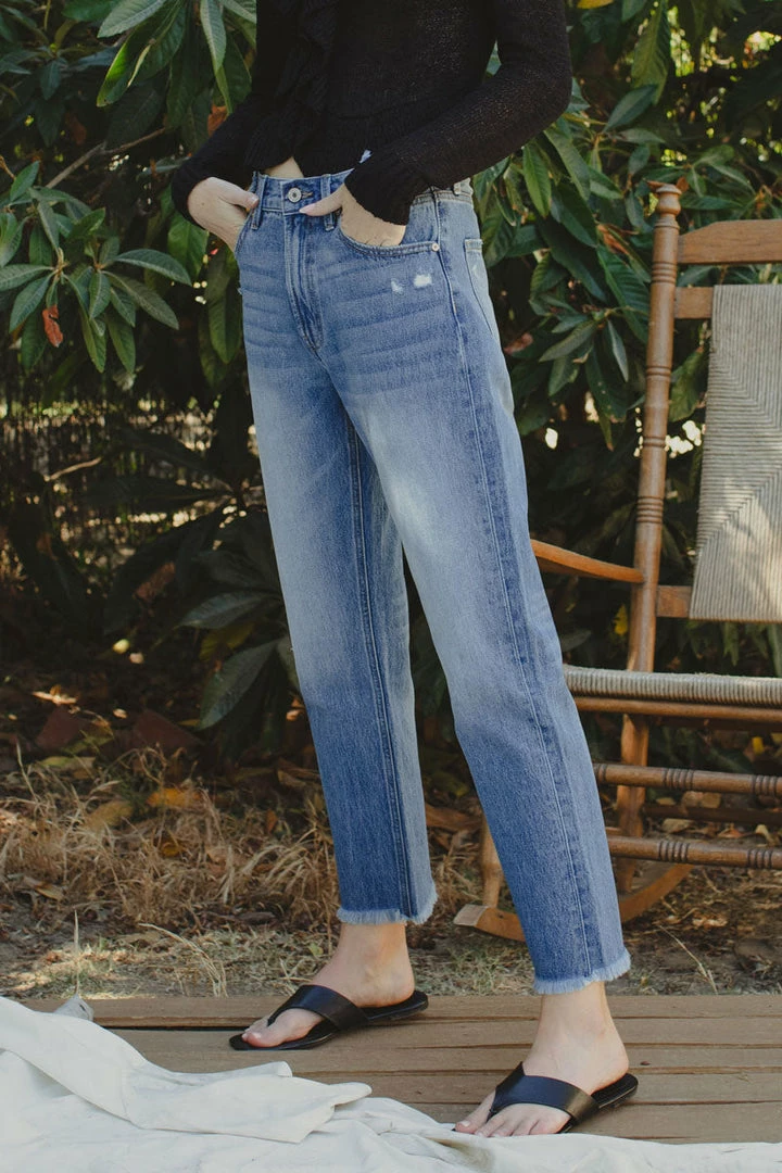 Medium blue denim featuring, whiskering, and a raw edge frayed hem for a worn-in look. Our Meadow High Rise Jeans sit high above the natural waistline as they relax through the thigh and leg creating a classic straight leg style with a relaxed fit. Made with rigid denim that holds its shape while giving you enough stretch to move comfortably. Features a classic five-pocket design, single-button front, and zip-fly closure.