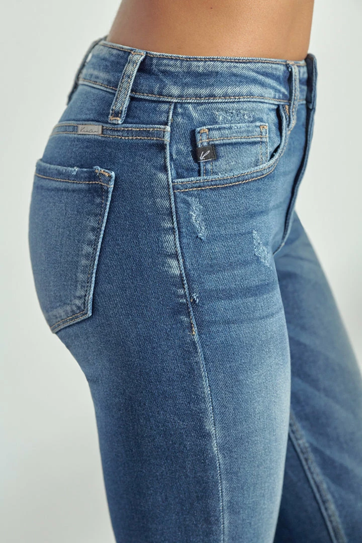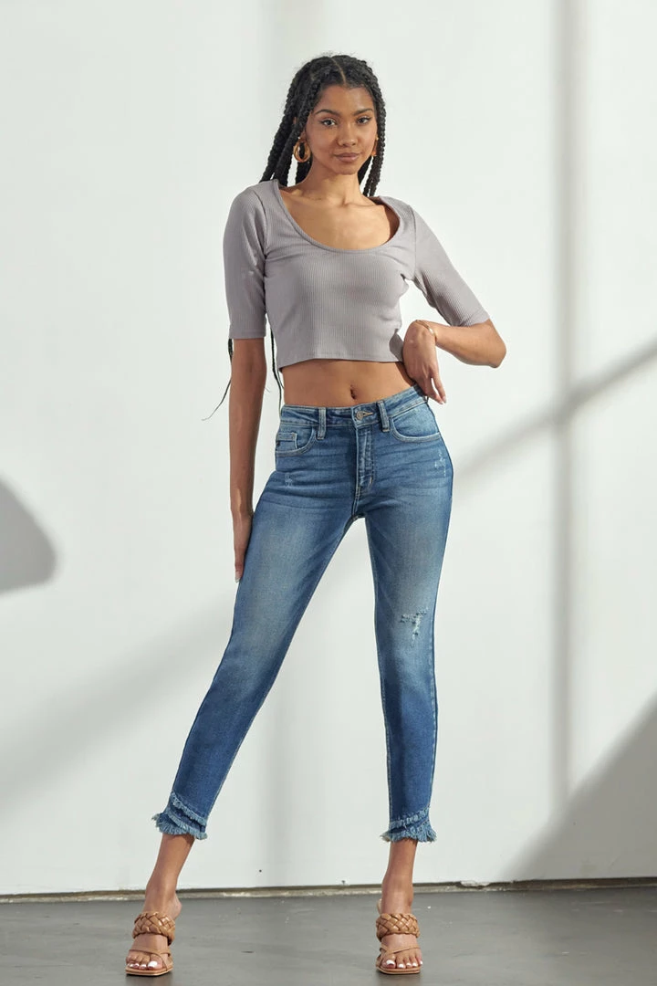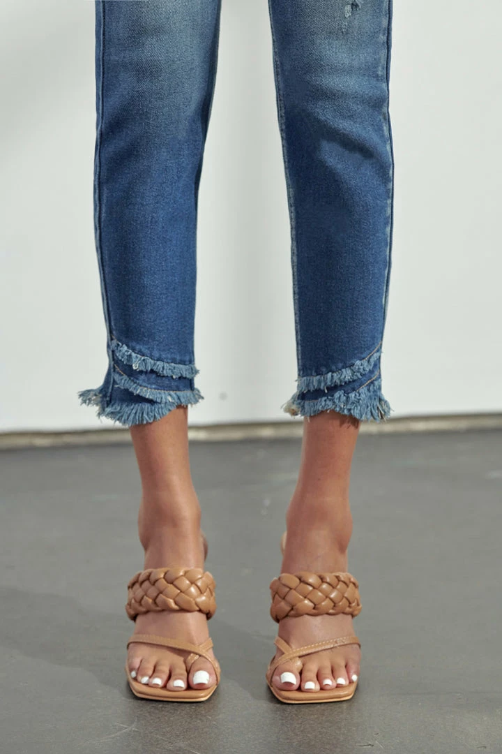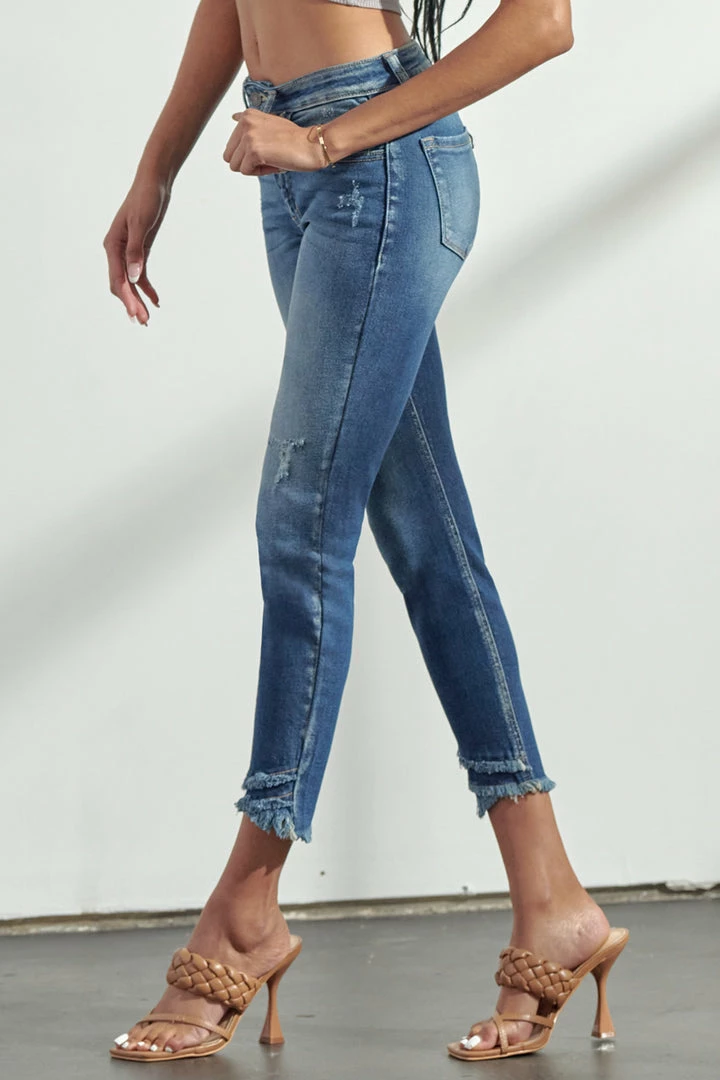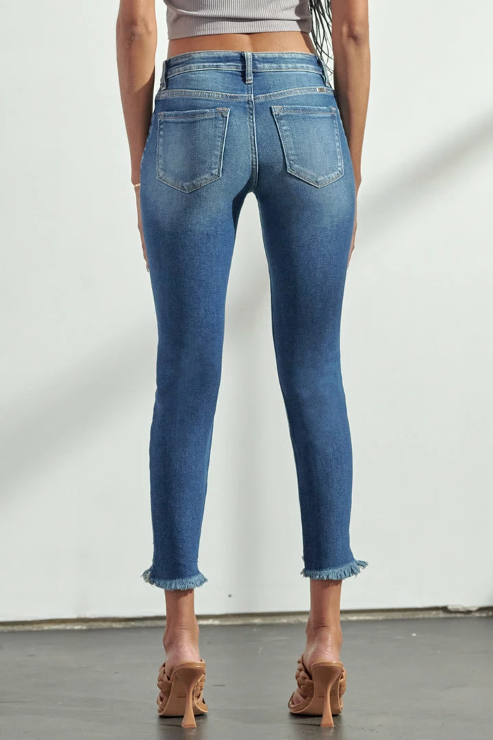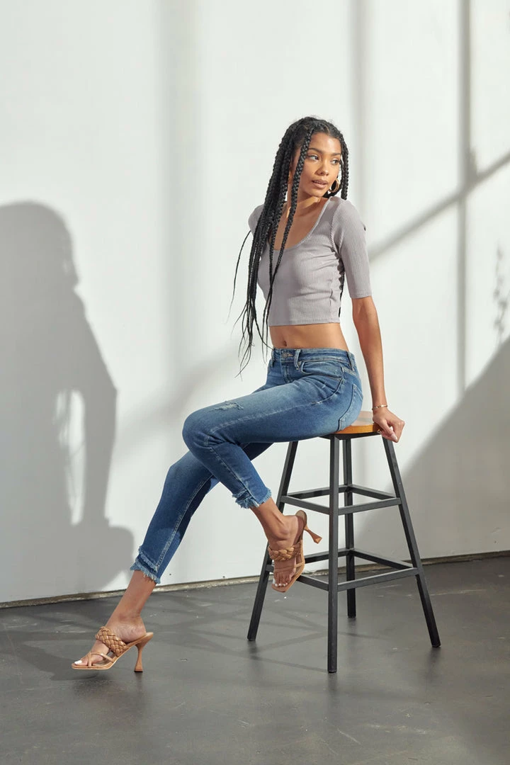 Dark blue denim with a faded wash, minor distress, and unique released raw hem. Our Mercy High Rise Jeans sit above the natural waistline while they taper down the thigh and leg for a flattering ankle skinny fit. Its distress marks create a slightly worn-in look while its stretch denim fabric makes this design a comfortable piece that allows you to move with ease. Features a classic five-pocket design, single-button front, and zip-fly closure. Finished with antique gold hardware.