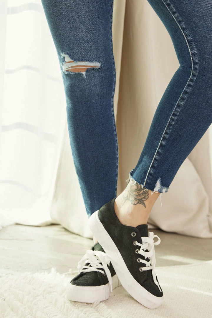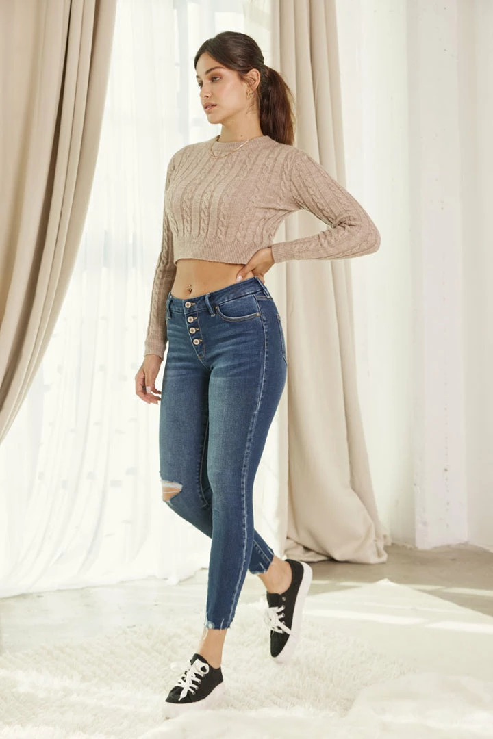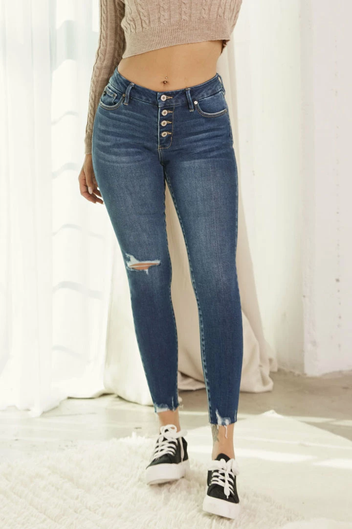 Our Milo high-rise ankle skinny jean features the perfect amount of distress and whiskering that complements its beautiful dark blue wash. With a design made for curvy women, it’ll have you feeling comfortable in all the right places, while still making you feel stylish and chic.