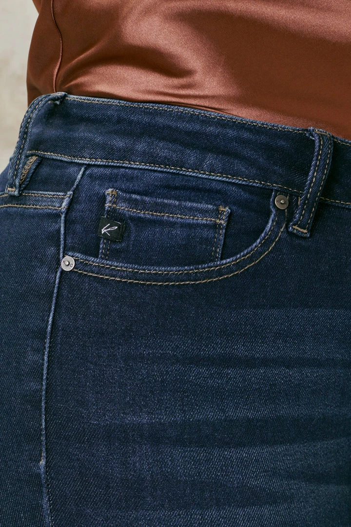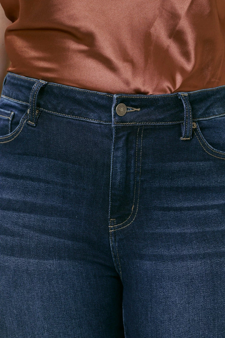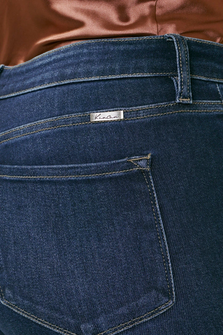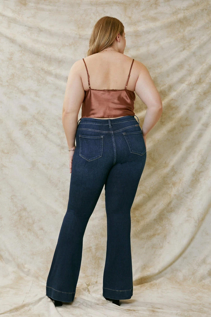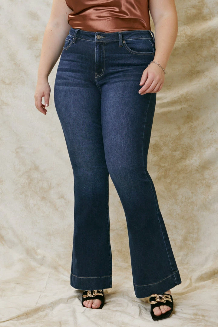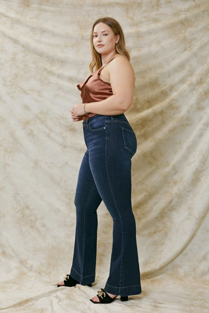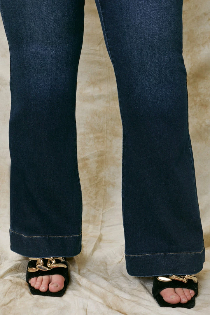 Enjoy your sweet style with this pair of vibrant dark blue flare jeans featuring a high-rise waistline, subtle fading and whiskering, a 2-inch stitch detailing at hems, contrast stitching, 5 pocket design, single-button closure, and zip fly.