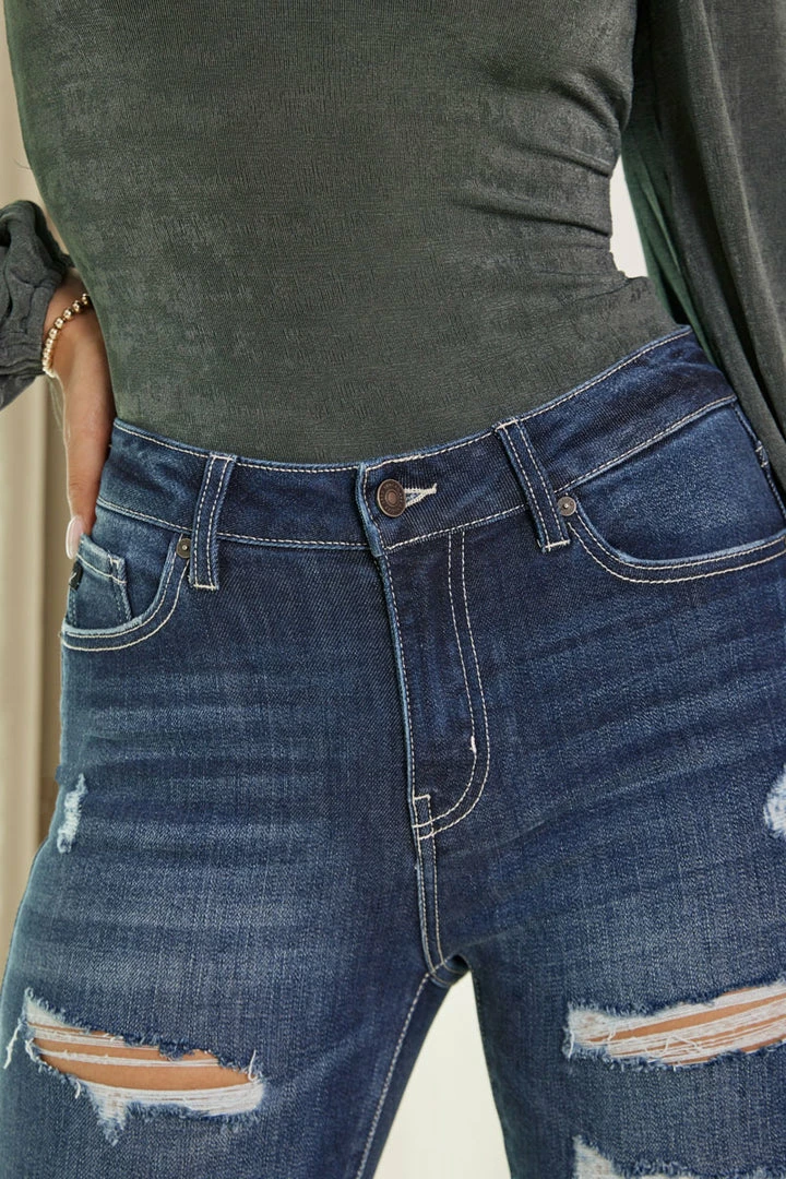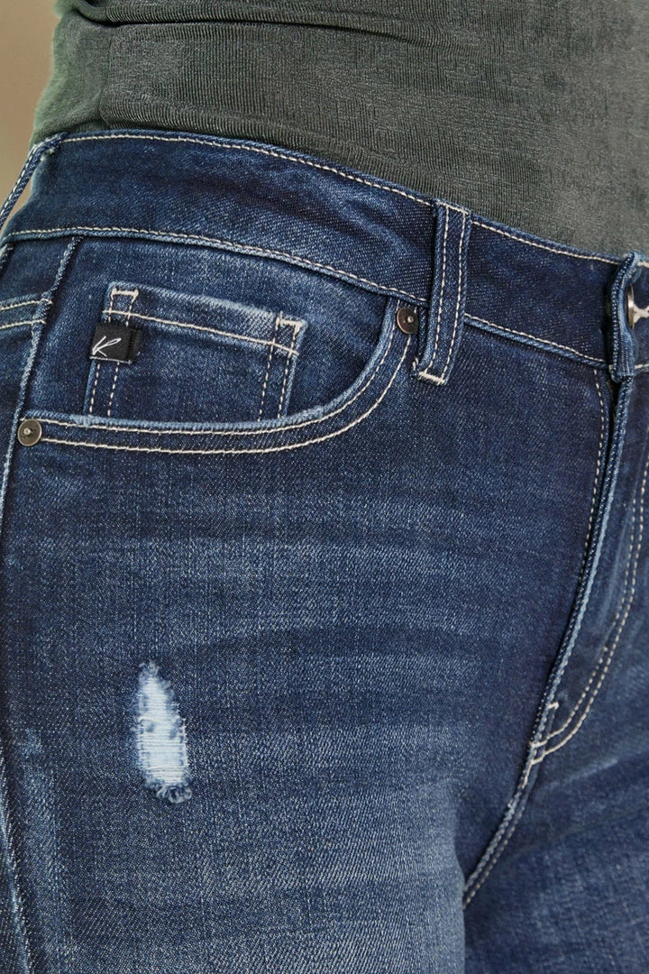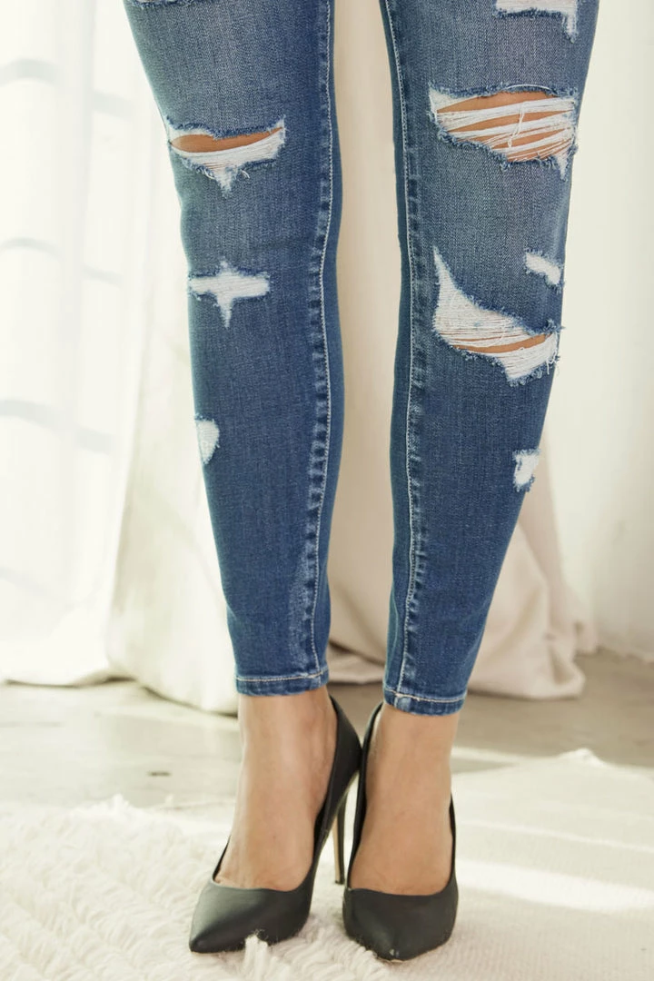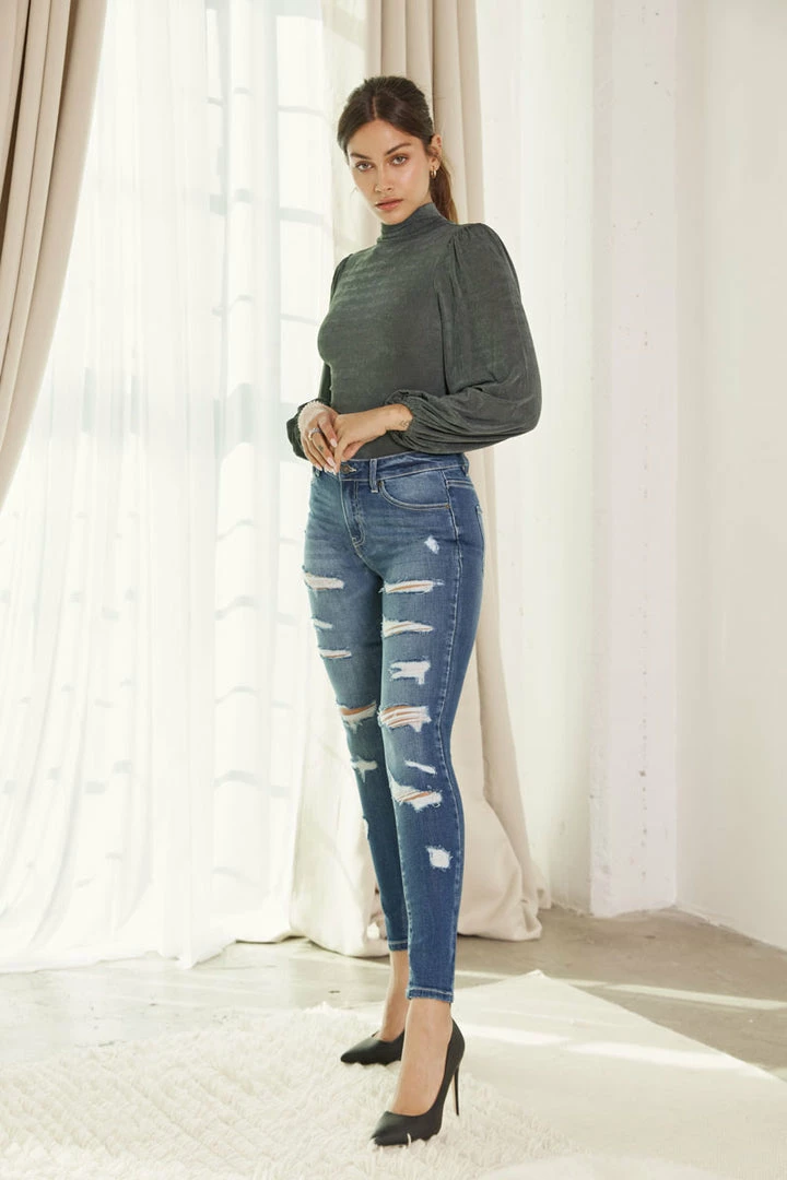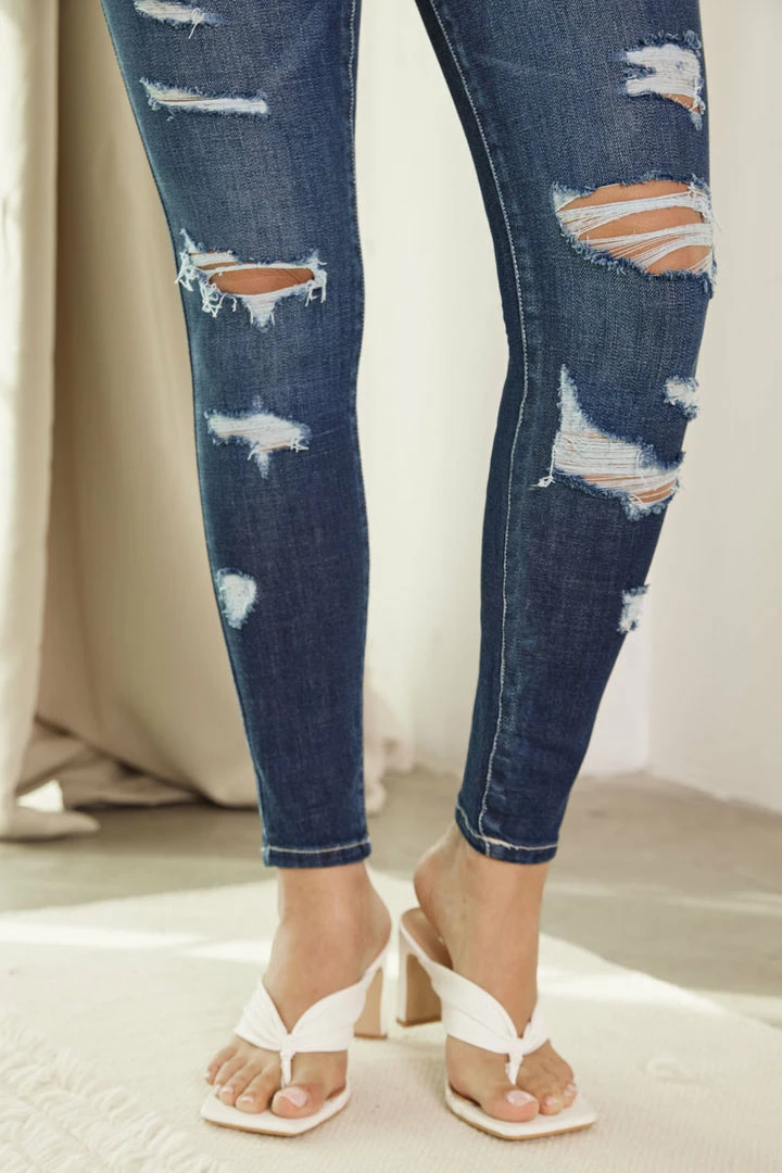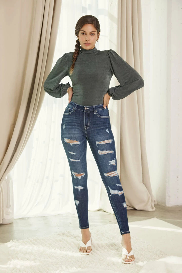Our Monroe High Rise Jeans come in a super skinny cut with a specialized curvy fit featuring moderate destruction in both a dark and medium wash tone. Sits above the natural waistline as it tapers down the leg creating a skin-tight look that hugs your every curve. Made with stretch denim that is flexible, breathable, and won’t bag out after wear. Features a classic five-pocket design, single-button front, and zip-fly closure.