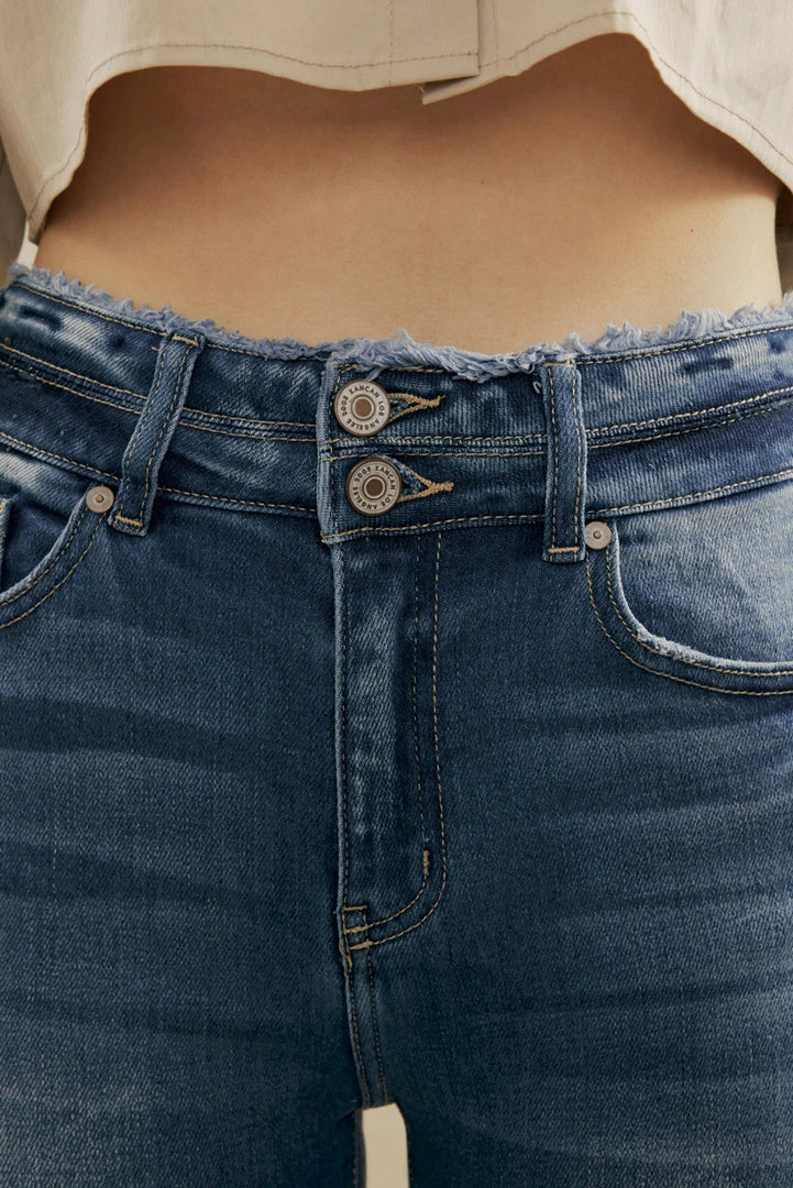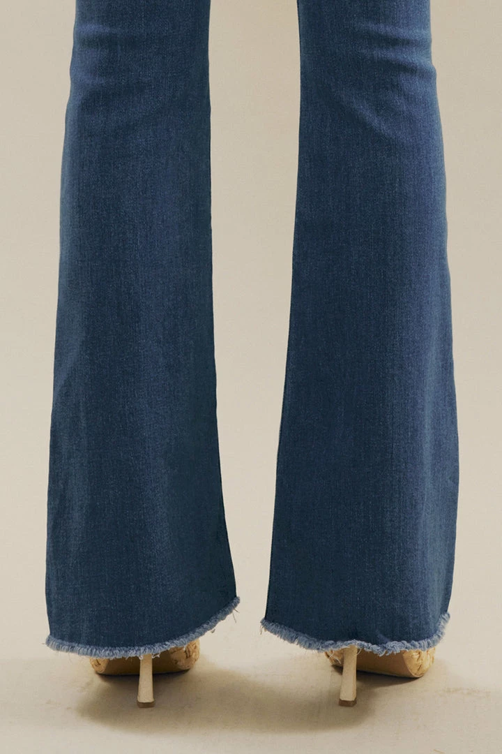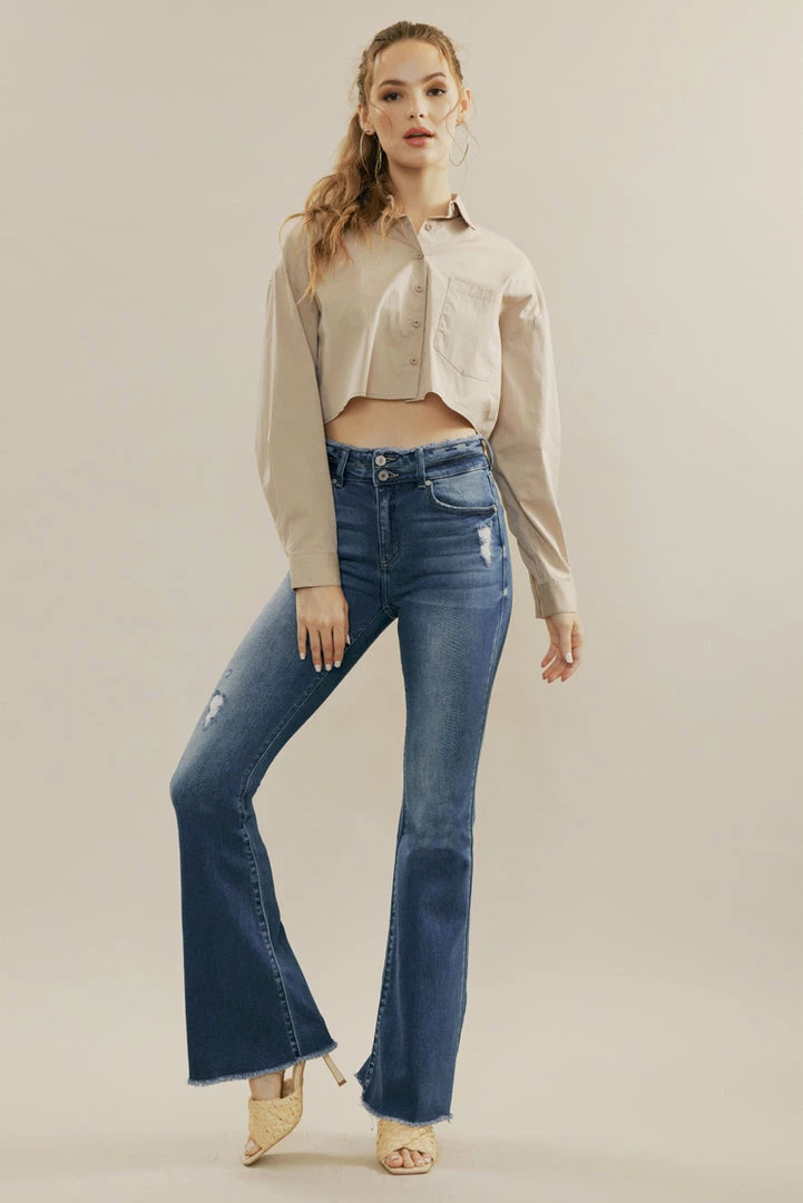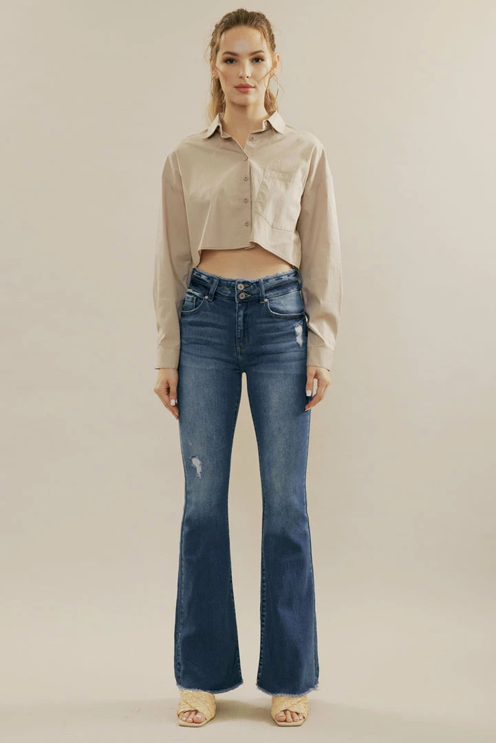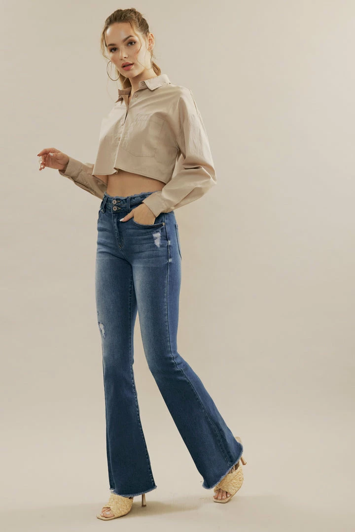 Elongate your legs and accentuate your body with this pair of high-rise flared jeans featuring distressed detailing, whiskering, fading, unfinished hems, double button closure with a zip fly, contrast stitching, and a 5-pocket design.Â