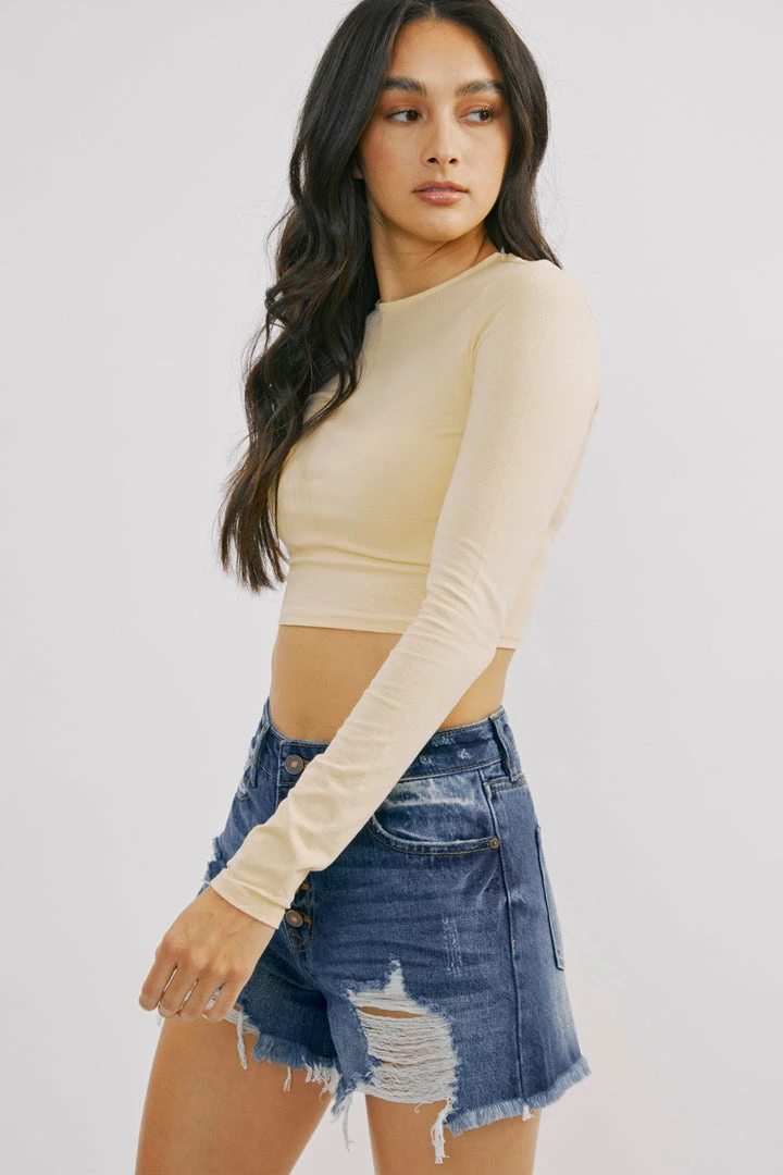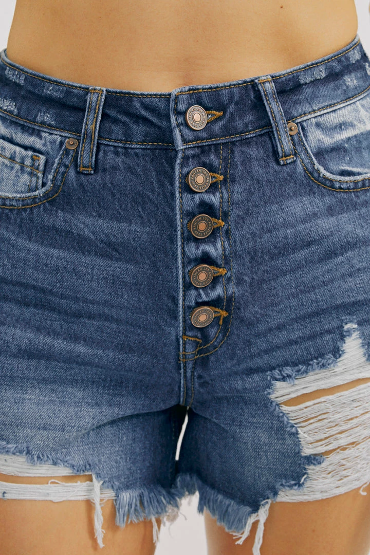 Our Aurora High Rise Mom Shorts is a must need to your outfit. These dark-washed shorts are complete with medium distress and raw frayed hem to give it an edgy look. The mom shorts sits right above the waist and shows off your curves. Features a 5-button front closure and classic 5-pocket style.Â