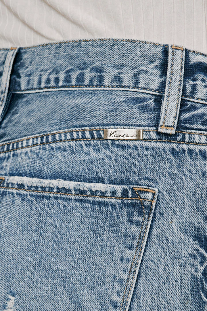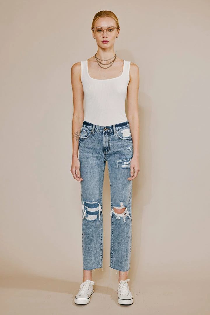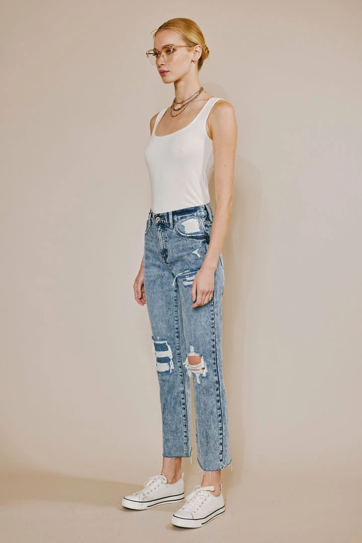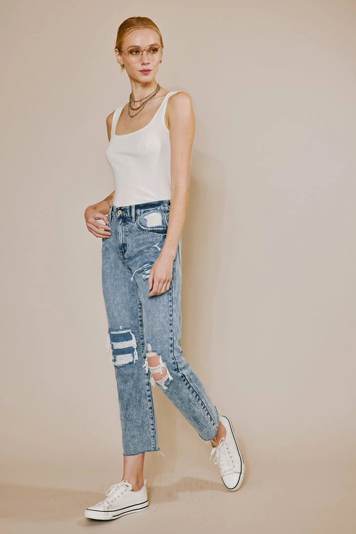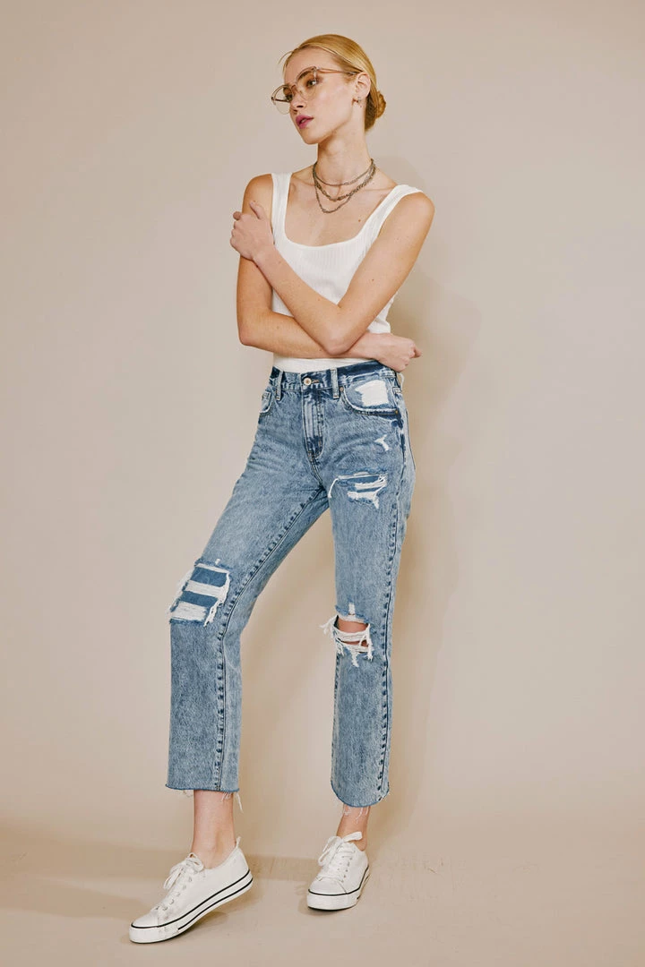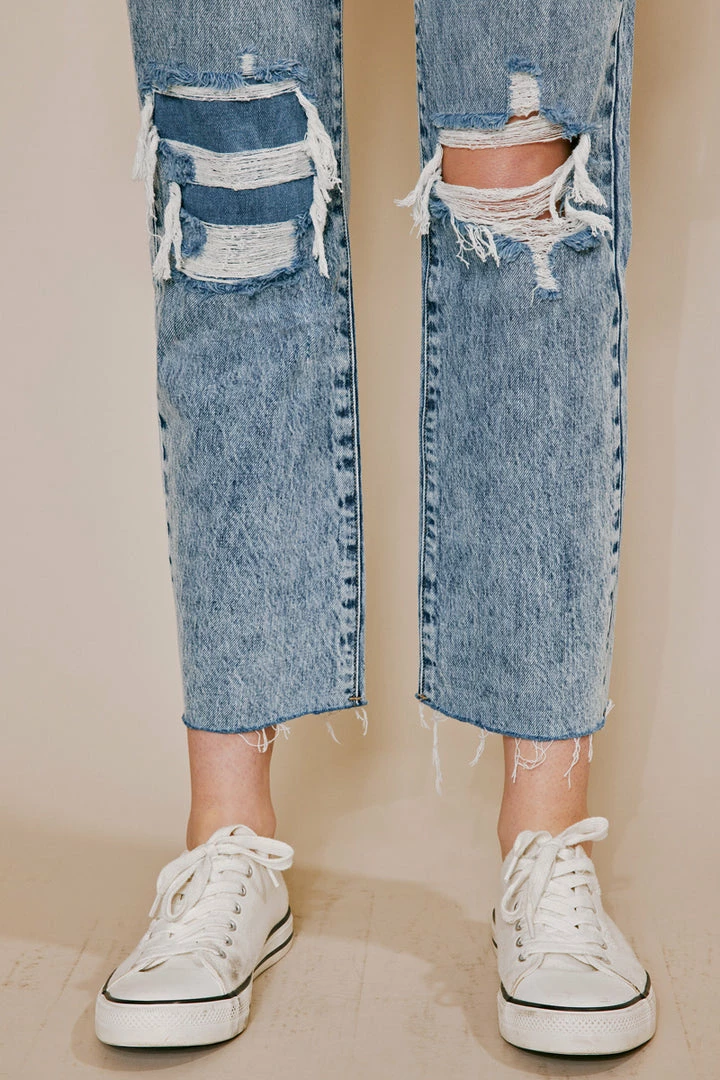 Our Chesney High Rise Straight leg jeans come in an acid wash with optimal destruction and patch detail. Comes in rigid non-stretch denim for the ultimate classic denim look along with a raw hem for a more lived-in look. Features a single button-front and zip fly closure.Â
