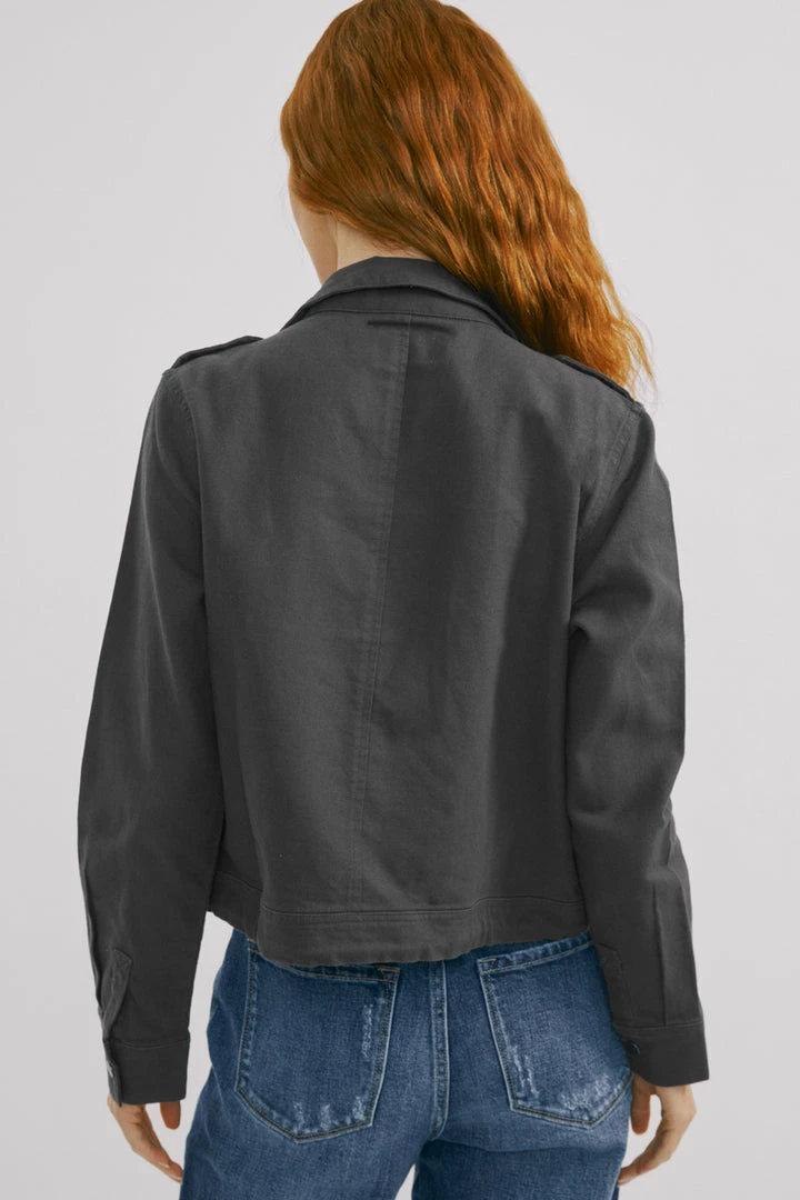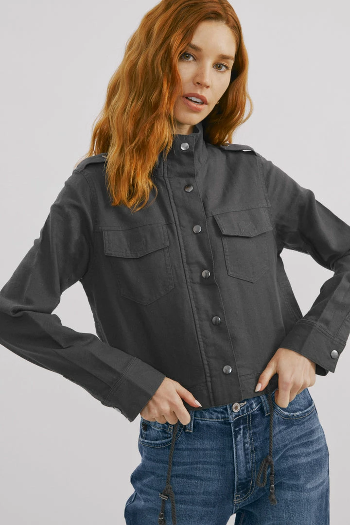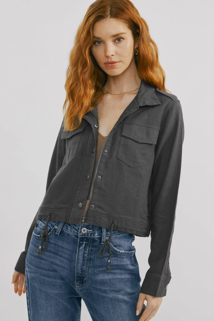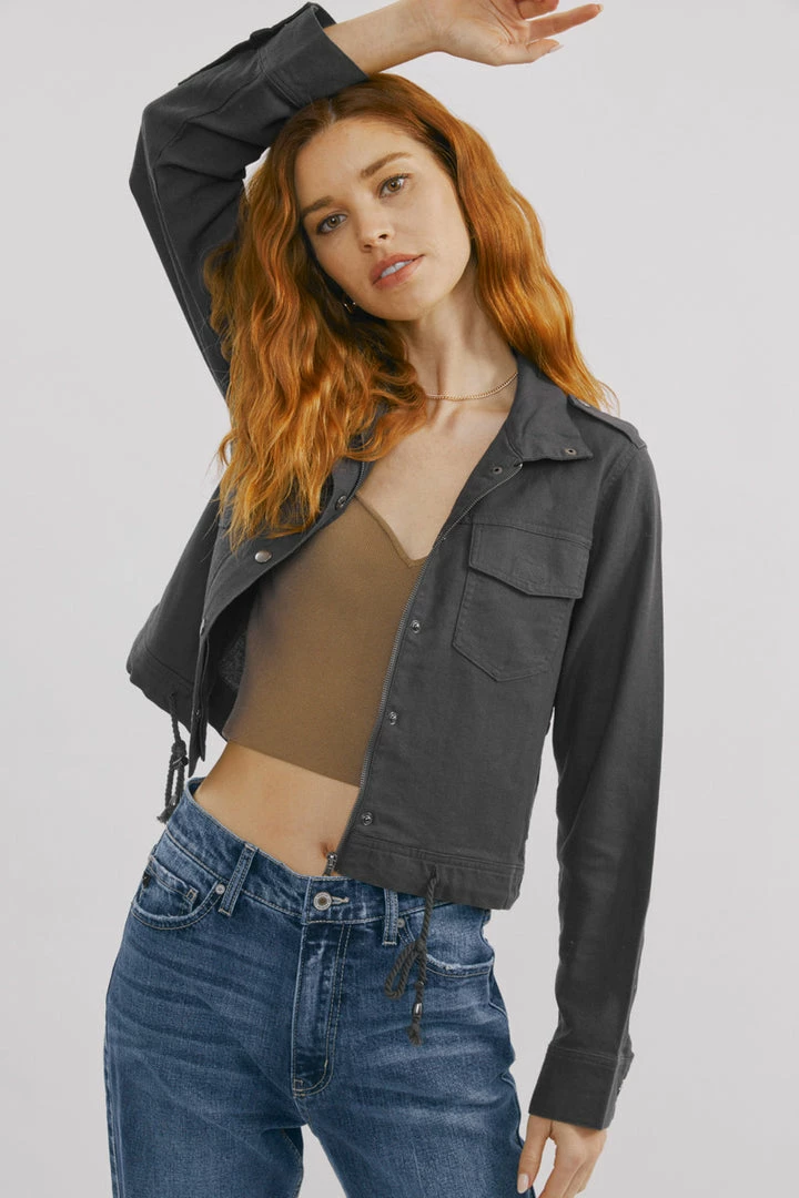 Our cyclone utility jacket is an edgy fun piece to layer with all of your favorite tops. It comes in a solid dark grey wash made with non-stretch denim that looks and feels authentic. Features a drawcord with a stopper at the bottom, patched pockets at the chest, and exposed snap buttons.