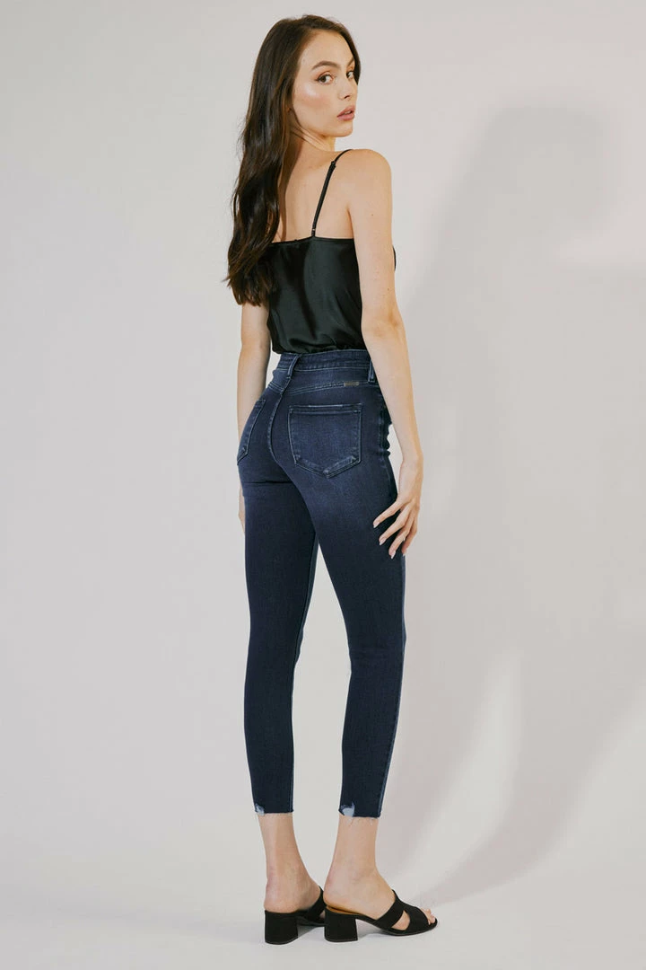 Our Evangeline High Rise Jeans come in an ankle skinny fit in a faded dark blue wash, whiskering, and subtle distress detailing. It comes with a raw hem that gives it a more rugged chic look. Sits above the natural waistline as it tapers down the leg creating a figure-flattering silhouette that’s perfect for dressing up or down. Made with smooth stretch denim that allows you to move with ease without bagging out after each wear. Features a classic five-pocket design, single-button front, and zip-fly closure.