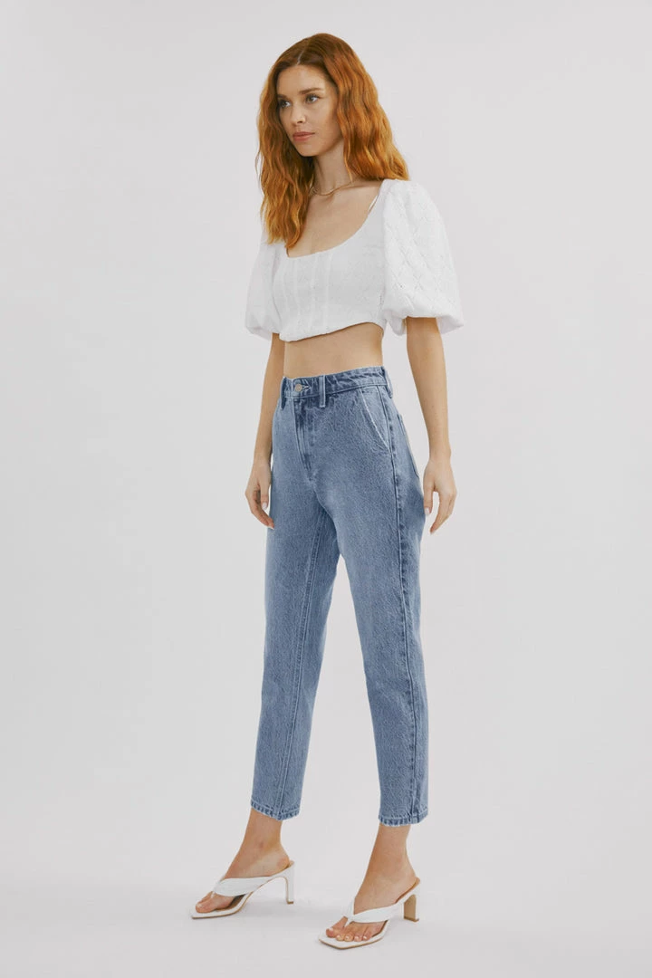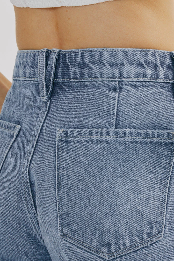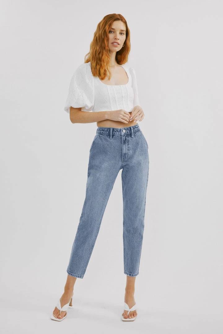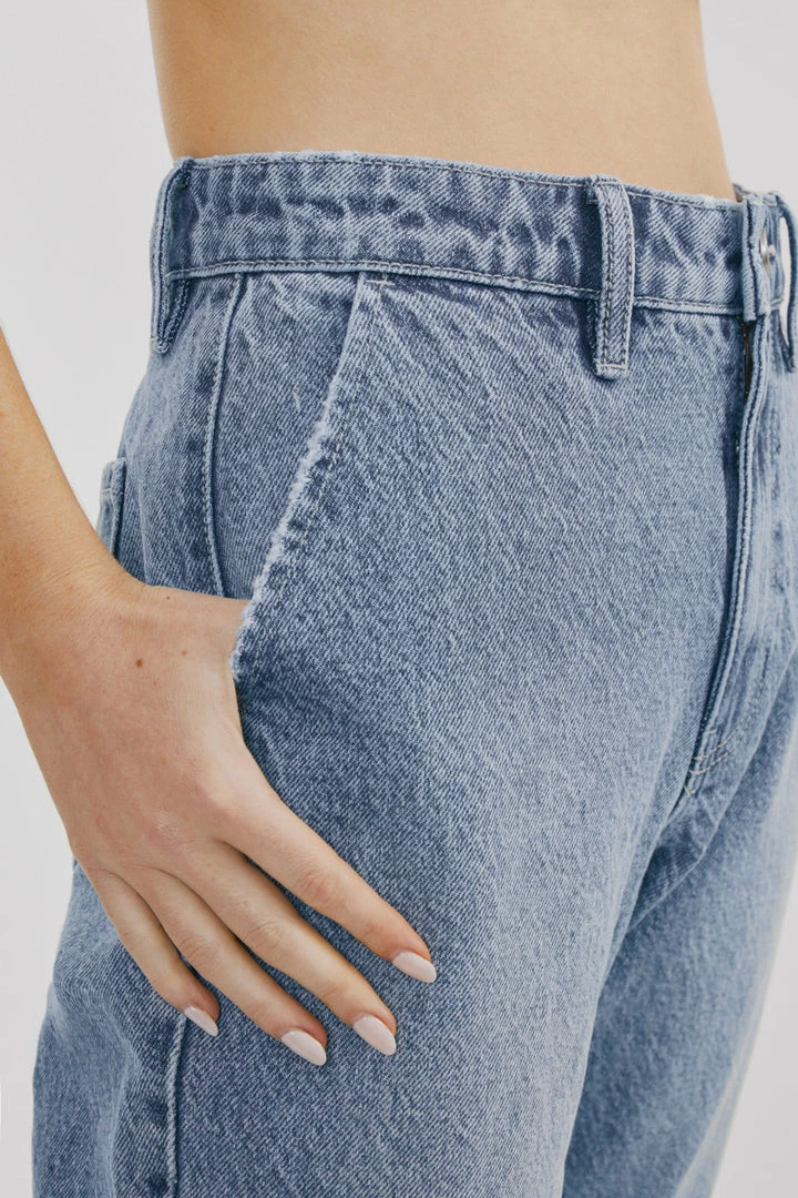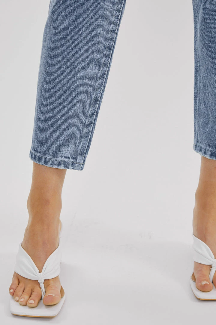 Our Hartford mom jeans come in a faded medium wash style that sits high above the natural waistline as its fit relaxes through the thigh and leg coming together with a tapered fit at the bottom. Comes in a rigid denim fabric with a classic 5-pocket design, single-button front, and zip-fly closure.