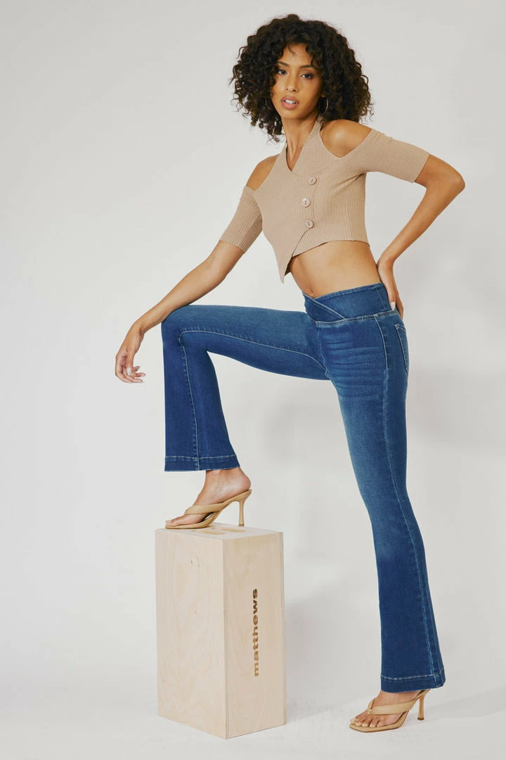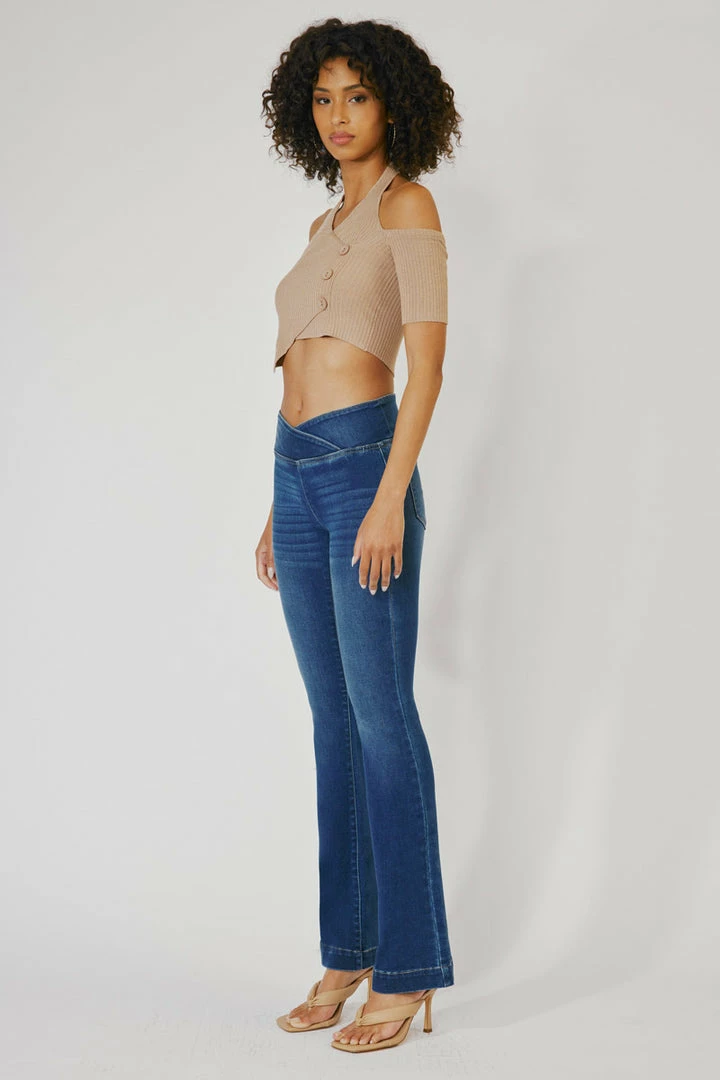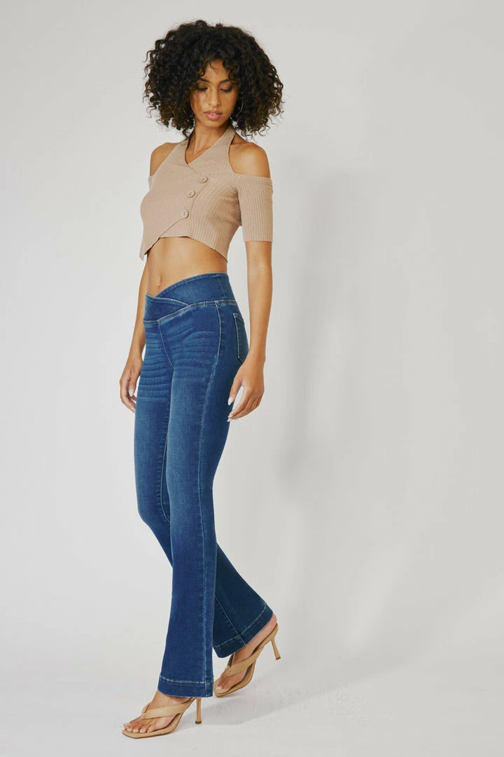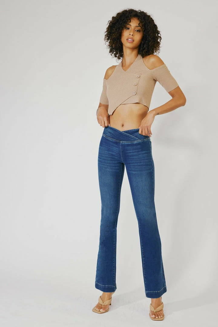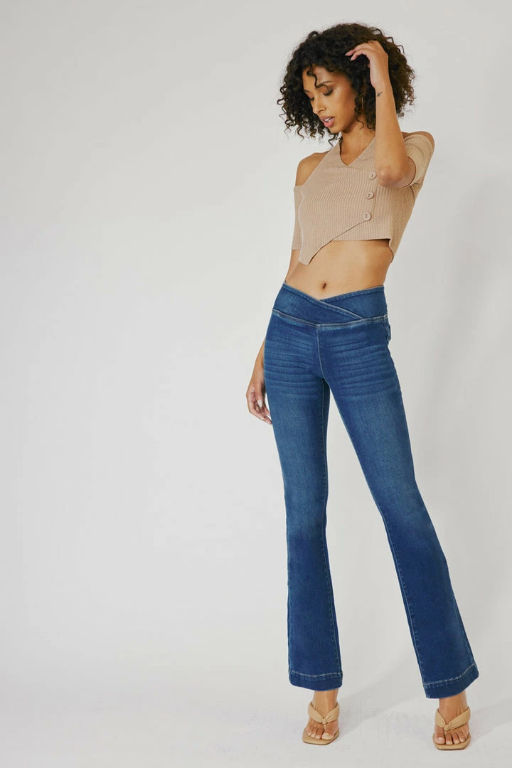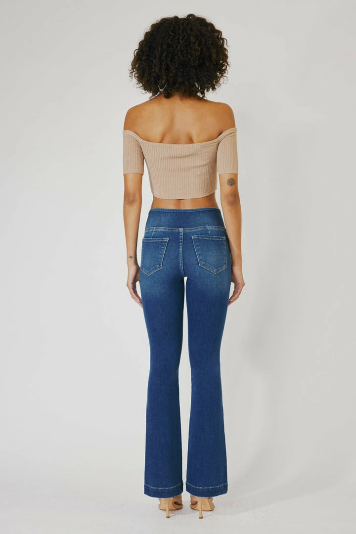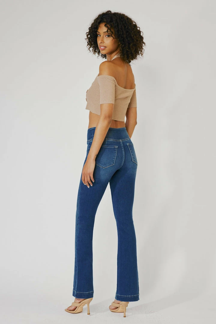 Who said you can’t be fashionable and comfortable. Say hello to our Jolie bootcut jeans where fashion meets comfort with its elastic pull-up waistband and stretchy denim blend. Features a wide hem, back dart detail, whiskering, fading, 2 back pockets, and a v-shaped pull-up waistband.Â