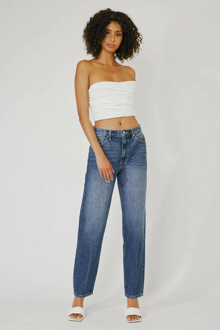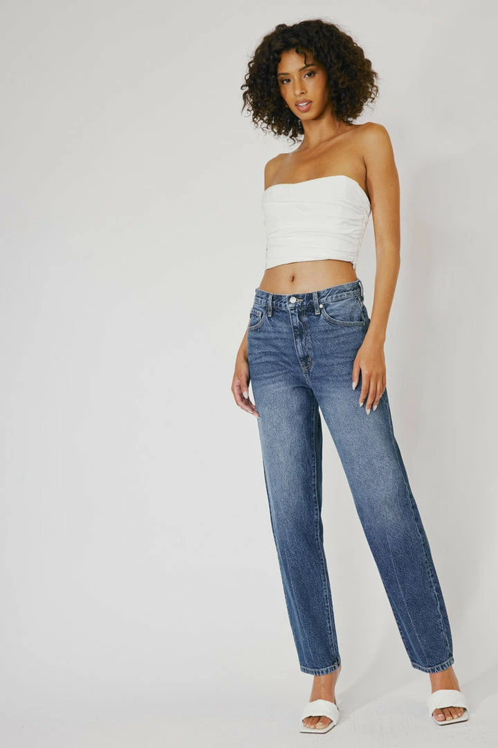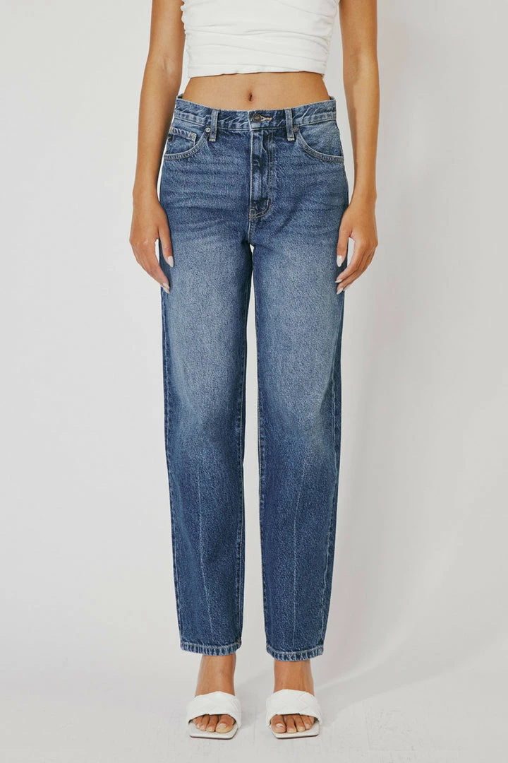 Our Kayn High Rise jeans come in a classic dad jean fit. With a slightly dropped crotch design and straight leg fit with slight tapering that gives a comfortable and stylish look. Made with lightweight non-stretch denim that moves with your body as it maintains its shape even after multiple wears. Features a classic five-pocket design, single-button front, and zip-fly closure.