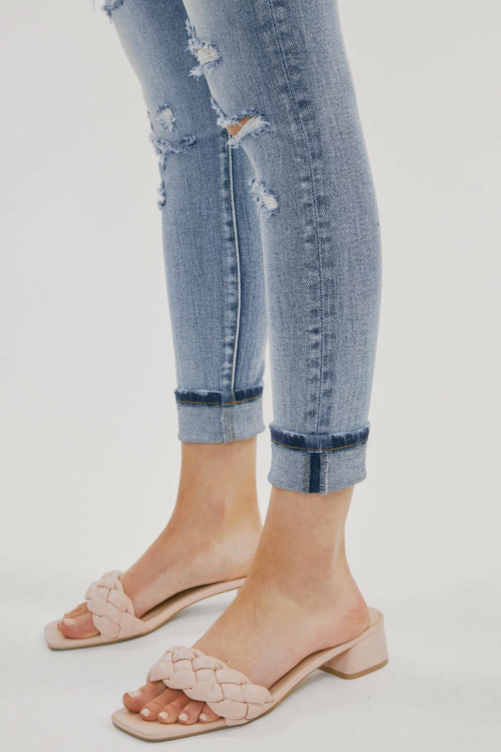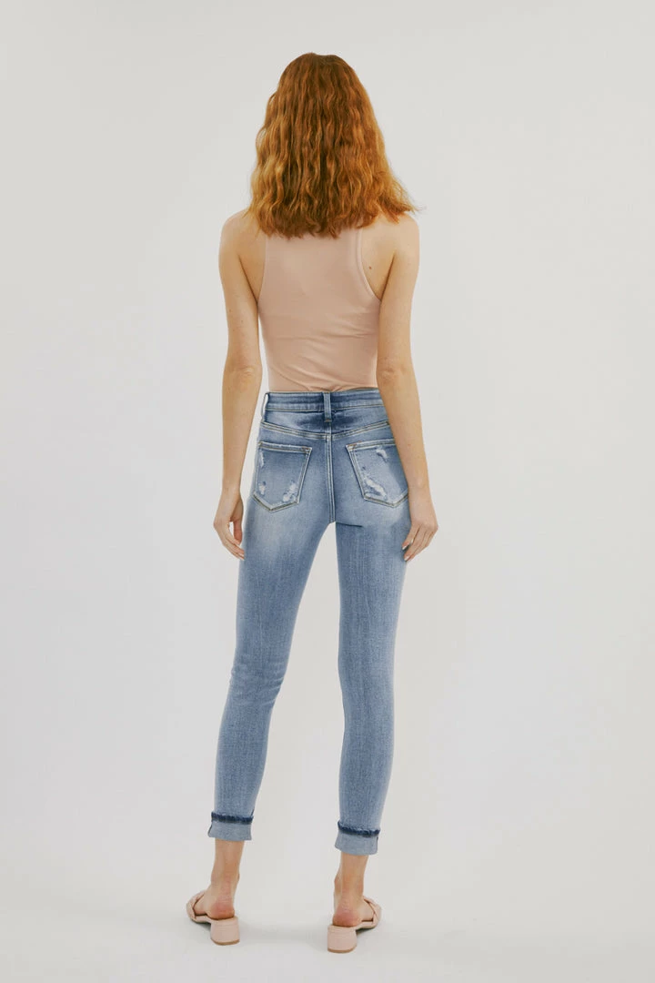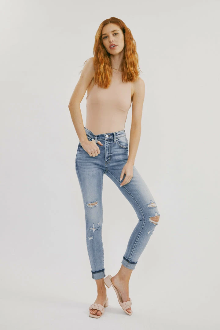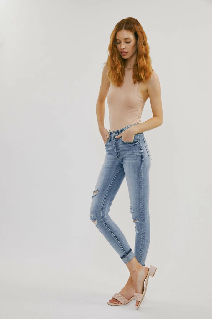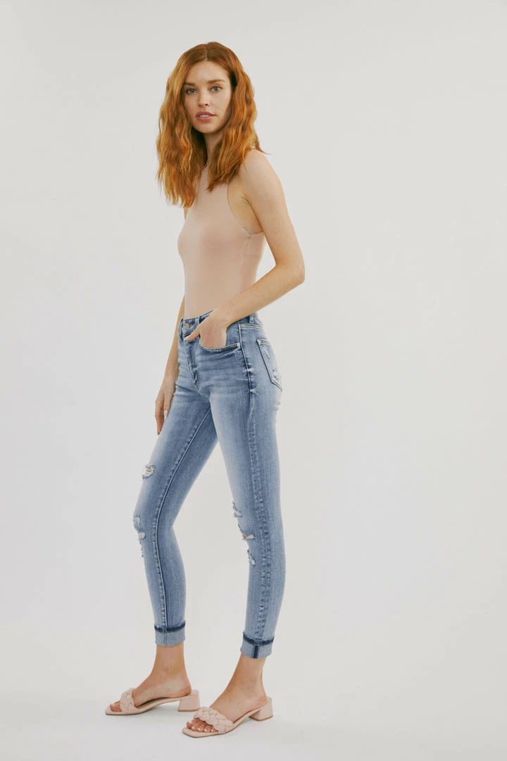 Our Keigan High Rise Jeans come in a classic ankle skinny cut with mild destruction and a cuffed hem in a faded blue wash. Sits right above the natural waistline as it tapers down the leg creating a skin-tight silhouette that enhances your figure. Made with comfortably soft stretch denim that gives you a butter-soft feel and flexible fit. Features a classic five-pocket design, single-button front, and zip-fly closure.