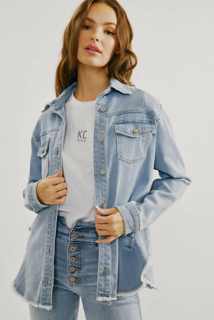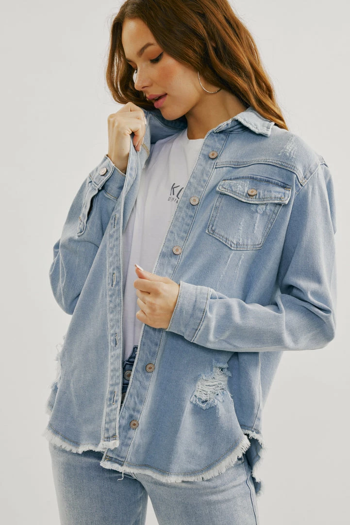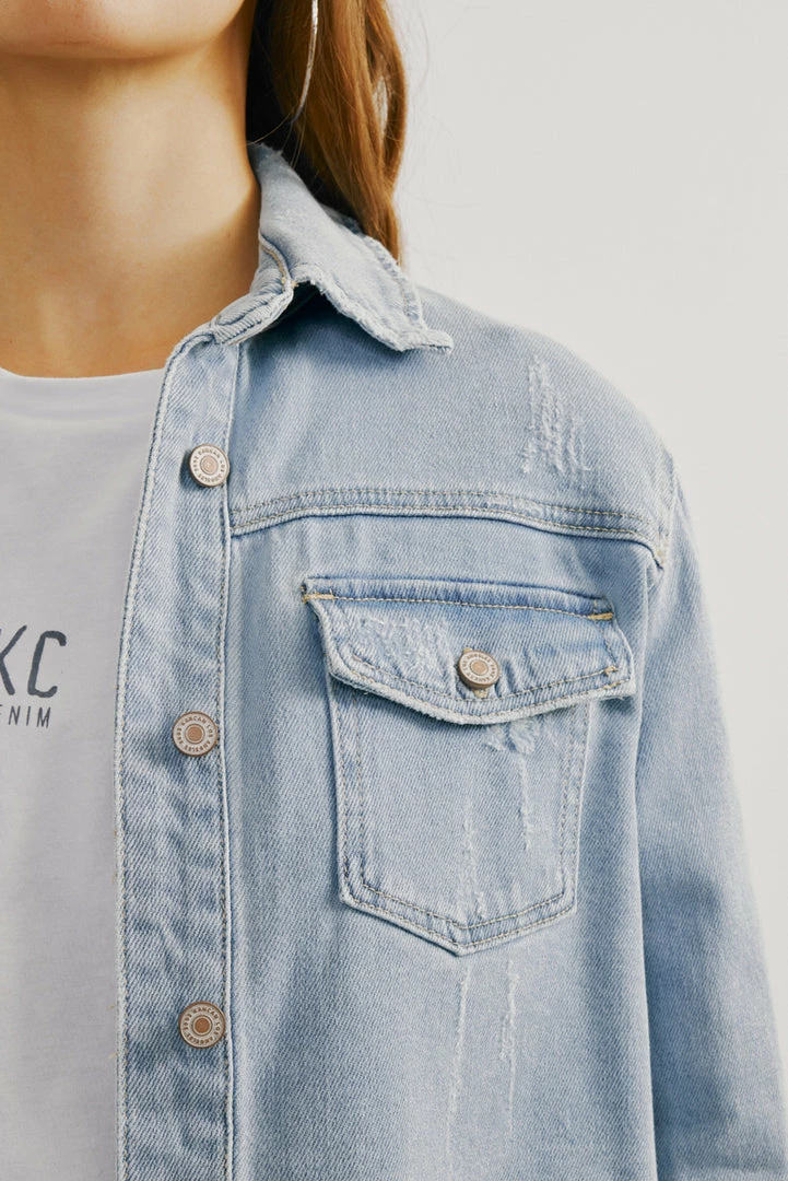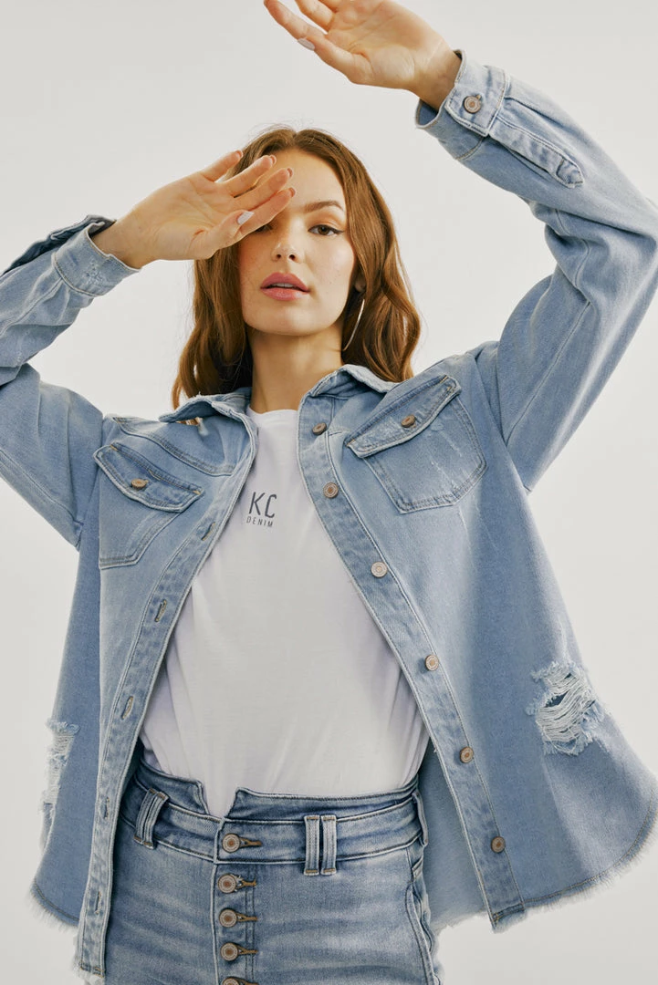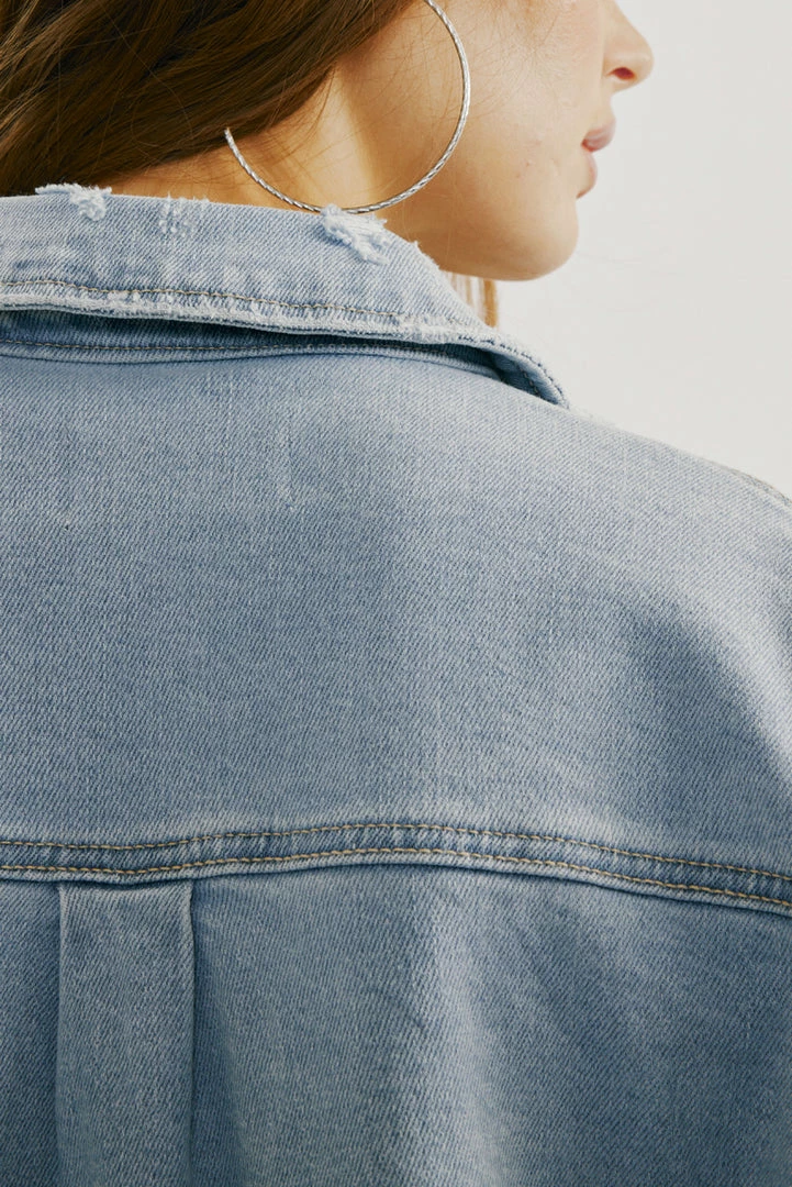A light-washed denim jacket with just the right amount of edge and distress. Our Lori Denim Jacket comes with a frayed hem perfect for layering on basic tops to create a chic and cool look. Accented with silver-colored hardware for an added luxe look. Features a basic collar, button-down closure, and two chest pockets.