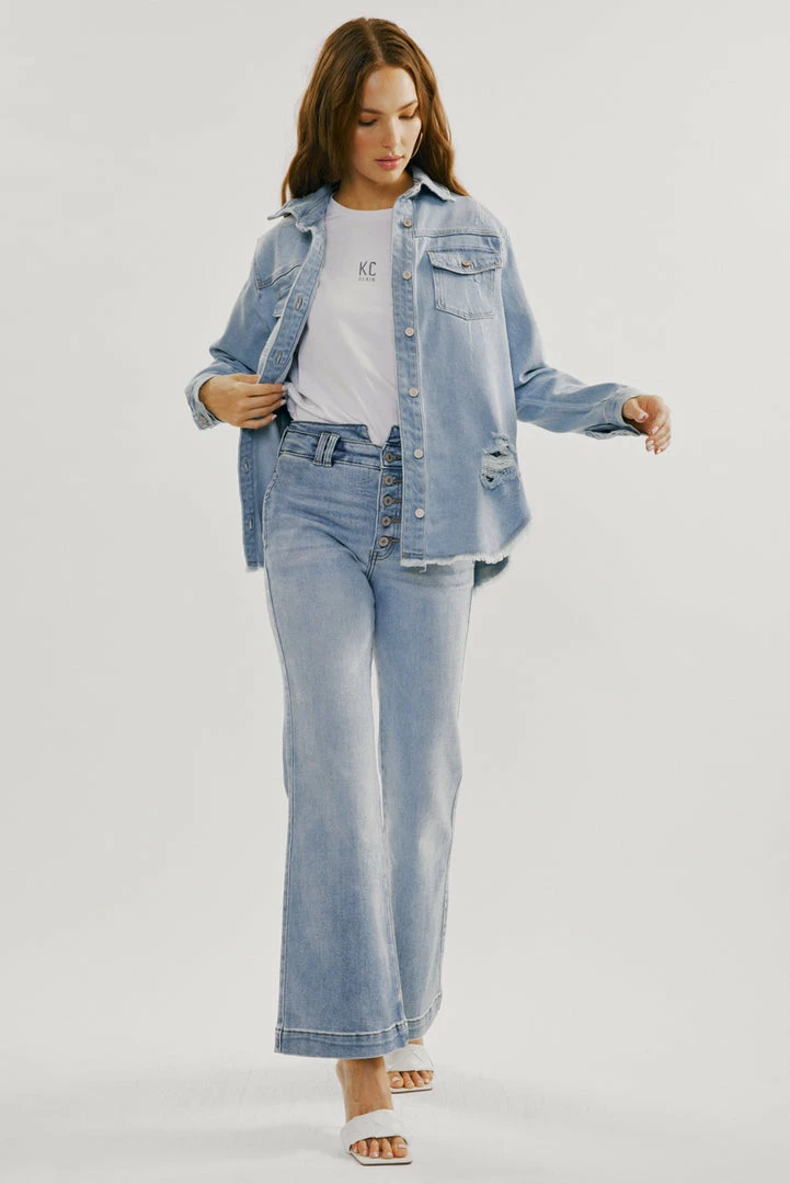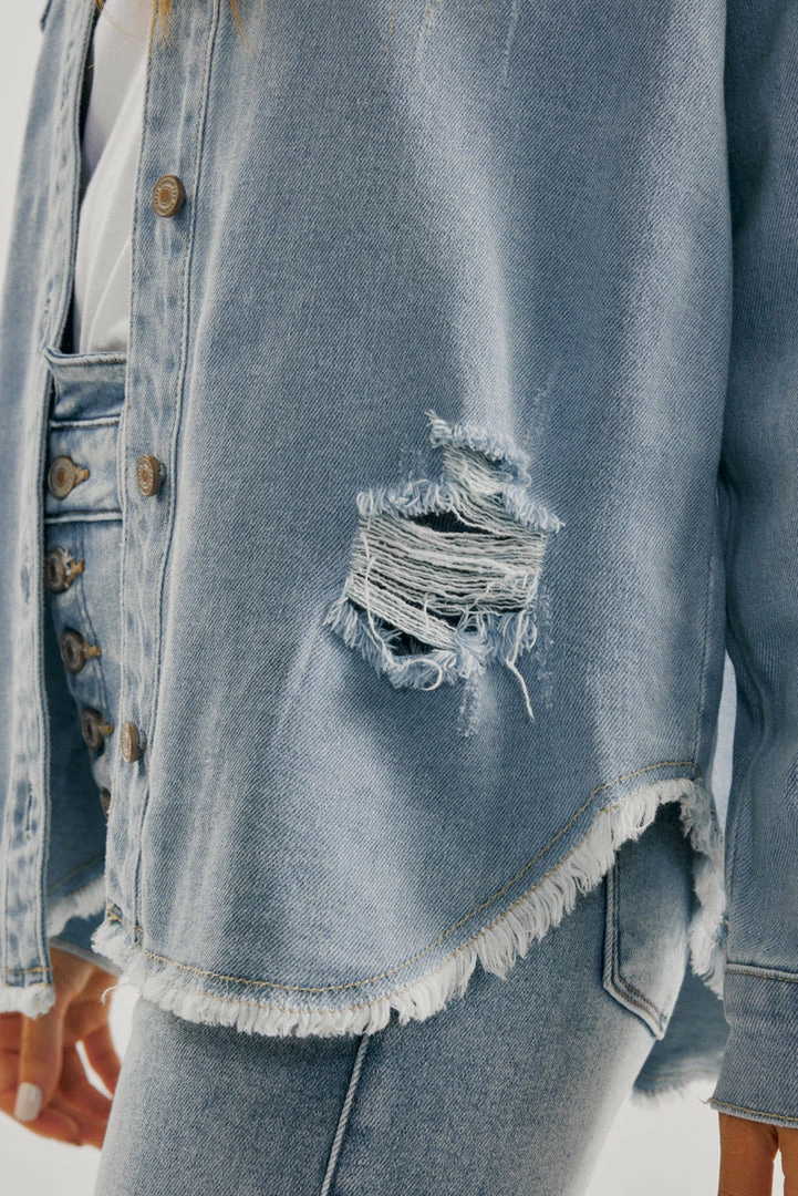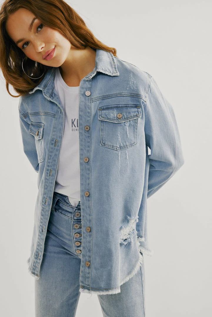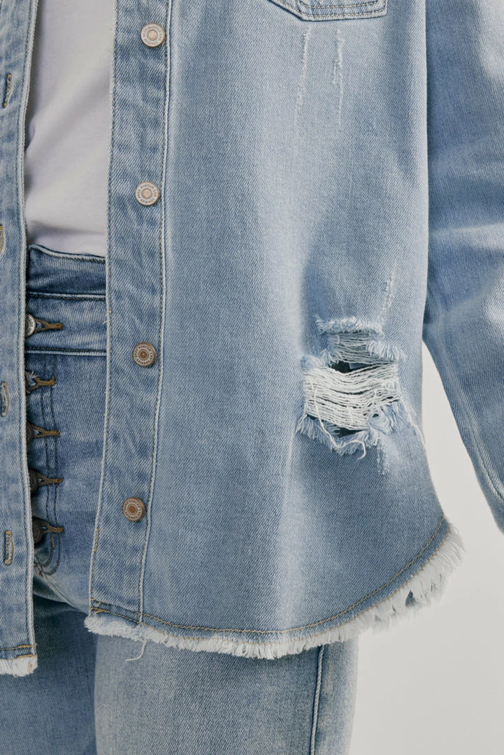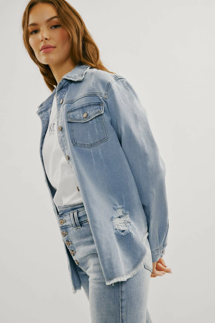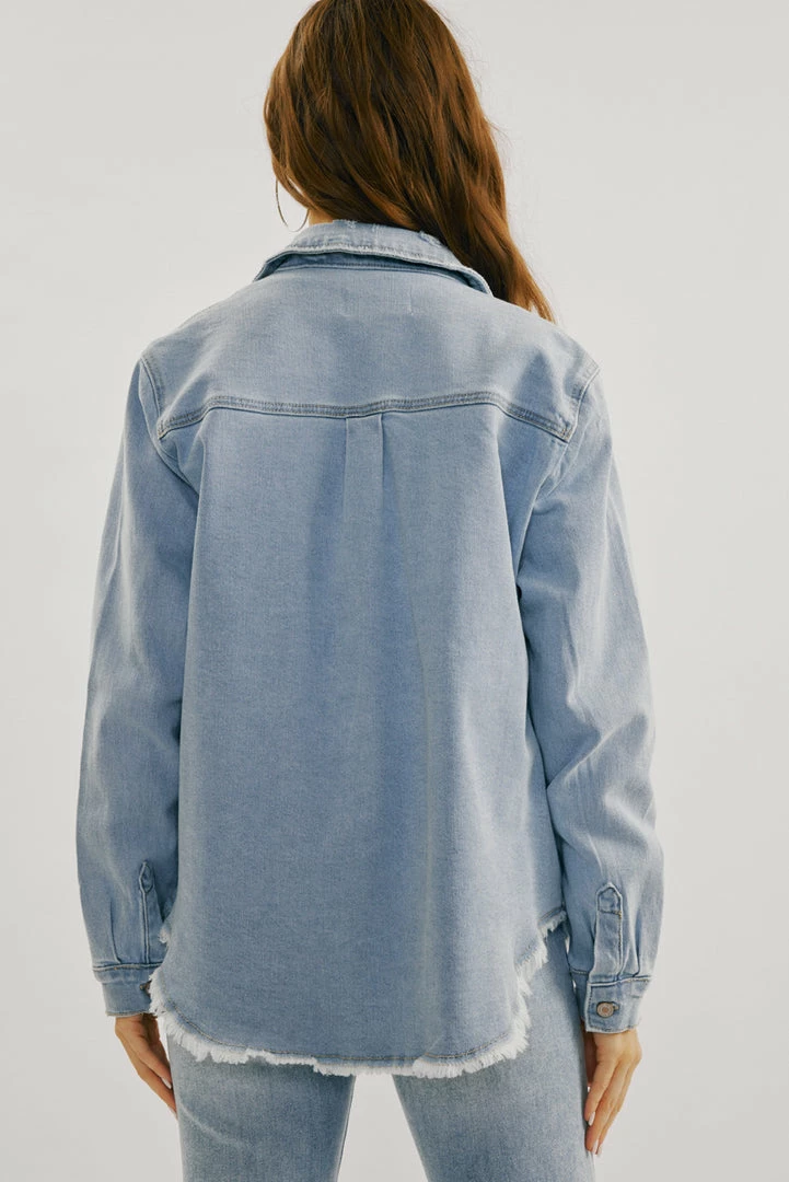 A light-washed denim jacket with just the right amount of edge and distress. Our Lori Denim Jacket comes with a frayed hem perfect for layering on basic tops to create a chic and cool look. Accented with silver-colored hardware for an added luxe look. Features a basic collar, button-down closure, and two chest pockets.