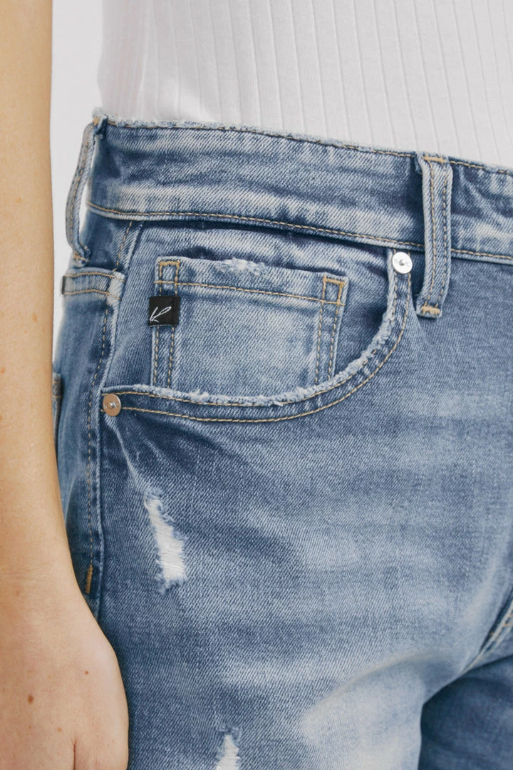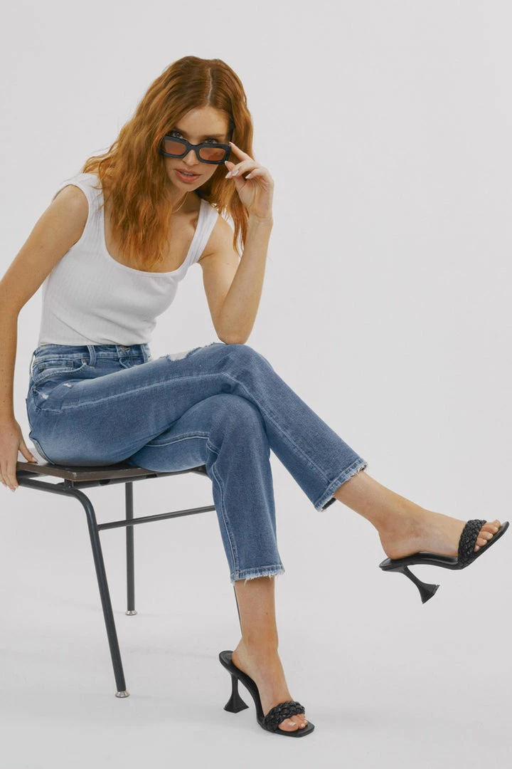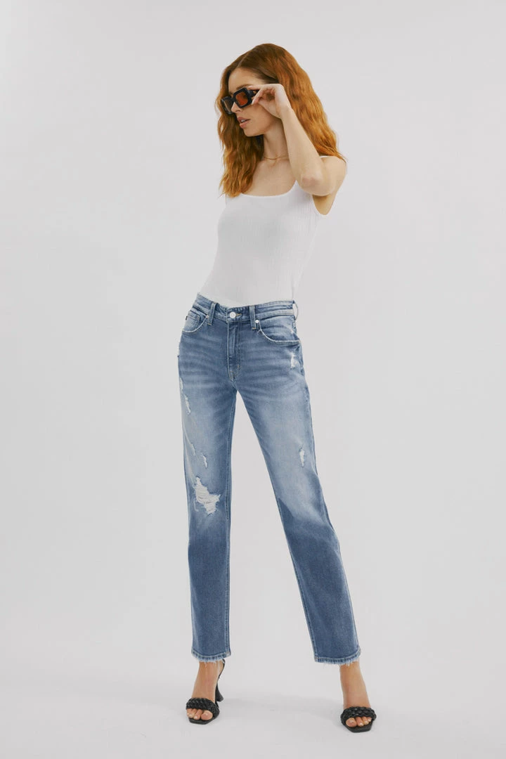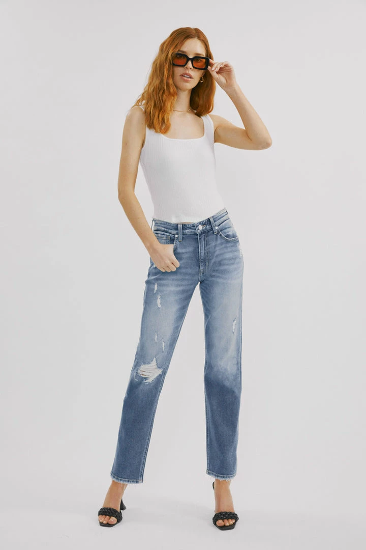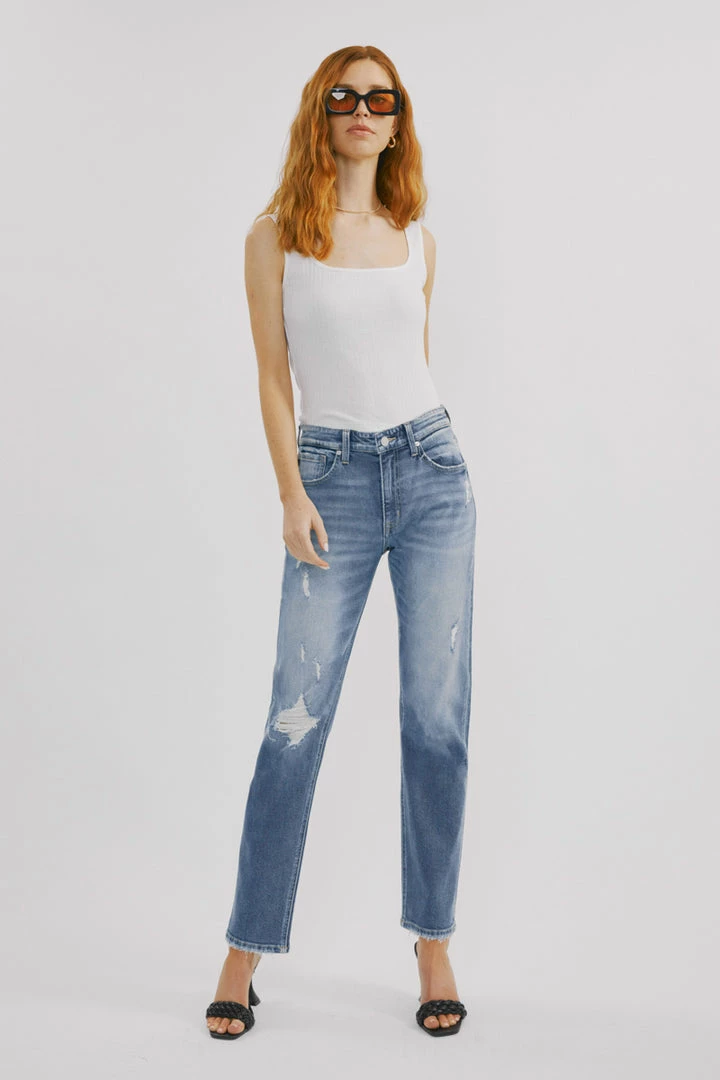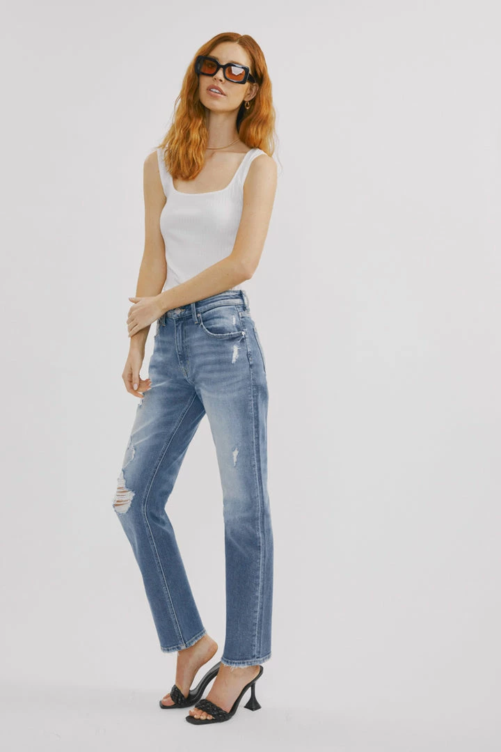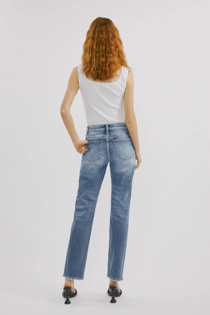 Our Mariko High Rise Slim Straight Jeans come in a classic straight-leg fit with just the right amount of distress. Features whiskering detail on the front and back of the knees along with a beautifully fading on medium-washed denim. Comes with a 5 pocket design, single-button front closure, and a zip fly.Â