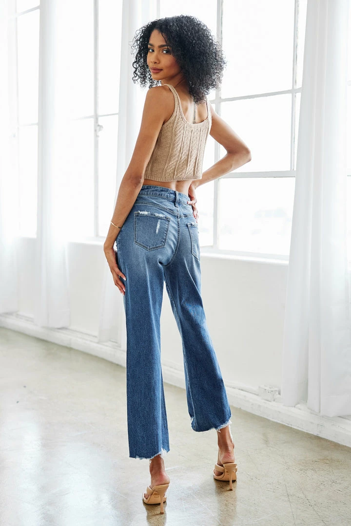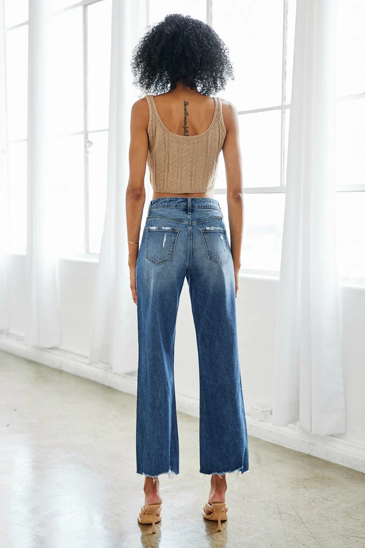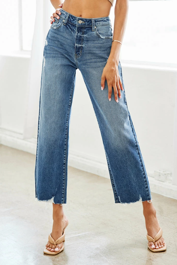 Our Marlin High Rise Wide Leg Jeans are a statement piece for all fashionistas and trend-setters. Let your next baggy wide-leg jeans be these and your closet will not be disspointed. Made with comfort stretch denim that is durable, authentic feeling, and stylish. Features a raw staggered hem, 5 pocket design, single-button closure, and a zip fly.Â