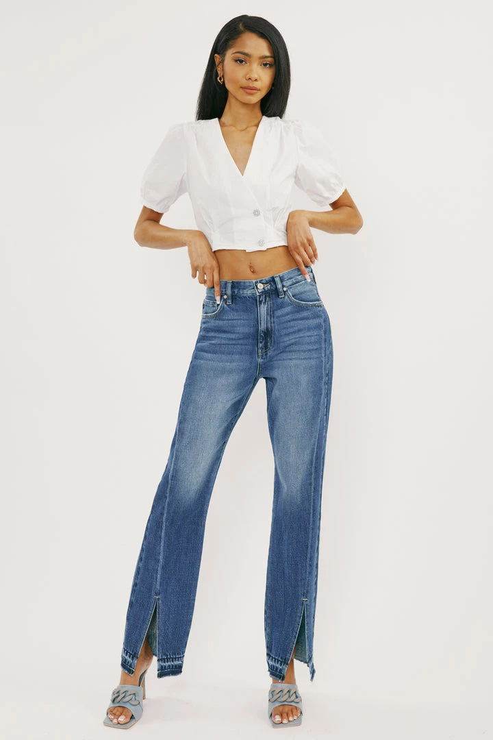 Our Medora 90’s Straight Leg Jeans are a classic quality and stylish denim piece. Sits above the natural waistline and comes in rigid non-stretch denim that is durable and won’t lose its shape after each wear. Features front slits and contrasted hems with a slight fray. Whiskering, subtle fading, a front, and back seam detail, and not to mention an all-around authentic denim look that makes these jeans a must-have. You can’t go wrong with these lightweight comfortable boyfriend jeans perfect for pairing with all your favorite tops. Comes with a classic 5 pocket design, single-button front closure, and zip fly.