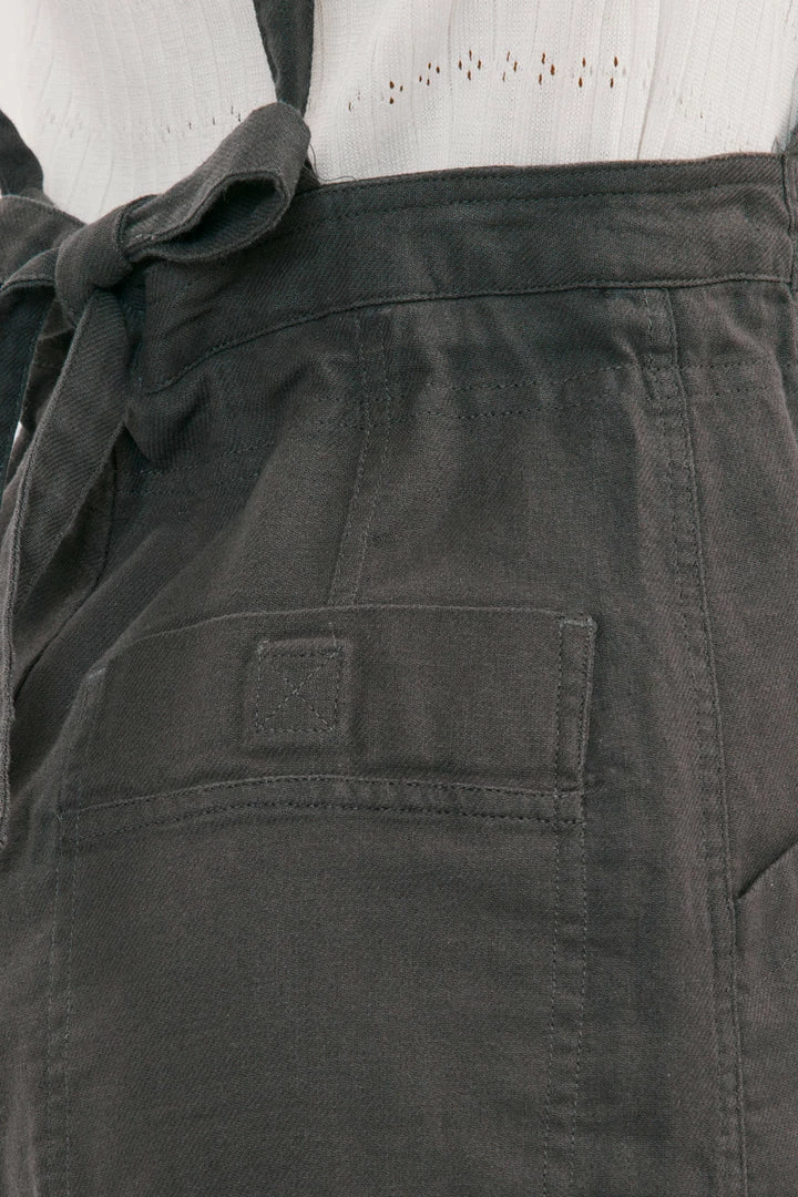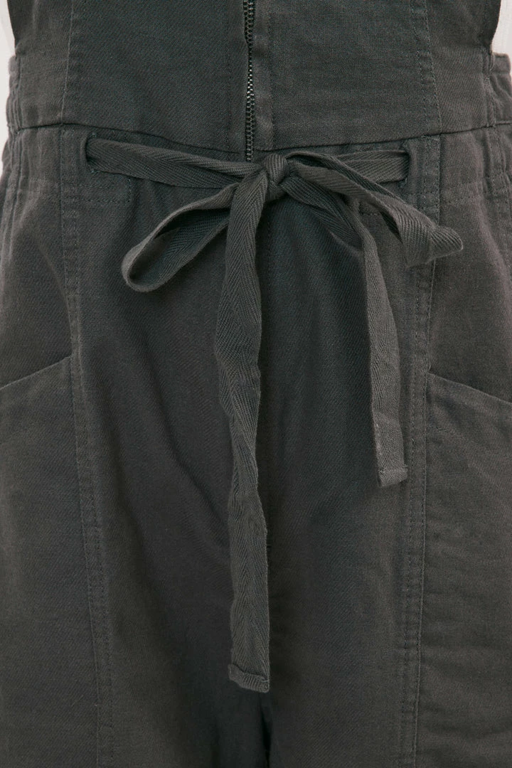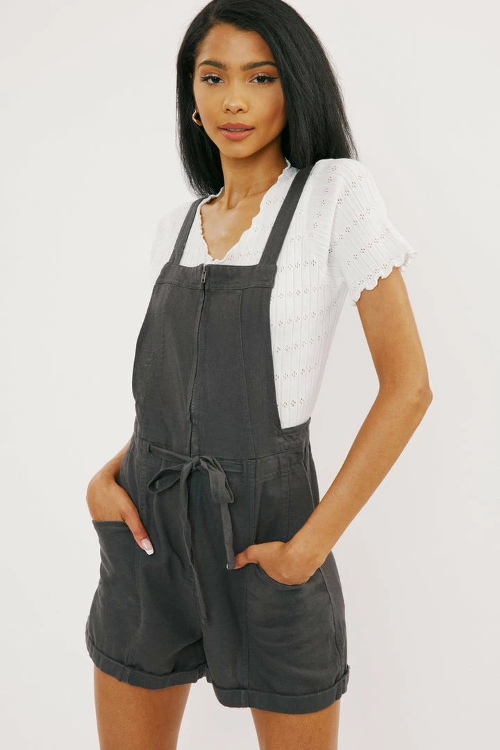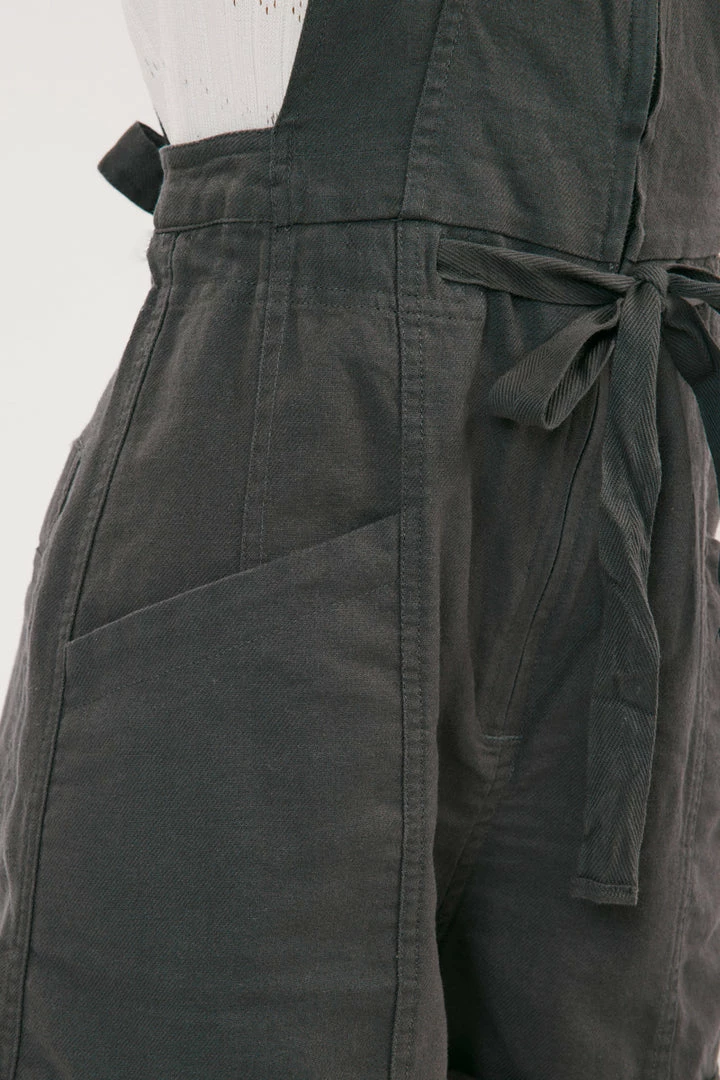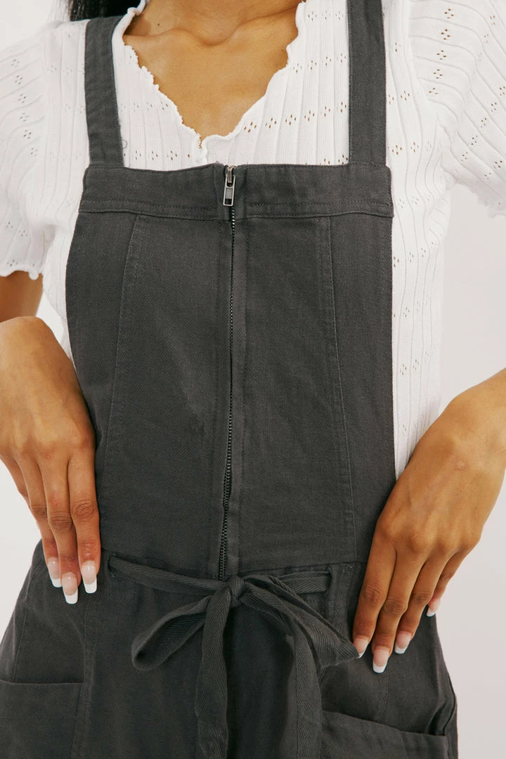 Classic overall shorts in dark grey featuring a zipper closure, and long straps that tie into a bow in the front and back. Comes with 2 front pockets and two back pockets. Our Moxie overall shorts will be an instant favorite and a fun addition to your closet.Â