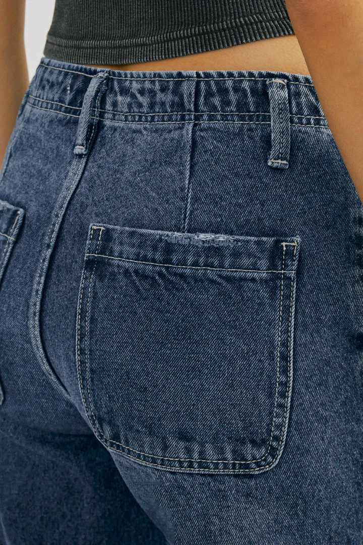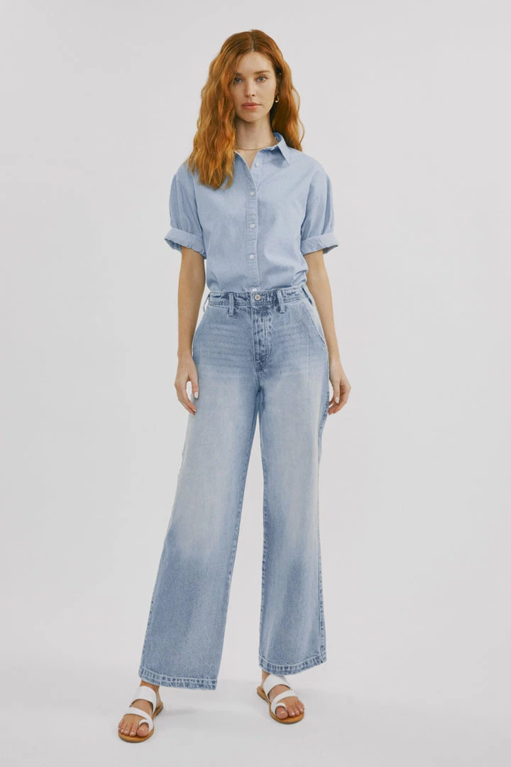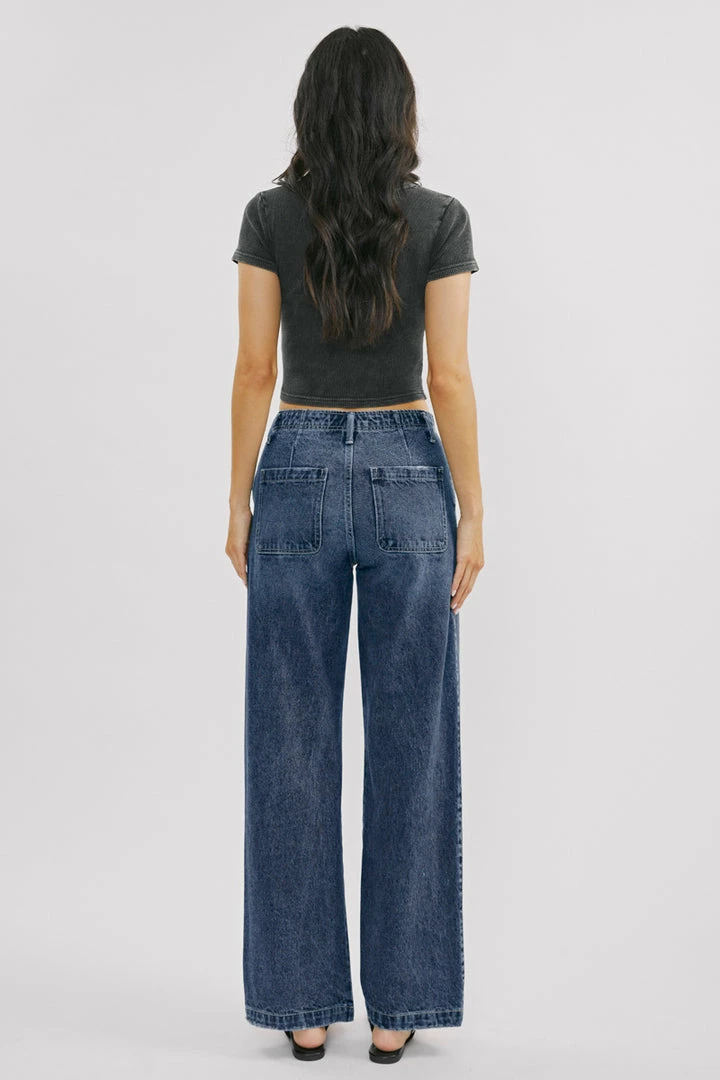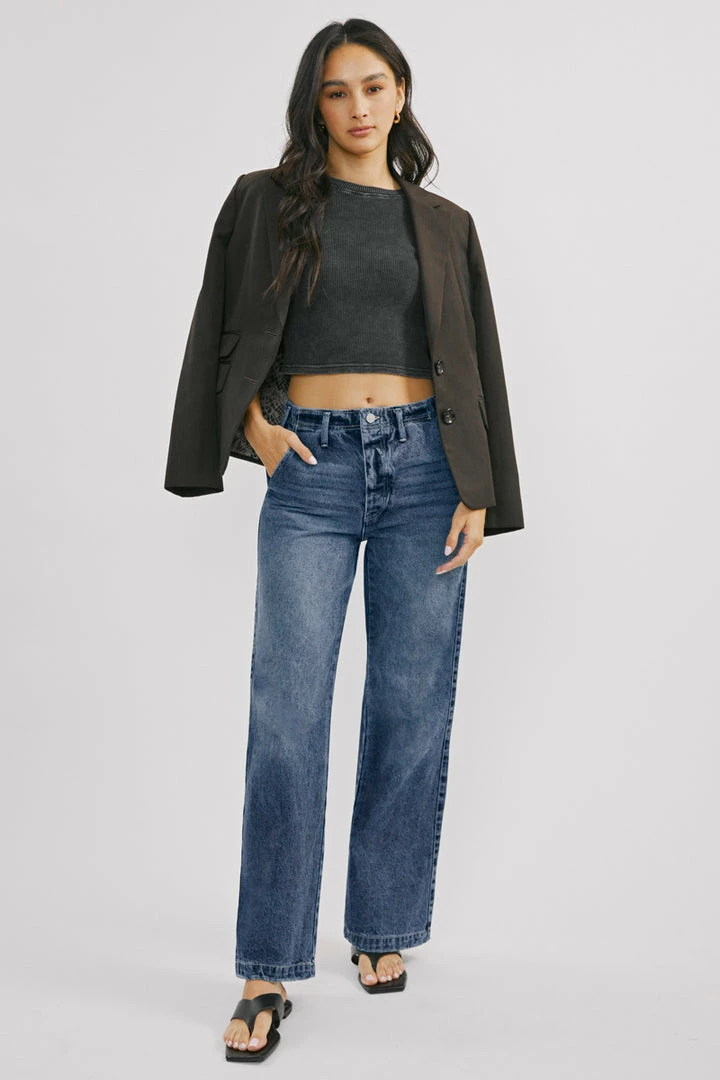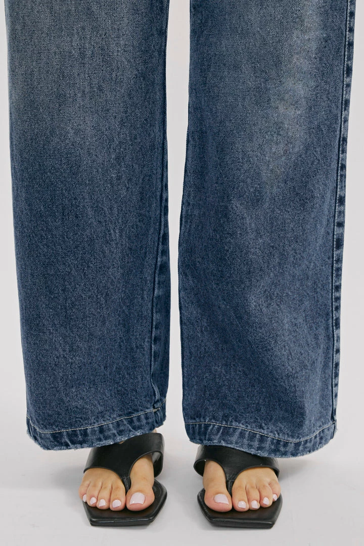 A faded dark and medium wash 90’s wide-leg jeans made with nonstretch rigid denim that is durable and is easy to move around in. Our Sterling jeans are the perfect addition to the 90s collection. It’s breathable, comfortable, and is fashionable. Comes with a 4 pocket design, a single button front, and a zip fly closure.