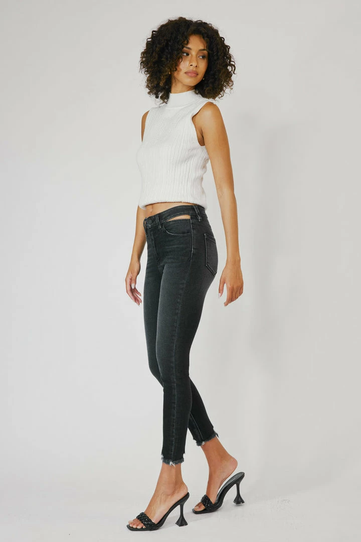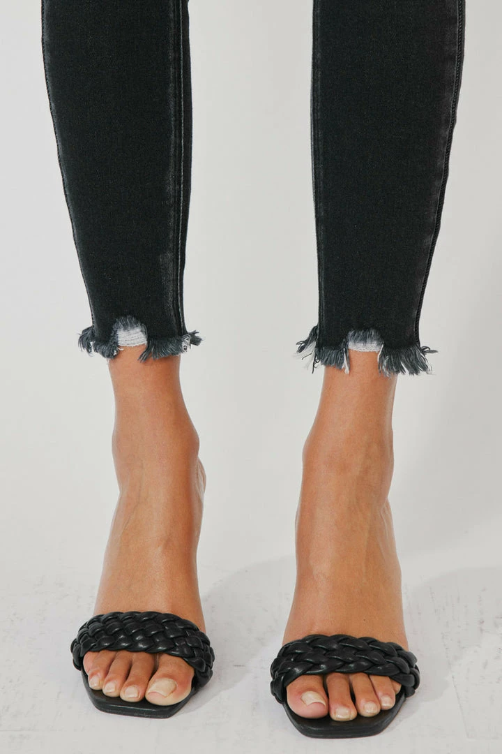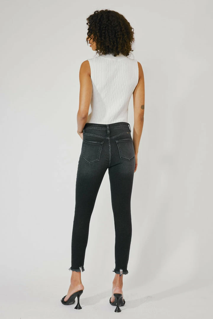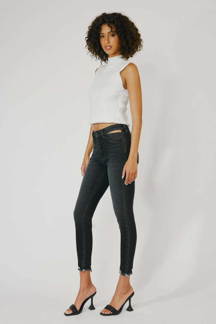 Our Tiara High Rise Jeans come in an ankle skinny cut with a faded dark grey wash, a frayed hem, and subtle whiskering detail. Sits above the natural waistline as it tapers down the leg and hits right at the ankle creating a chic look that’s versatile and stylish. Made with super soft stretch denim that’s flexible and retains its shape even after multiple wears. Features a classic five-pocket design, single-button front, and zip-fly closure.