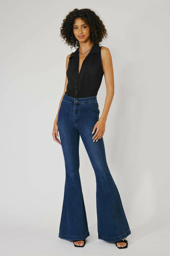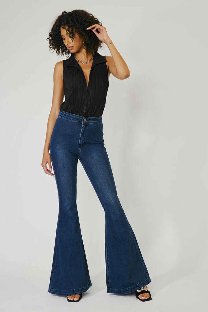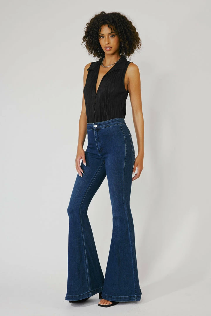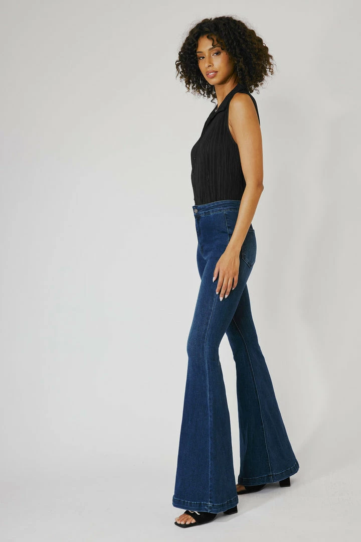 Our Violet High Rise Jeans come in a superflare fit featuring a gently faded wash with whiskering, a smooth front finish, and structured seams at the back. Sits above the natural waistline as it tapers down the leg and begins to flare out at the upper calf creating a flowy silhouette. Made with buttery-soft stretch denim that moves with your body while it maintains its shape after wear. Features 2 big pockets at the back, a single-button front, and a zip-fly closure.