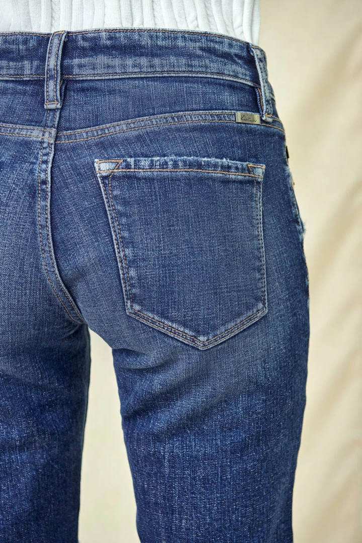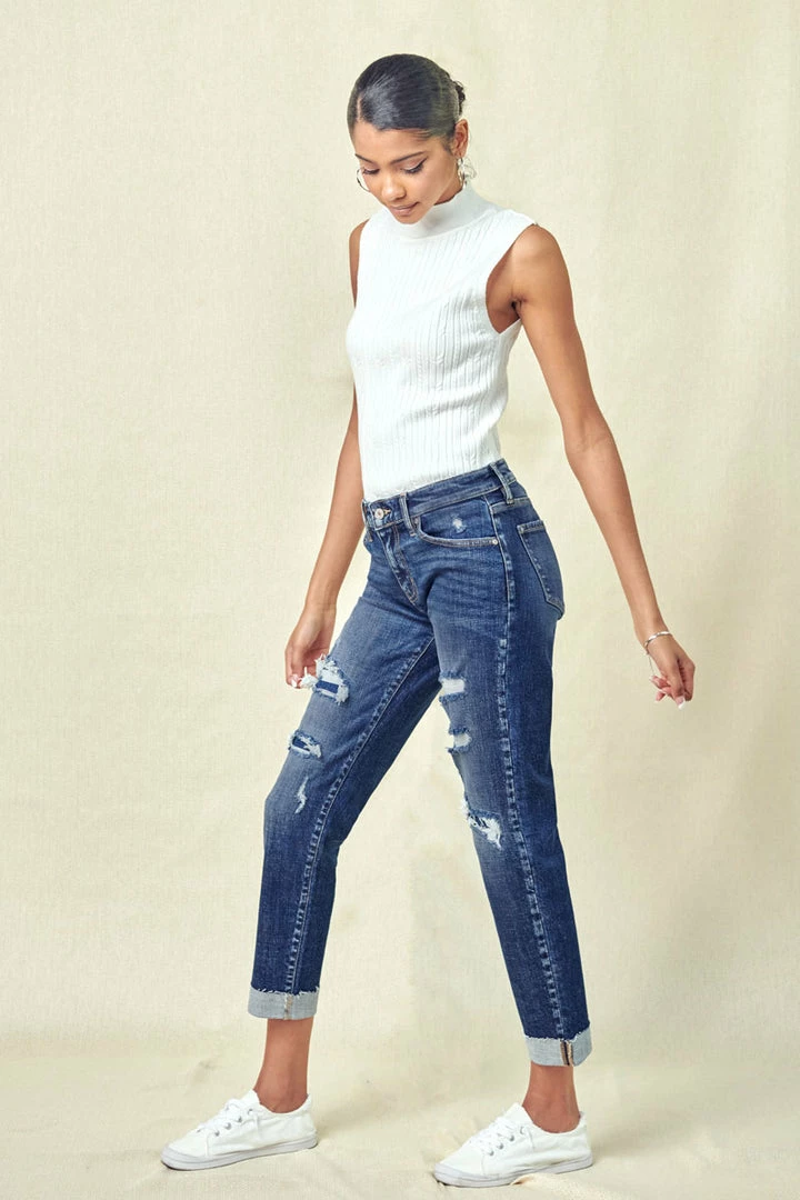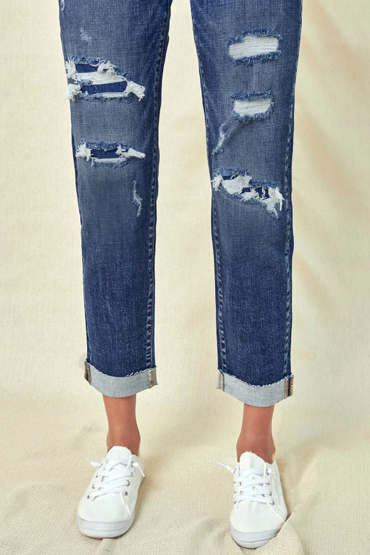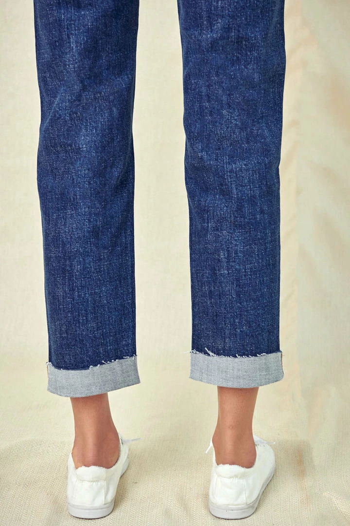 Dark washed relaxed and tapered fit jeans that are the perfect, casual staple to add to your closet. Featuring a single-button closure and zip fly, 3D whiskering, cuffed hem, and light fading.