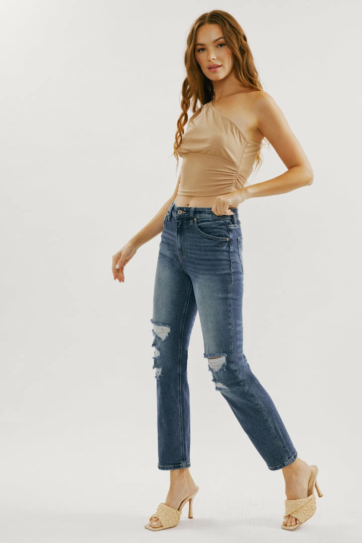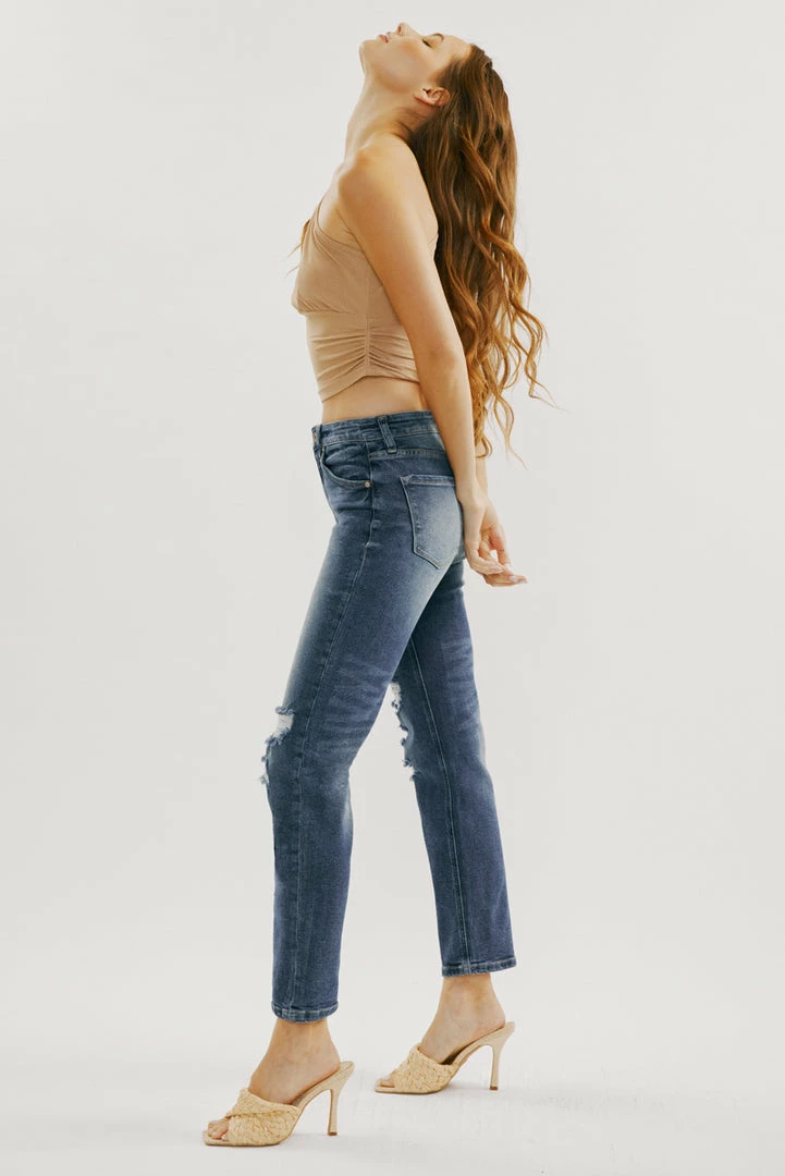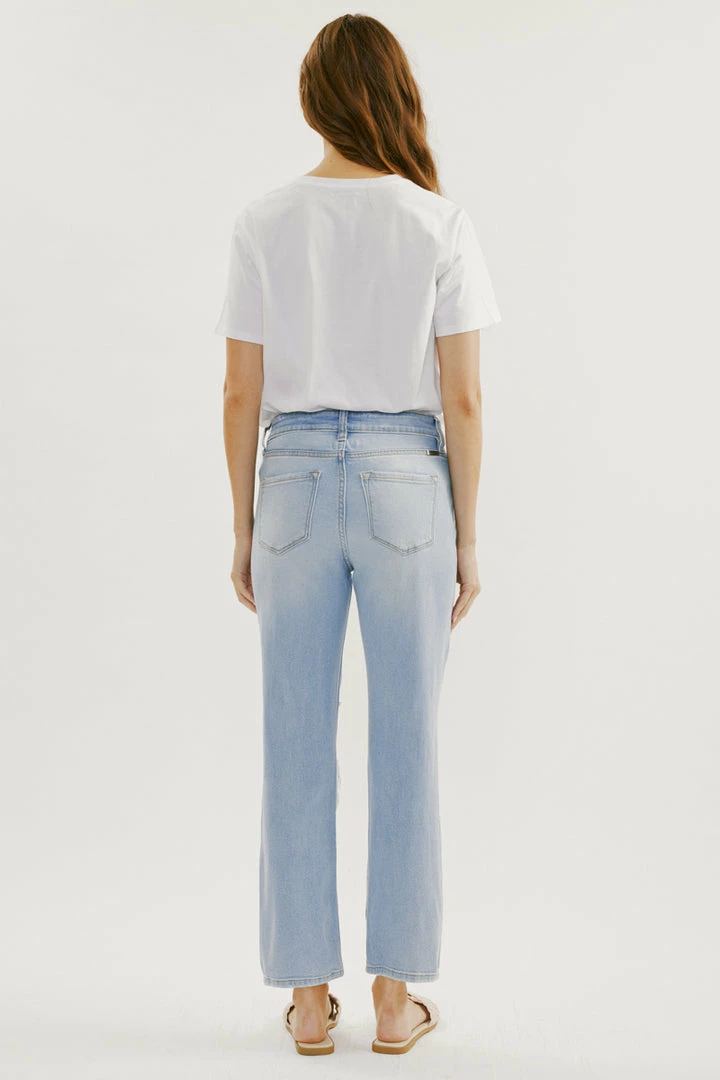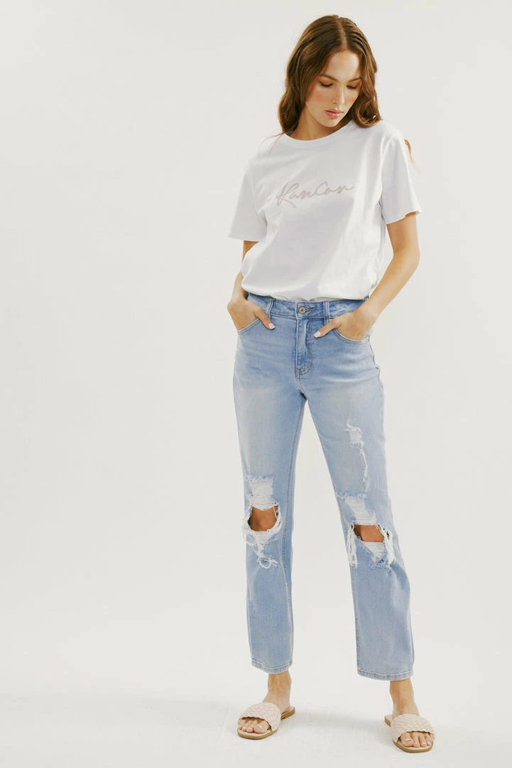 Our Norrine High Rise Jeans feature a slim-straight cut with light destruction, a faded wash, and a raw hem. Sits above the natural waistline as it tapers down the thigh and begins to relax at the calf. Made with comfort-stretch denim that’s durable while offering the same flexibility and comfort of a stretch denim jean. Features a classic five-pocket design, single-button front, and zip-fly closure.