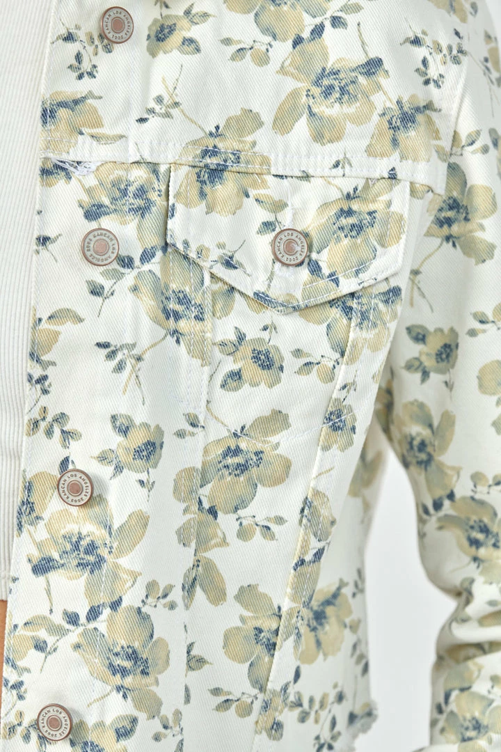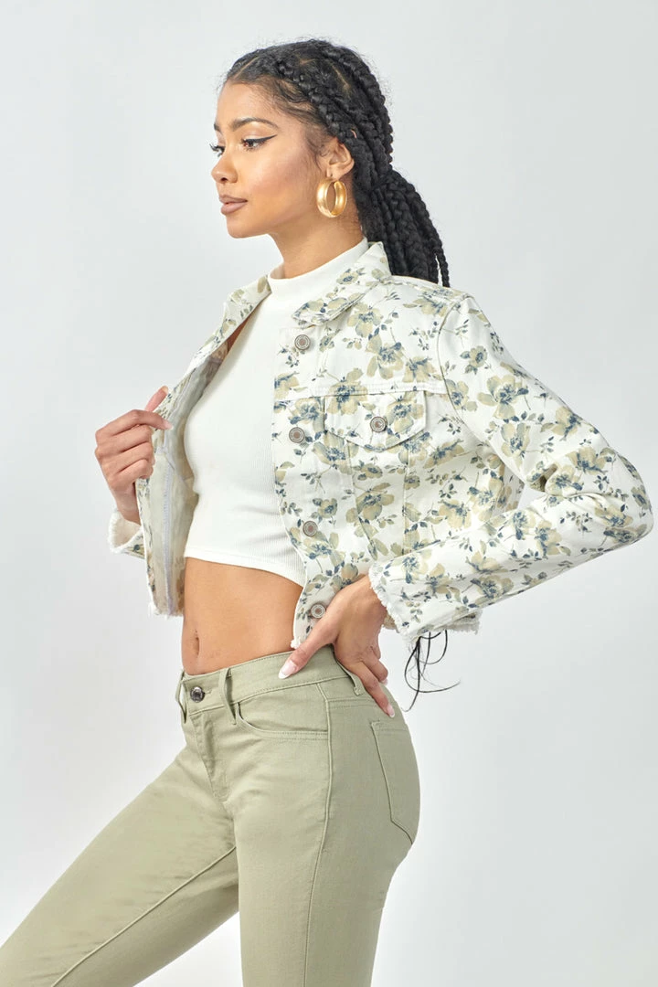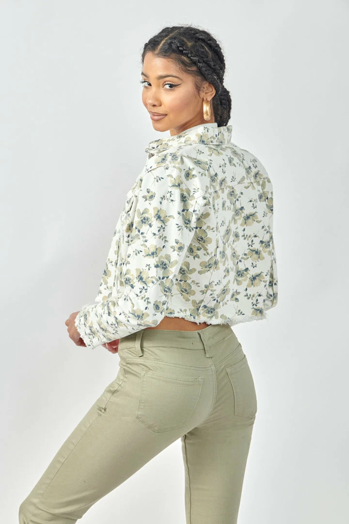 Floral printed cropped non-stretch trucker jacket made with raw frayed hem design. The perfect piece to freshen up your summer wardrobe.