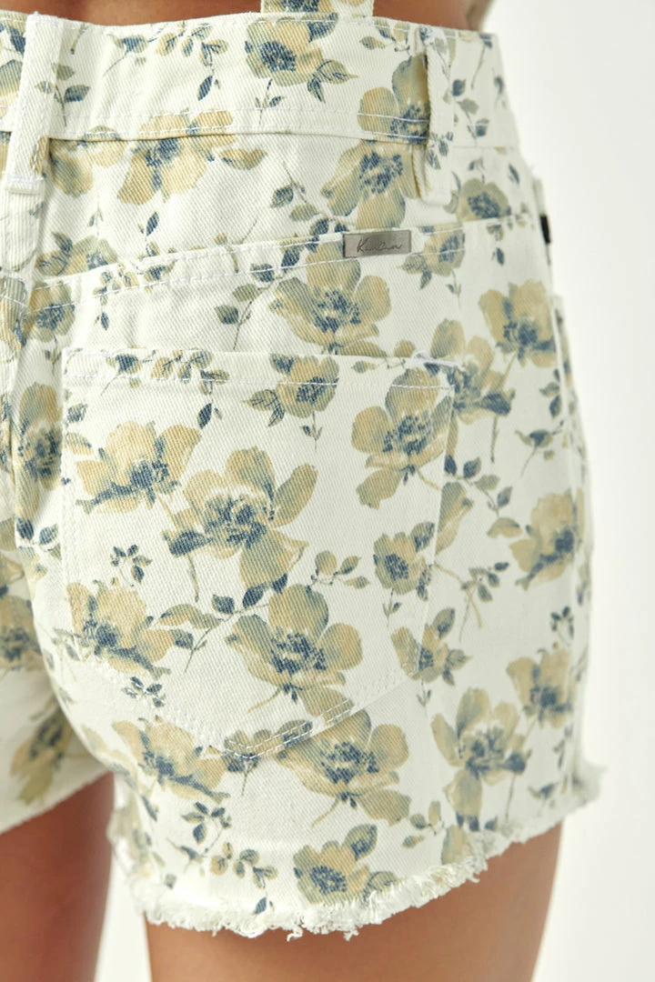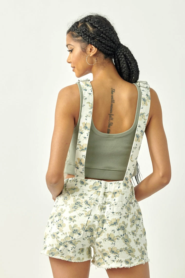Floral print overall shorts with button-down front closure, five-pocket design, adjustable strap, and raw frayed hem.Â
