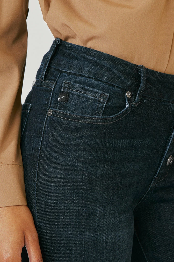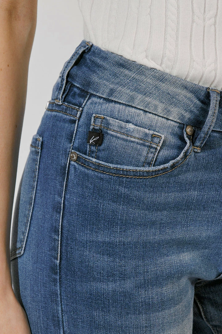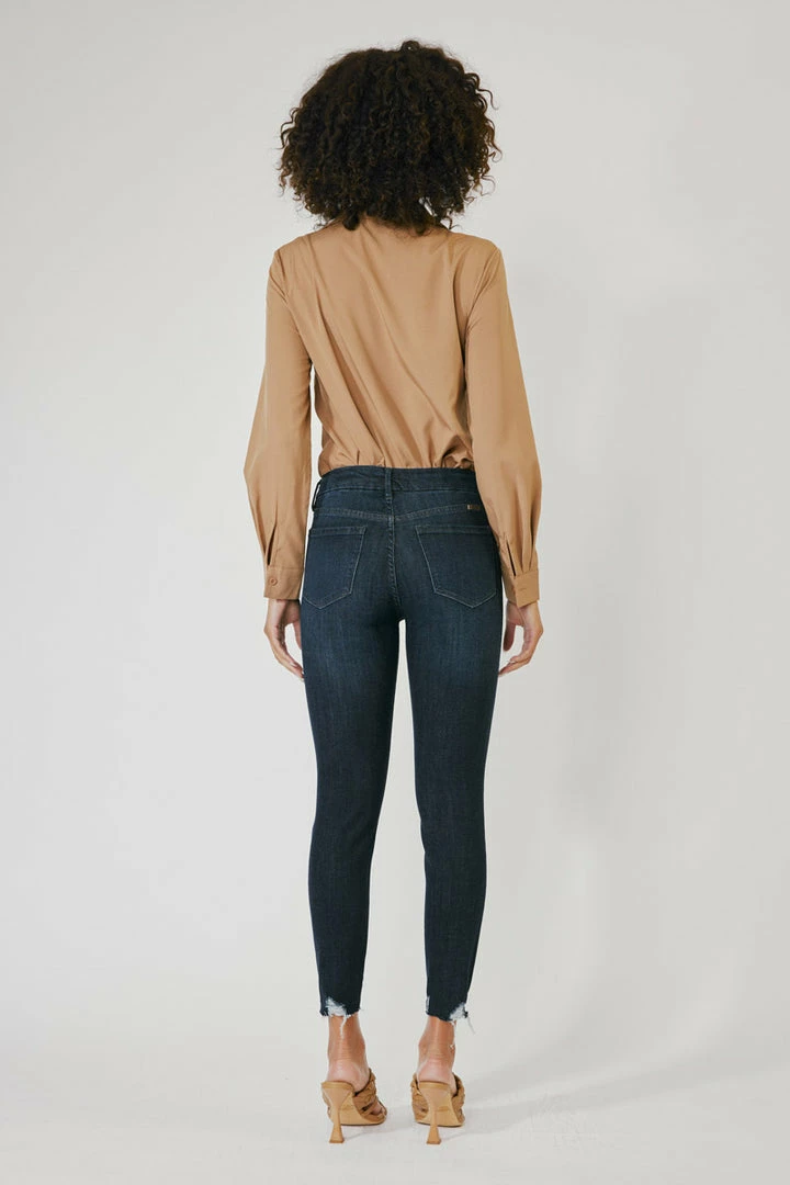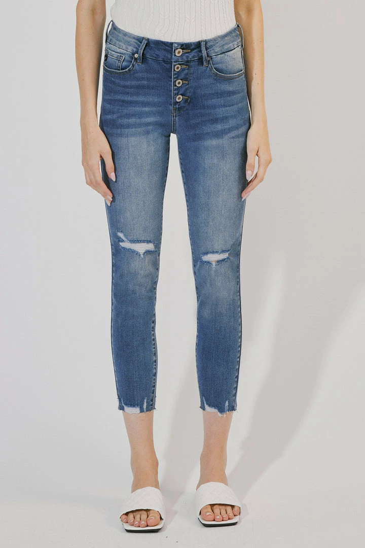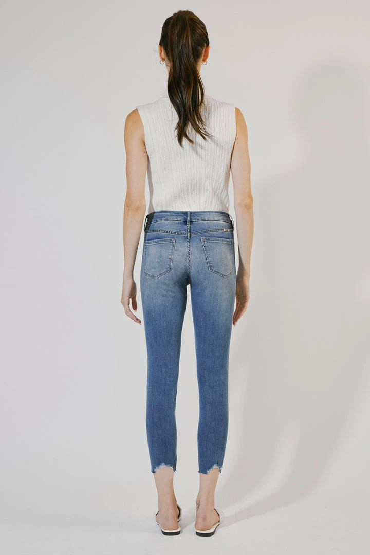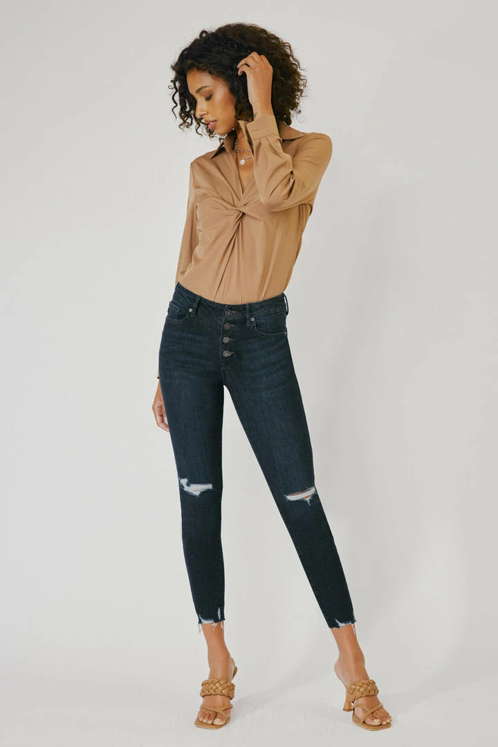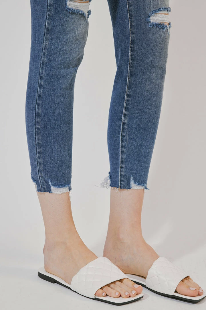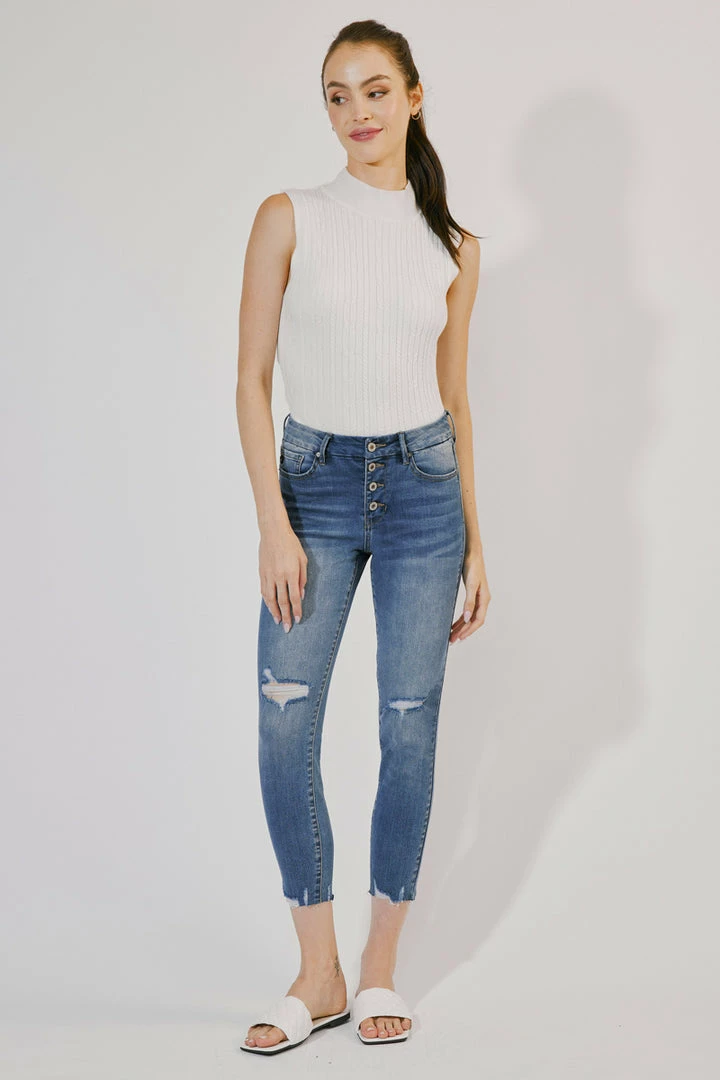 Our Penelope High Rise Jeans come with open-knee destruction and a distressed hemline that finishes right at the ankle creating a shorter skinny jean look. Sits above the natural waistline as it tapers down the leg. Made with super-soft stretch denim that’s breathable and flexible enough to retain its shape even after regular wear. Features a classic five-pocket design and four-button front closure.