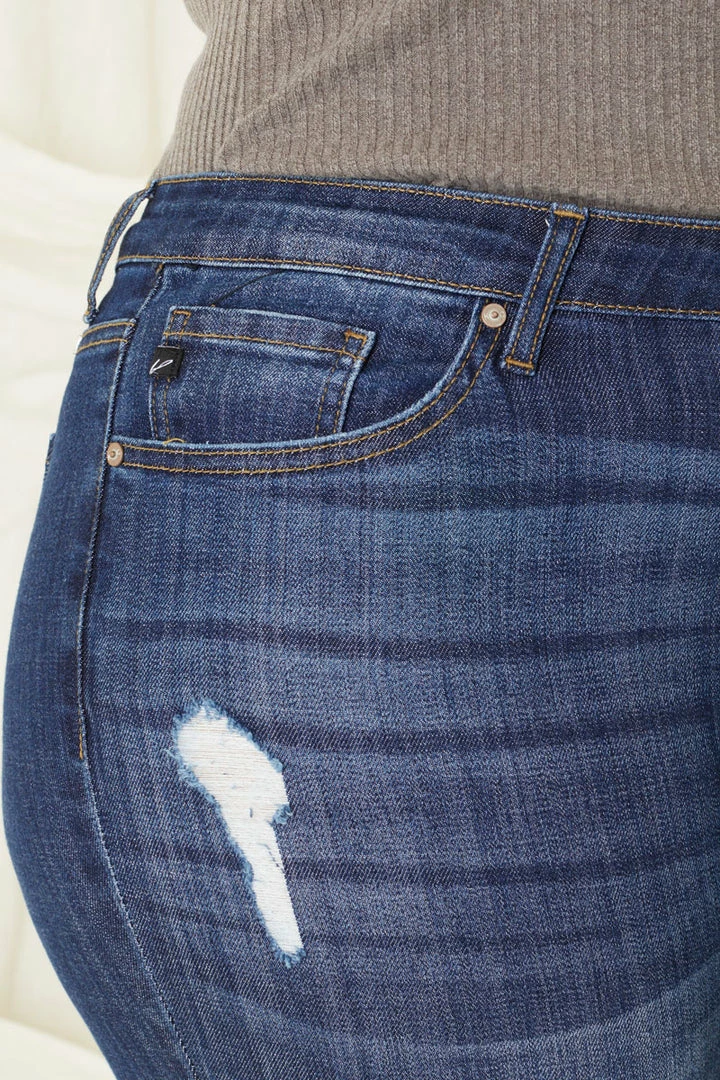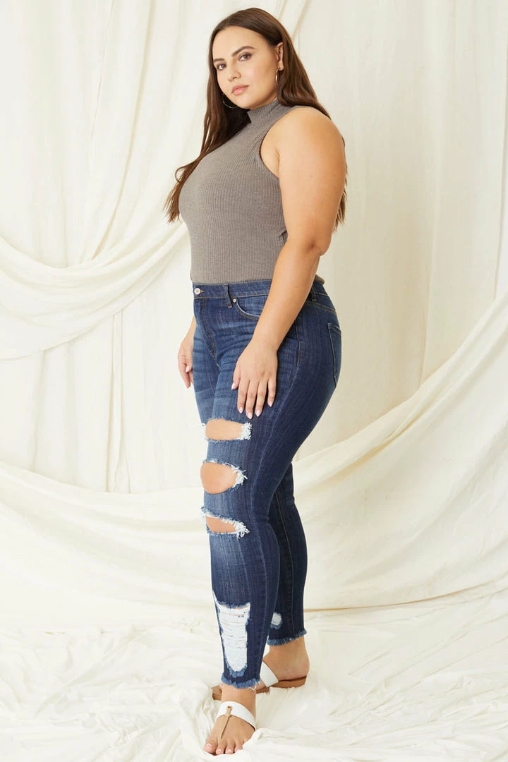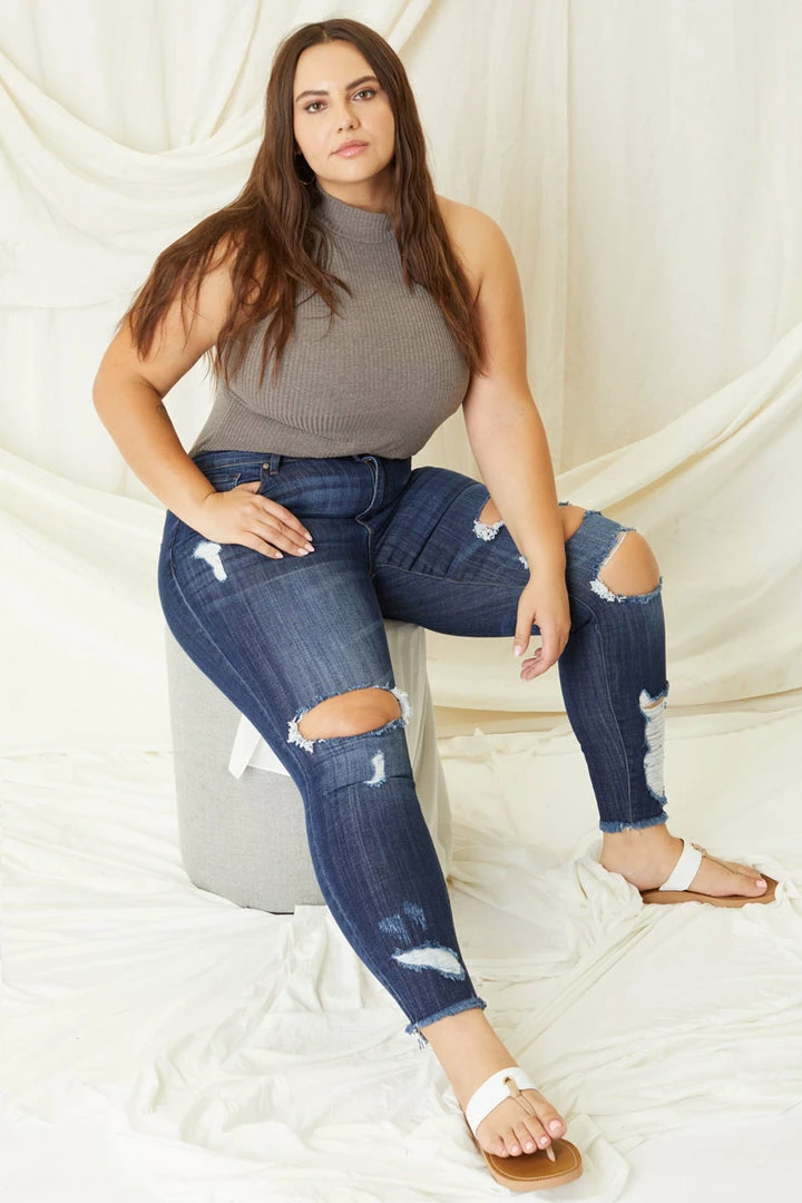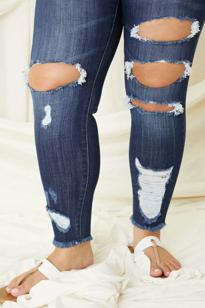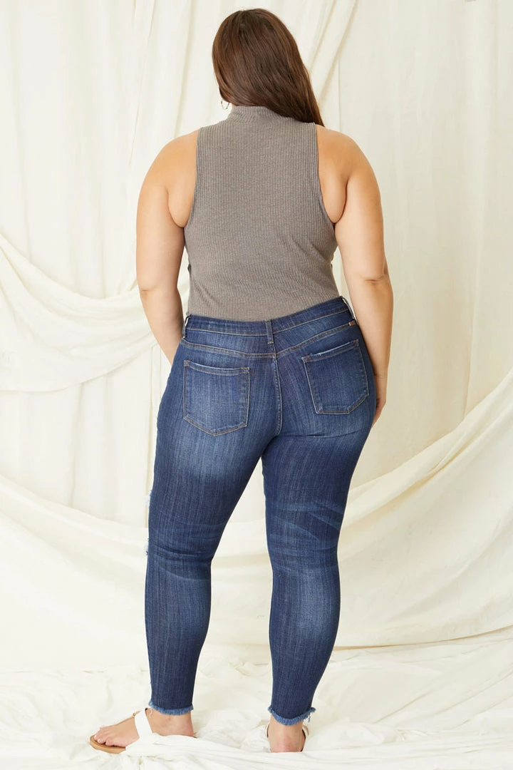Our penny skinny jeans come in a beautiful deep ocean blue that sit right at the waist. This style comes complete with fading, lots of distress, and a frayed hem perfect for those tank top and jeans days. Create a look that’s unique to you and as fun as the design.