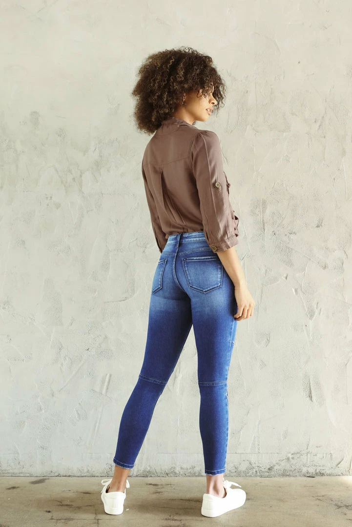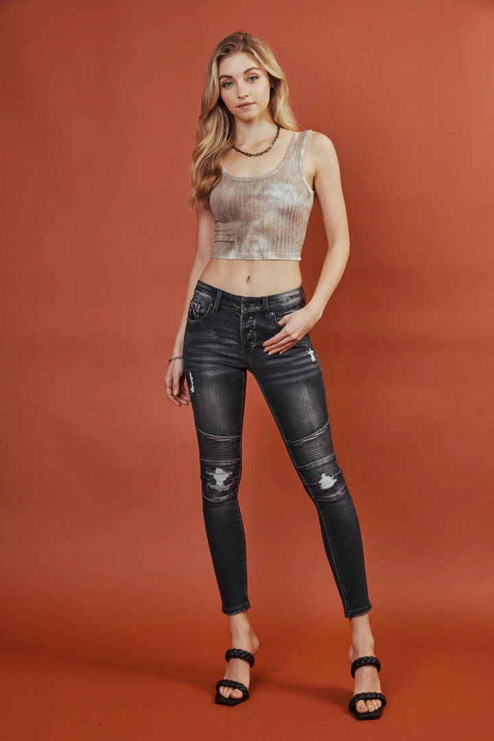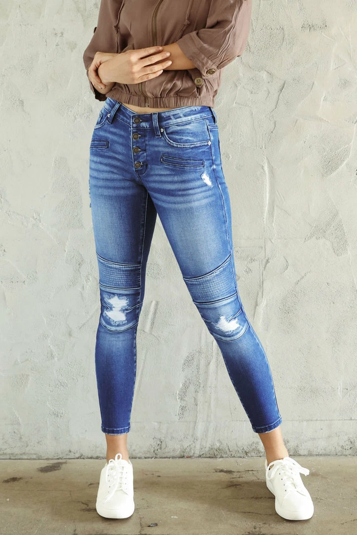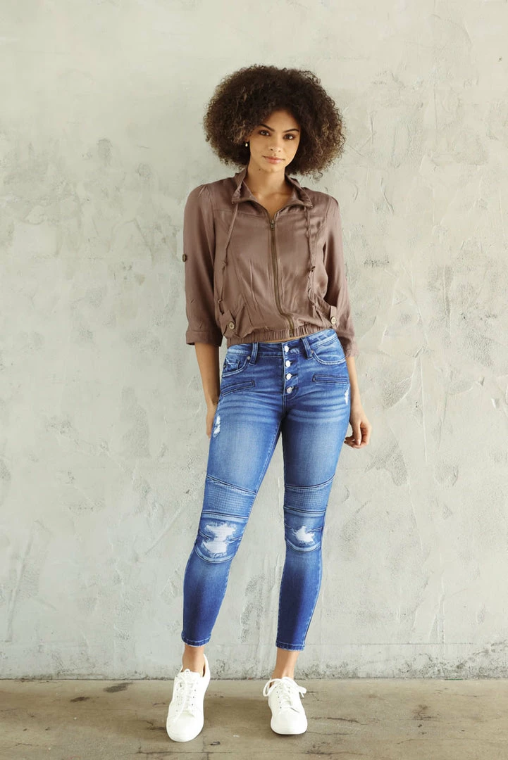 Our Peyton Mid Rise Jeans come in a super skinny fit with a unique moto design and light distress. Sits right at the natural waistline as it tapers down the leg creating a skin-tight look that hugs your every curve. Made with a stretchable soft denim that’s flexible and breathable giving you a comfortable fit every time. Features a classic five-pocket design and four-button front closure.