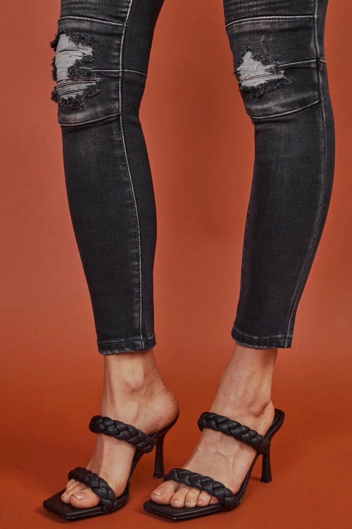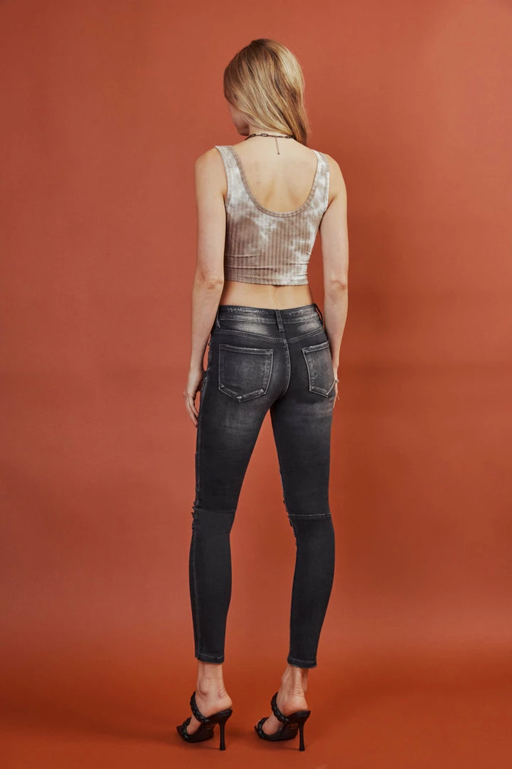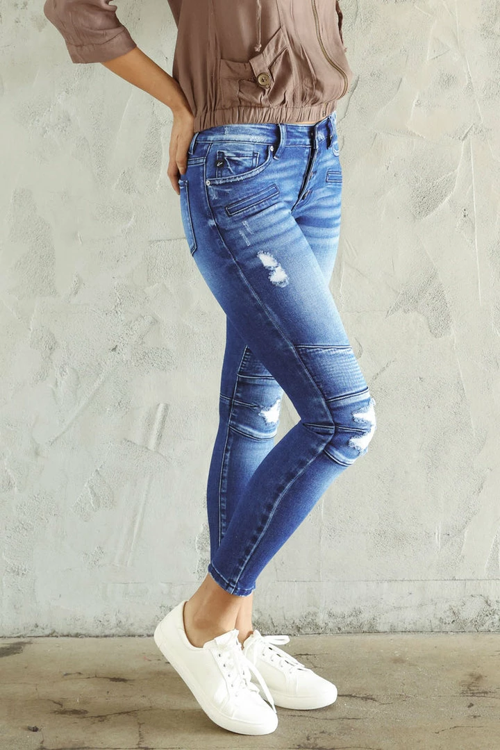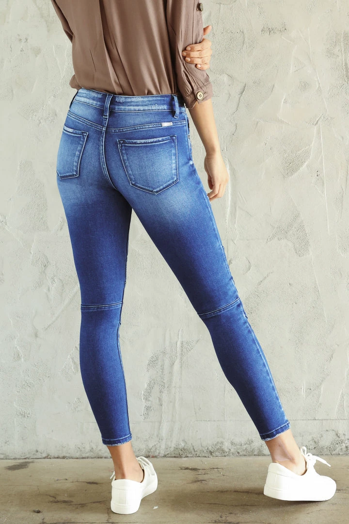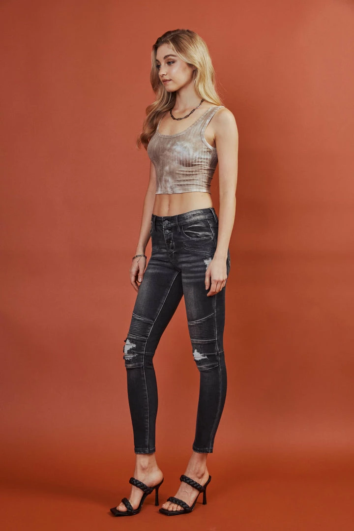 Our Peyton Mid Rise Jeans come in a super skinny fit with a unique moto design and light distress. Sits right at the natural waistline as it tapers down the leg creating a skin-tight look that hugs your every curve. Made with a stretchable soft denim that’s flexible and breathable giving you a comfortable fit every time. Features a classic five-pocket design and four-button front closure.