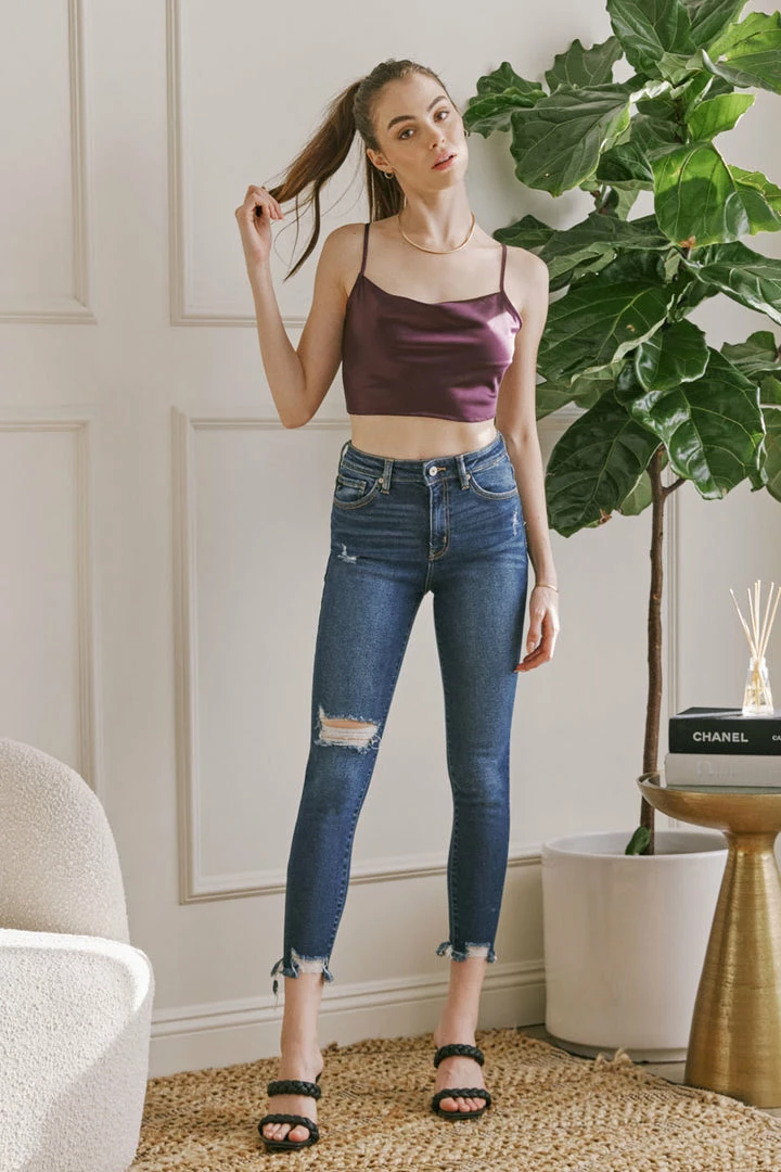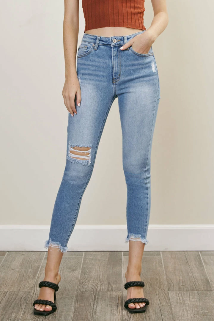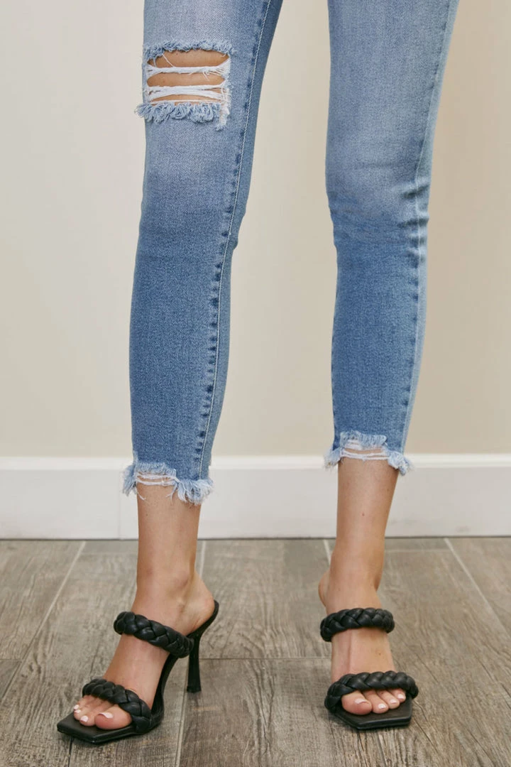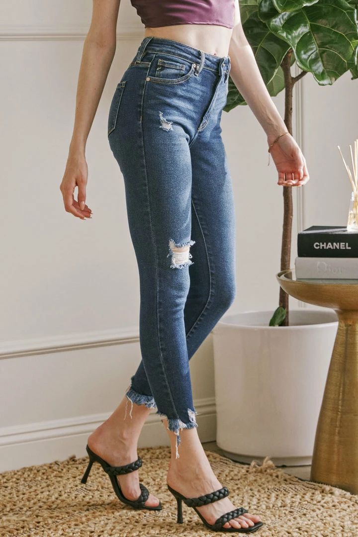 These silhouette-enhancing high-rise ankle skinny jeans can be dressed up or down! Featuring whiskering, distressed detailing, frayed hem, and a 5-pocket design with a zip fly.Â