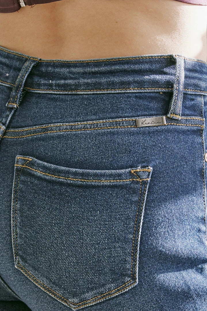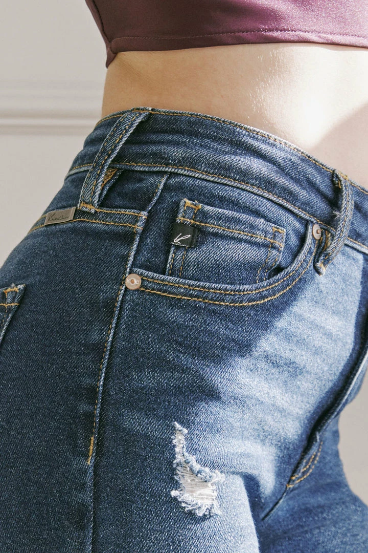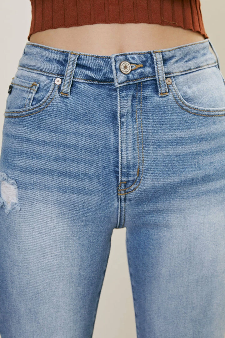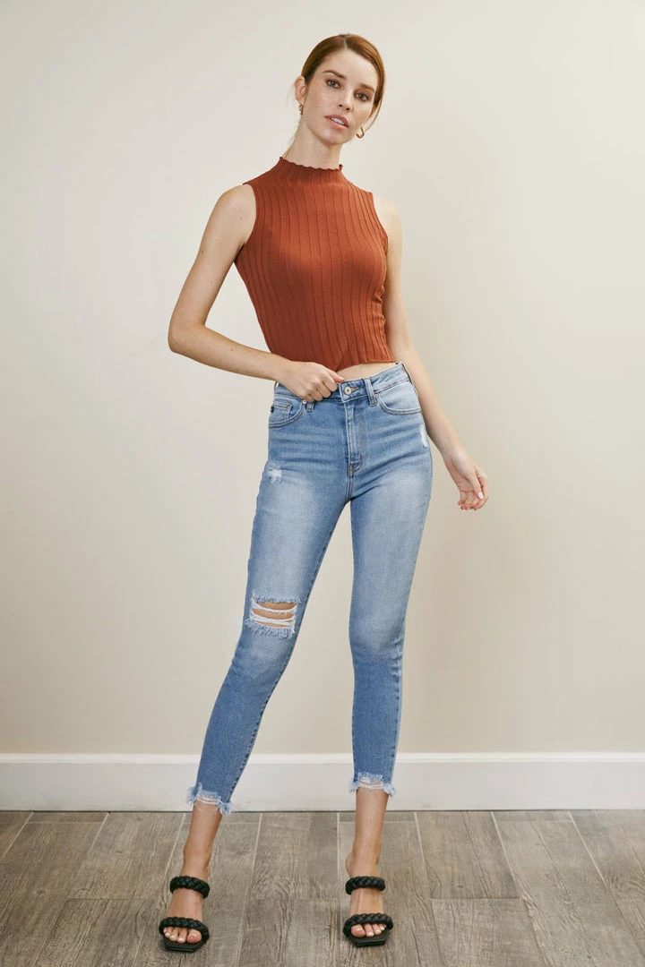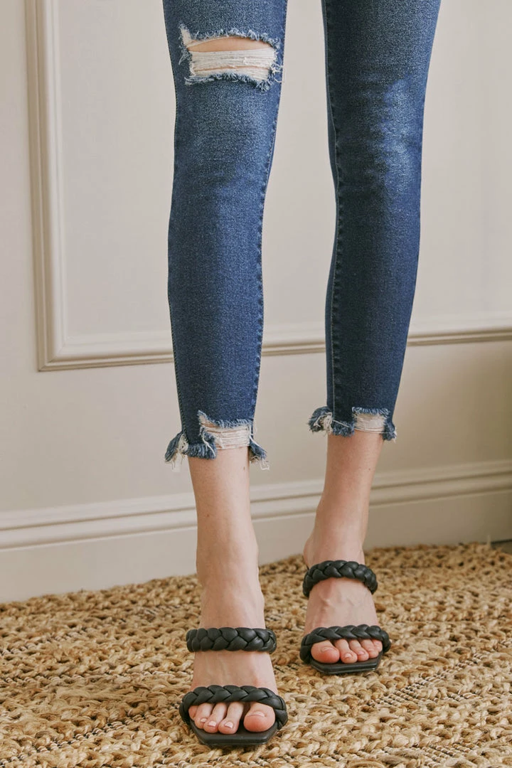 These silhouette-enhancing high-rise ankle skinny jeans can be dressed up or down! Featuring whiskering, distressed detailing, frayed hem, and a 5-pocket design with a zip fly.Â