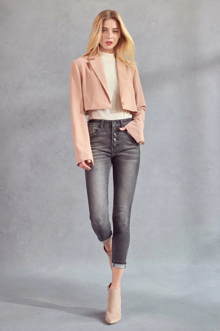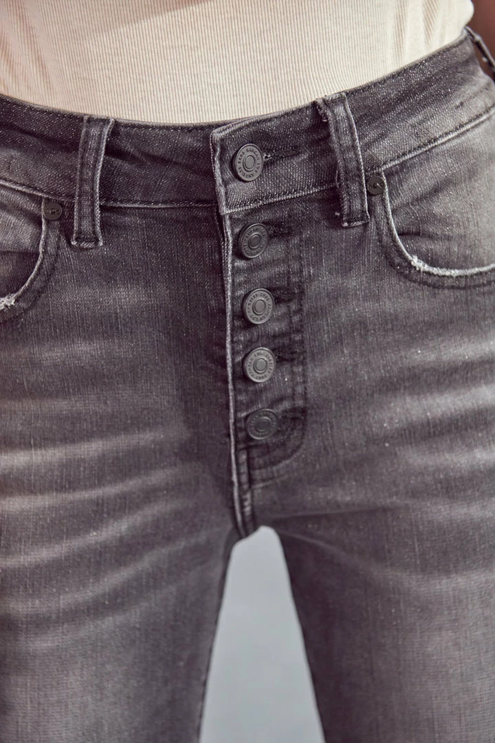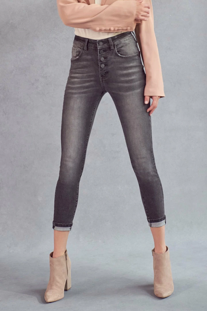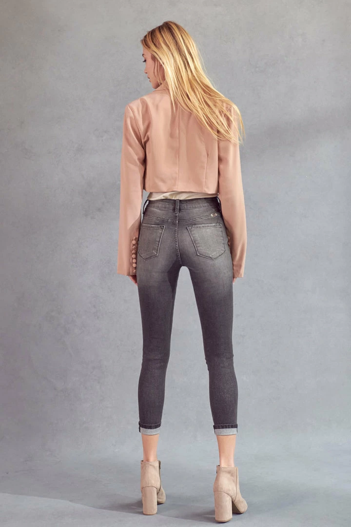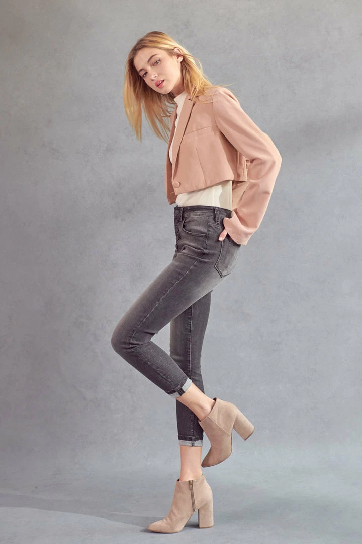 Our Quinn High Rise Jeans come in an ankle skinny cut featuring distress, a raw hem, and a slightly faded wash. Sits above the natural waistline as it tapers down the leg and hits right at the ankle creating a chic look that’s versatile and stylish. Made with super soft stretch denim that’s flexible and retains its shape even after multiple wears. Features a classic five-pocket design, single-button front, and zip-fly closure.