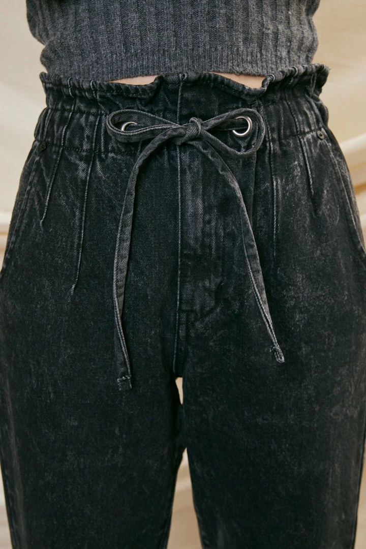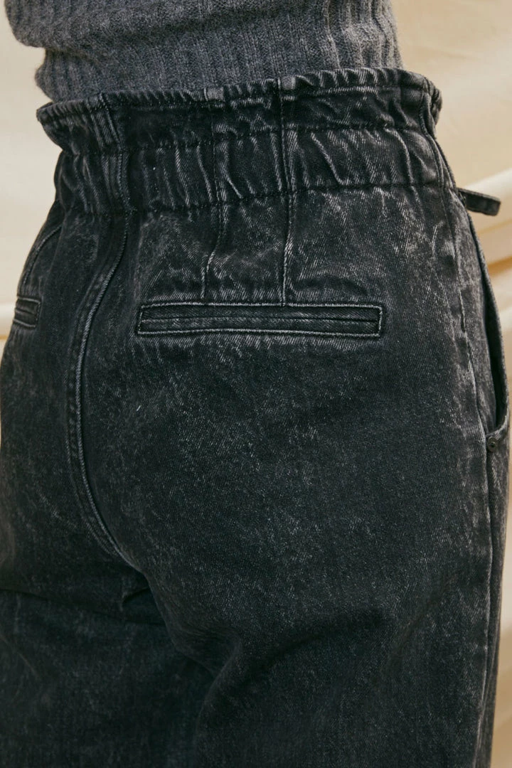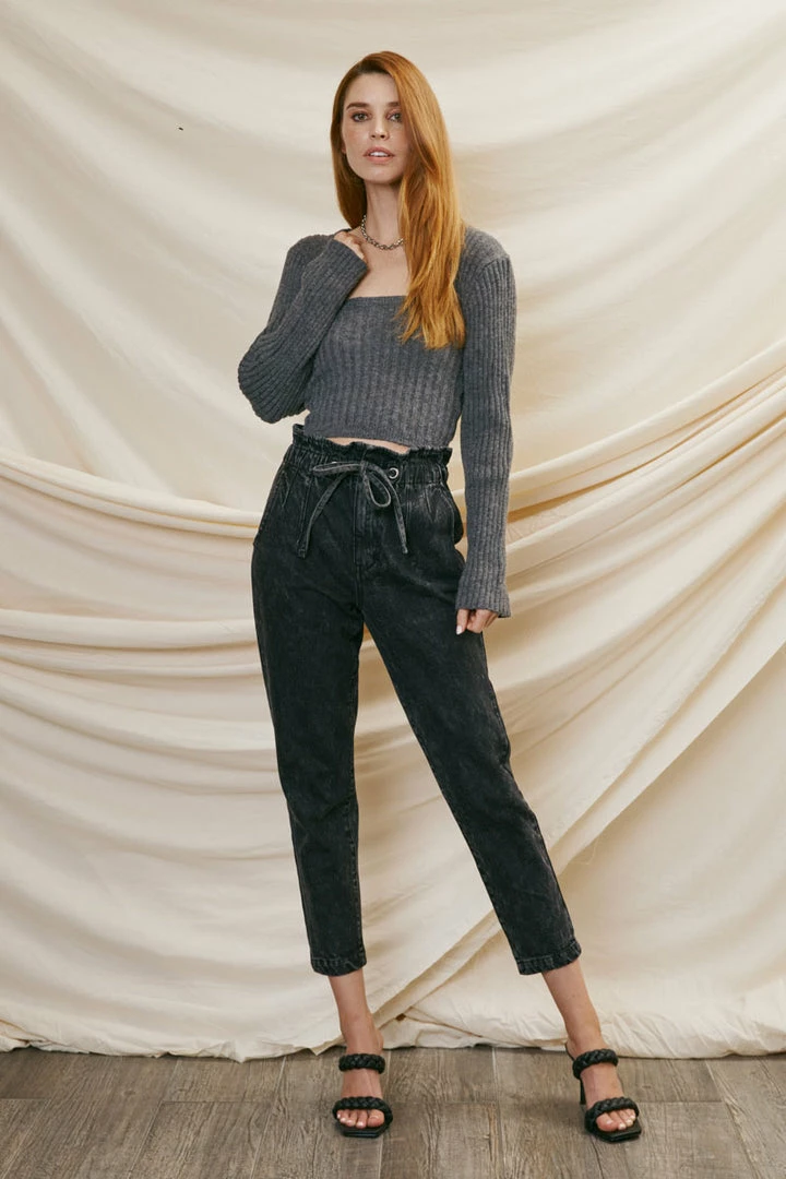 Our Rachelle High Rise Mom Jean comes in a dark grey wash with light acid washing detailing. Sits high above the natural waistline with a paperbag waistline detail for a trendy look. Fitted from the waist as it relaxes down the leg for a true mom jean style. Features a 2-pocket design, drawstring waistline, single-button front, and zip-fly closure.