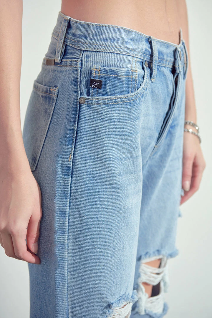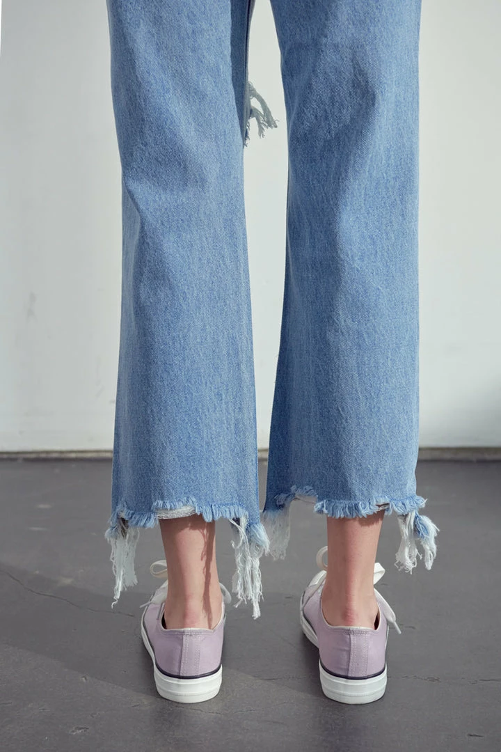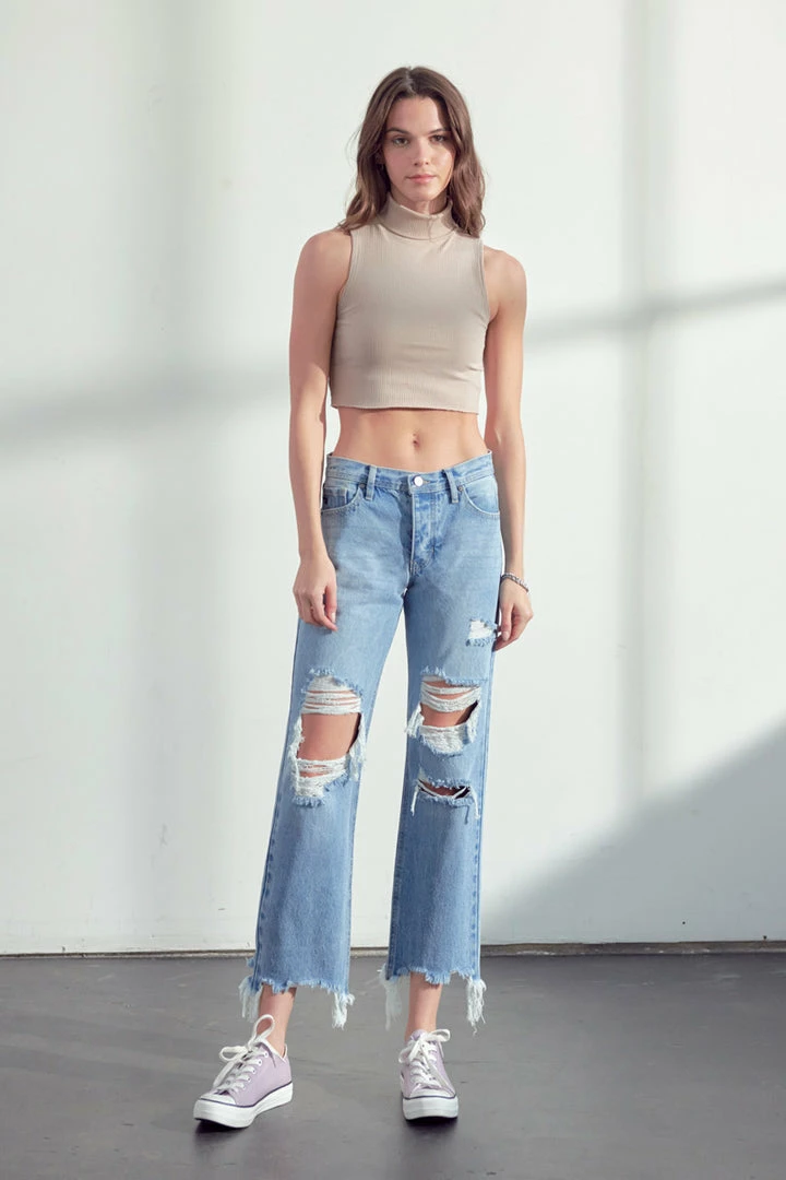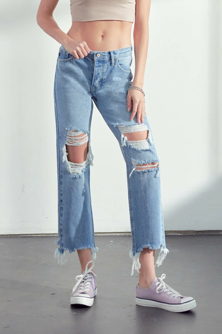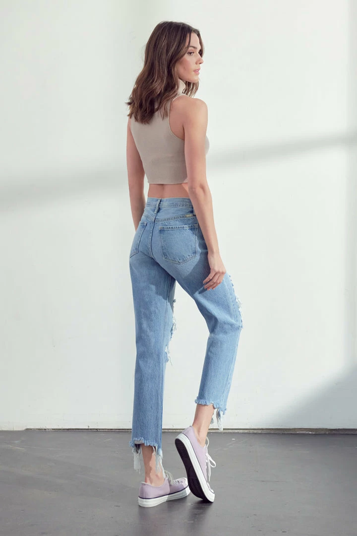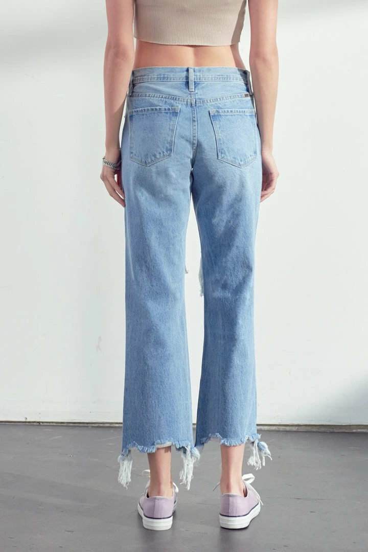 Our Rania High Rise Straight Leg Jeans come in a medium blue wash with moderate distress on the front with a frayed hem. These relaxed-fit jeans are perfect to lounge in or bring along with you on your everyday errand run. Its rigid denim keeps the jeans from bagging out after every wash. Features a 5-pocket design, and hidden button fly.