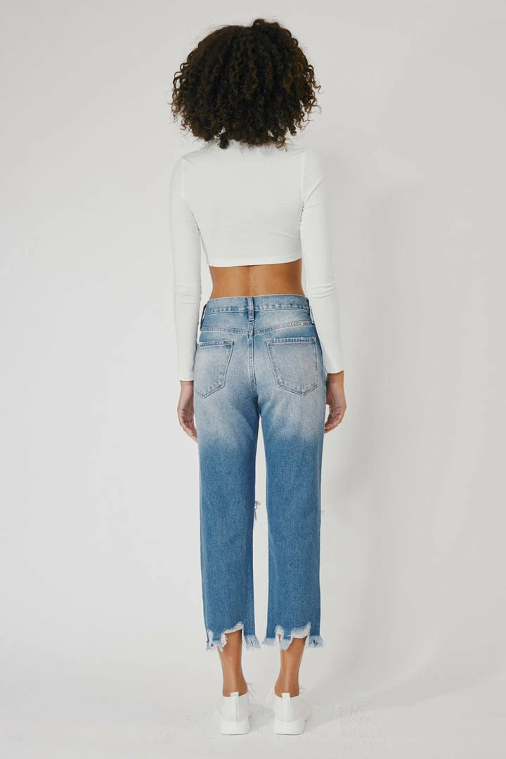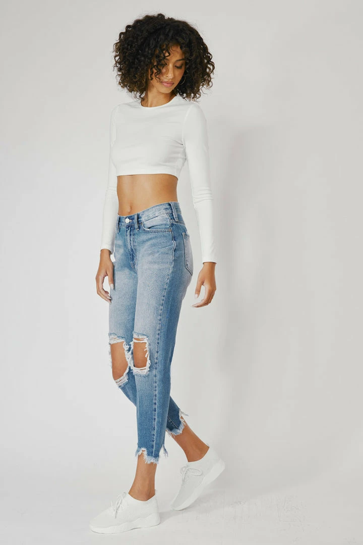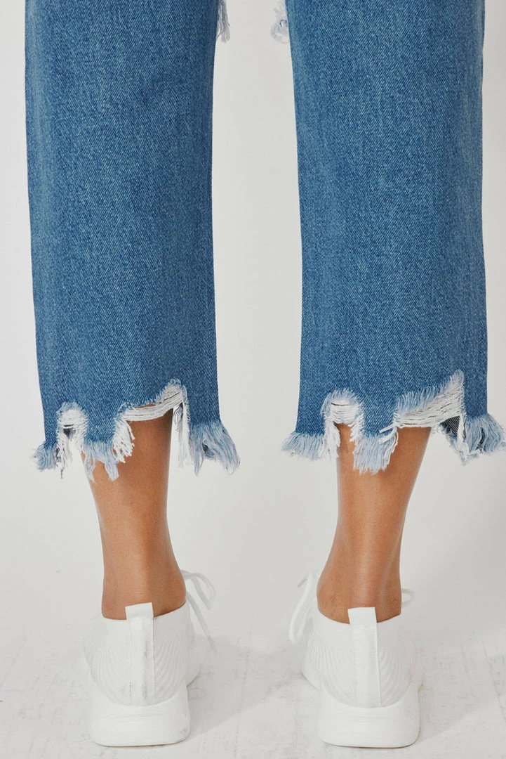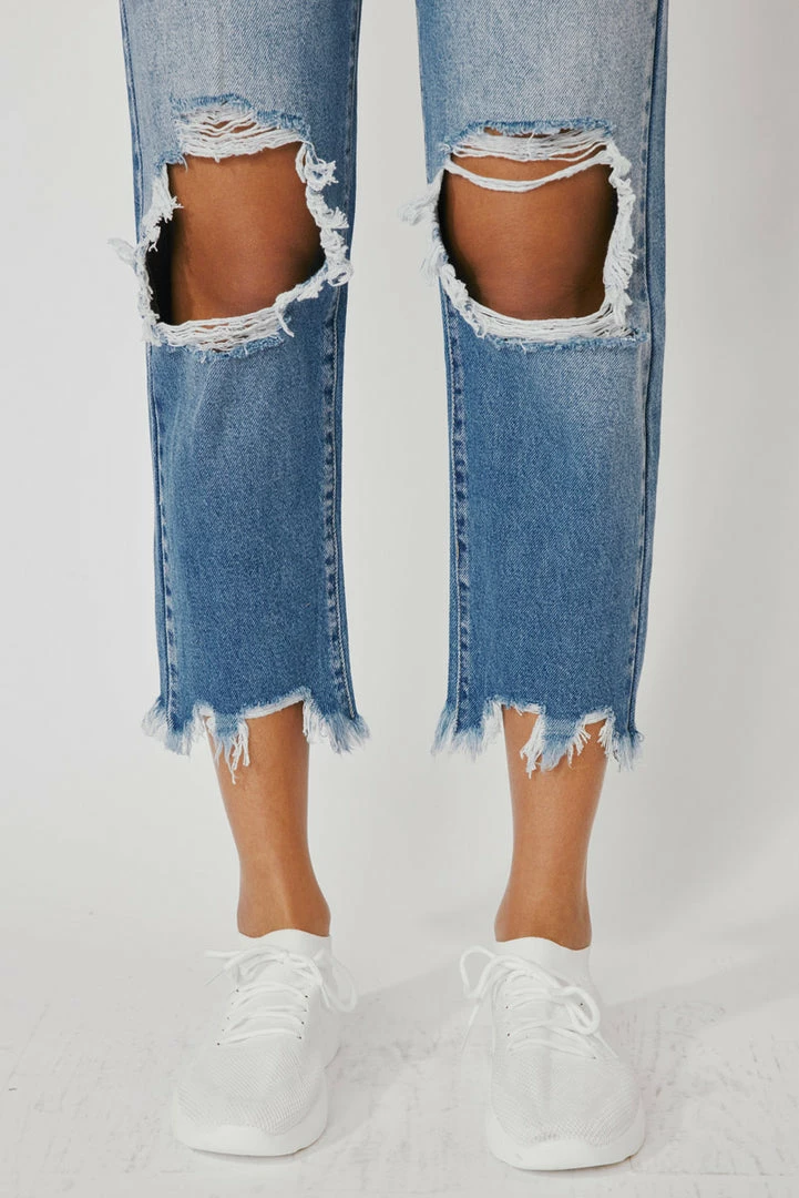 Medium wash denim with destruction and a raw staggered hem for a lived-in look that feels comfortable and stylish. Our Regina High Rise Jeans come with fading on the front and back and 3D whiskering detail that adds to this mom jeans’ rugged vibe. Sits high above the natural waistline as its fit relaxes through the thigh and leg. Comes in a rigid non-stretch denim fabric with a classic 5-pocket design, single-button front, and zip-fly closure.