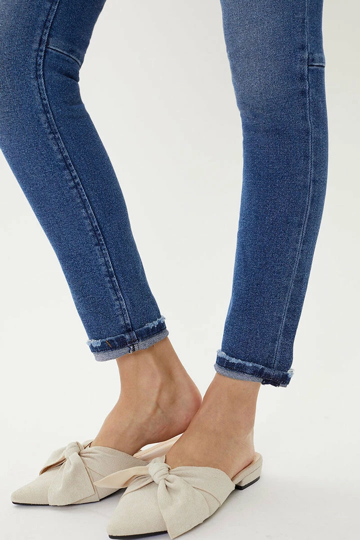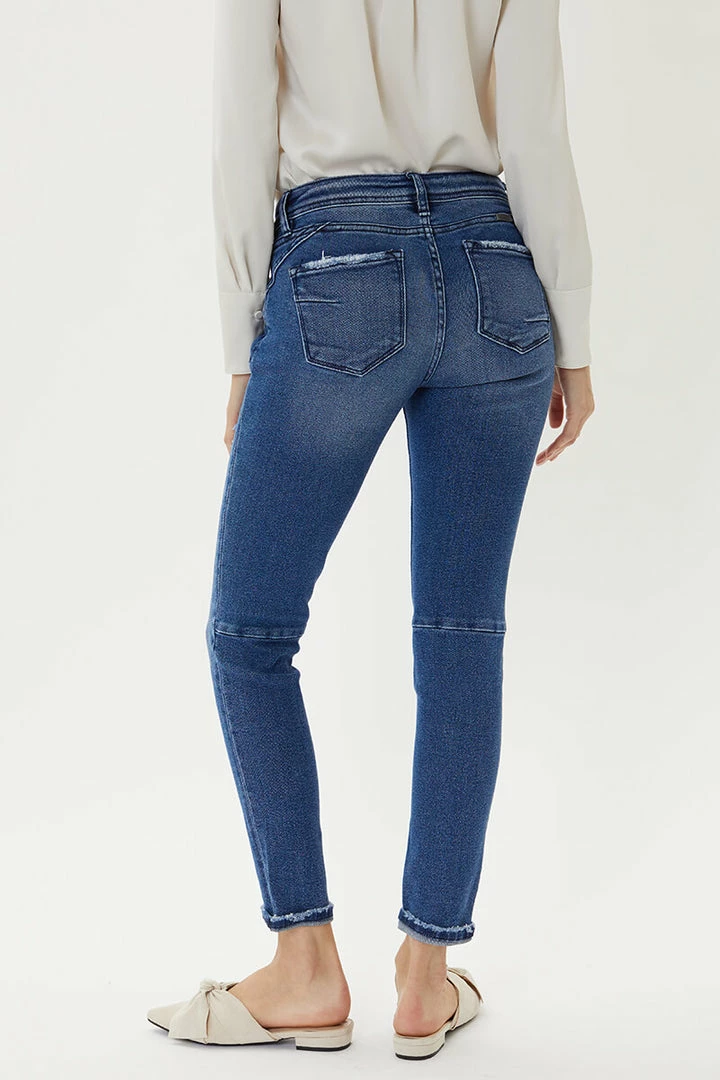 Looking for simple yet unique skinny jeans to add to your wardrobe? This pair features darts at front and back pockets, the cut seam on back yoke, whiskering, cut seam line on the back of the knees, minimal distressing on each side,1-inch folded hem, single-button closure, and a 5-pocket design.