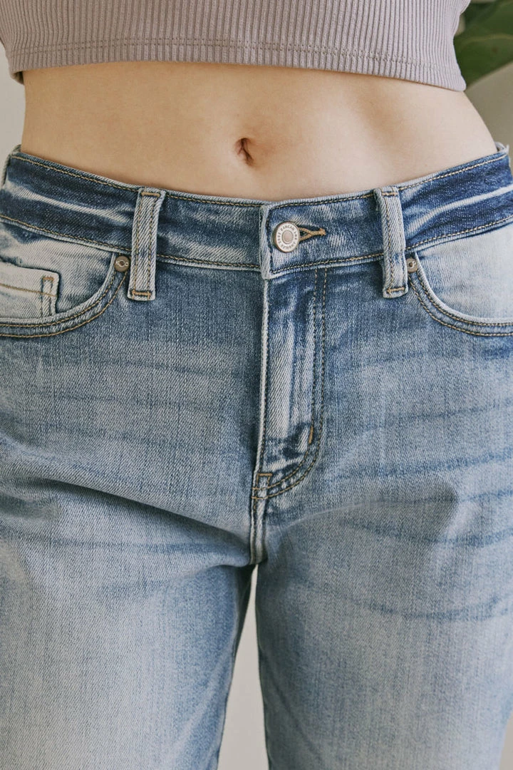 Medium wash mom fit jeans that cut high at the waist, relaxed through the hip, tapered through the leg, featuring light fading, whiskering, and minimal distress detail.