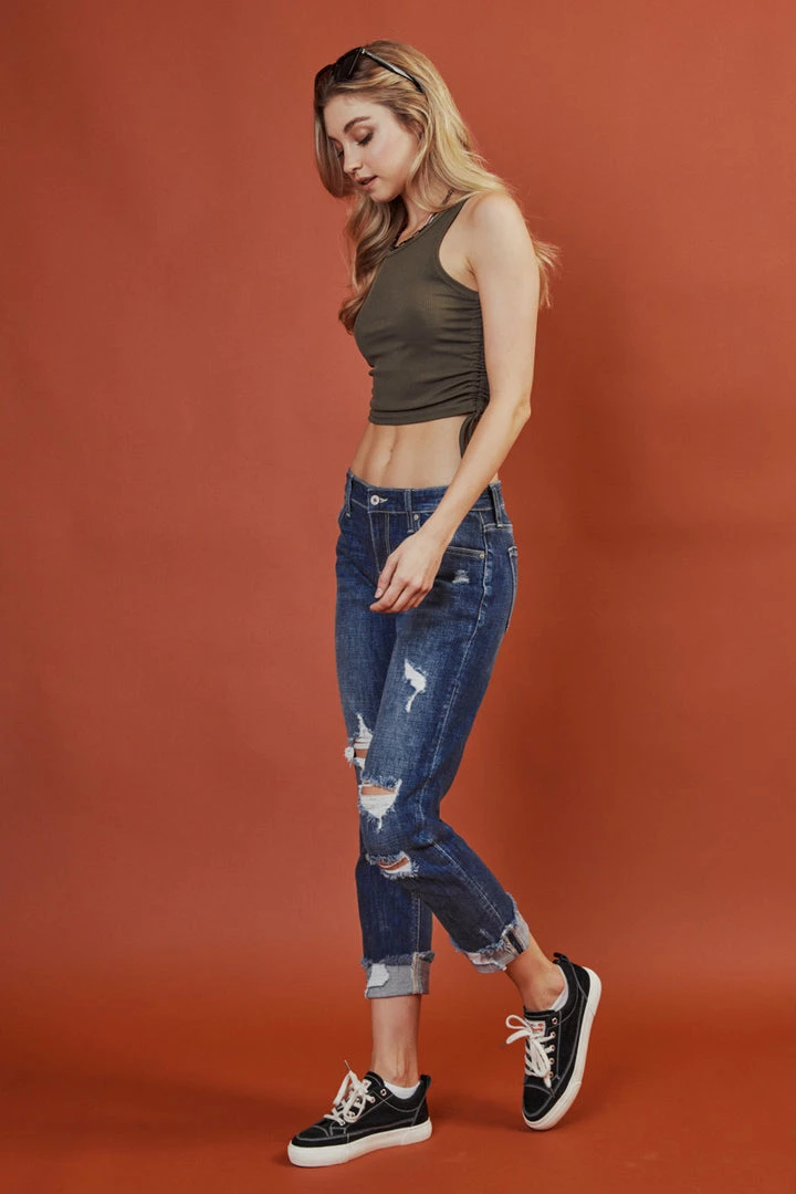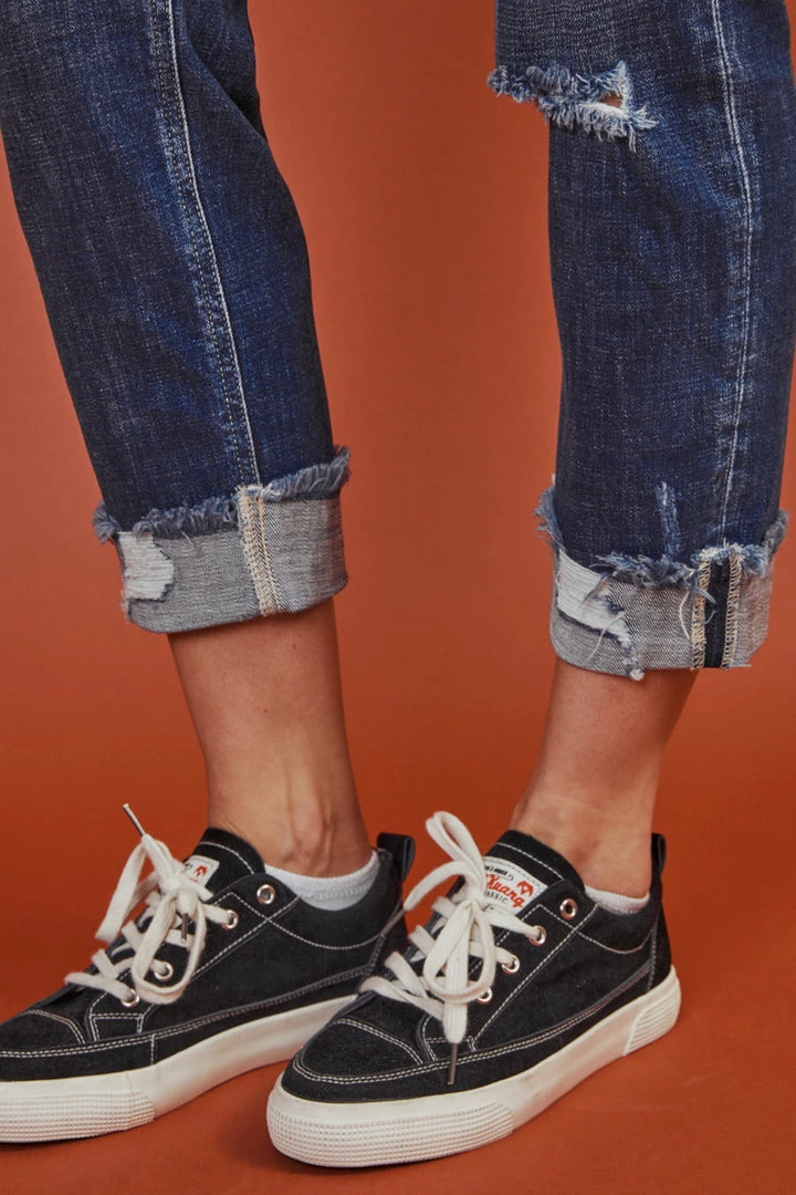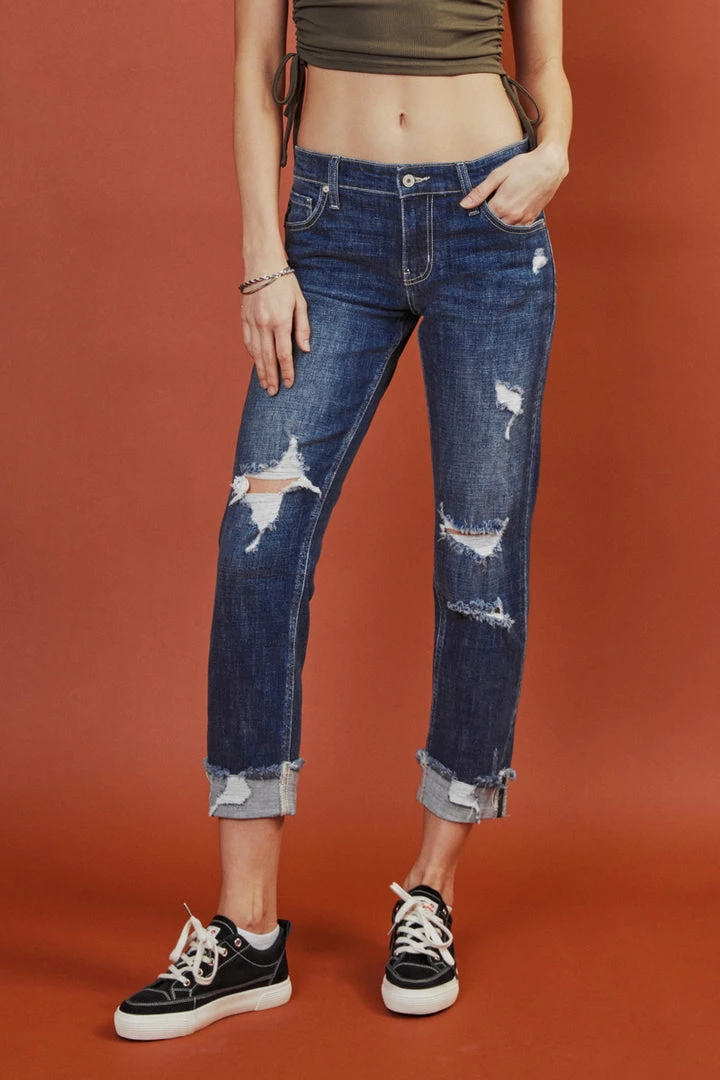 Dark blue denim with whisker details and moderate distress for a lived-in look that’s perfect for dressing up or down. Our Russel Mid Rise Jeans sit right at the natural waistline as they relax down the leg, creating a loose-fitting silhouette. Made with comfort-stretch denim that maintains its shape even after multiple wears. Features a classic five-pocket design, single-button front, and zip-fly closure. Finished with gold-colored hardware.