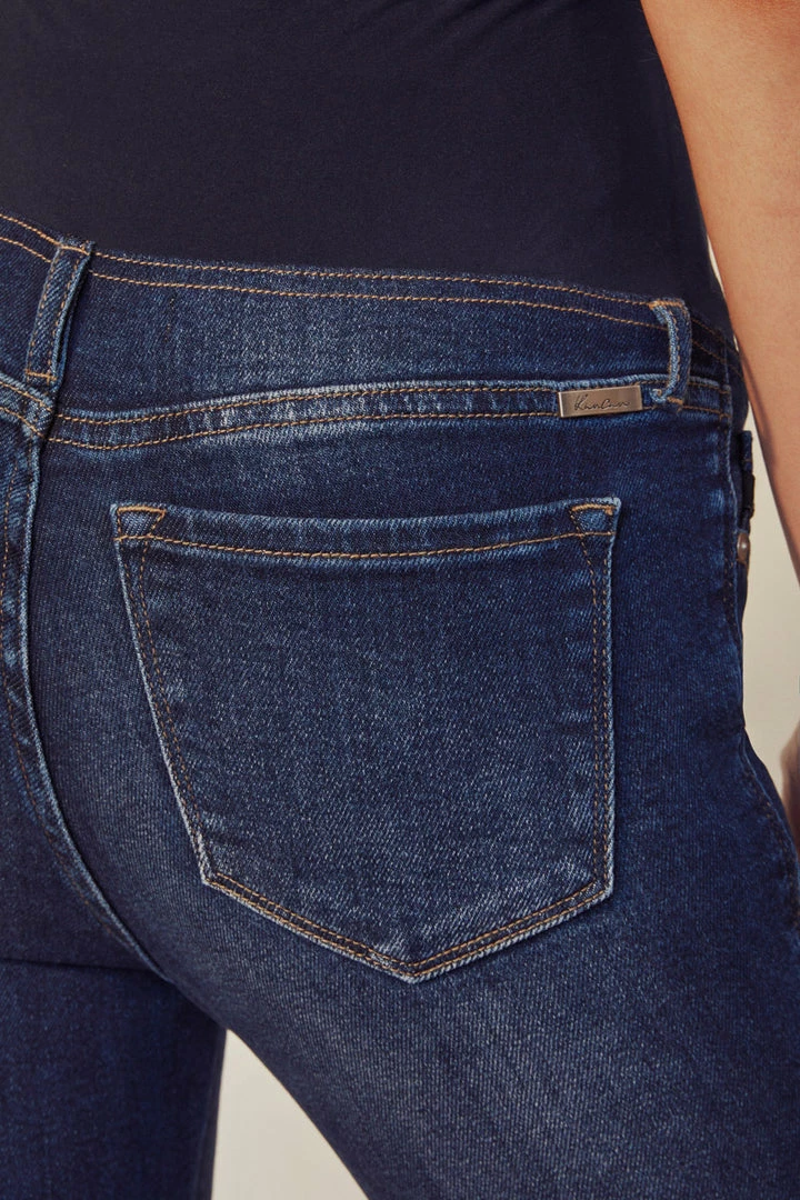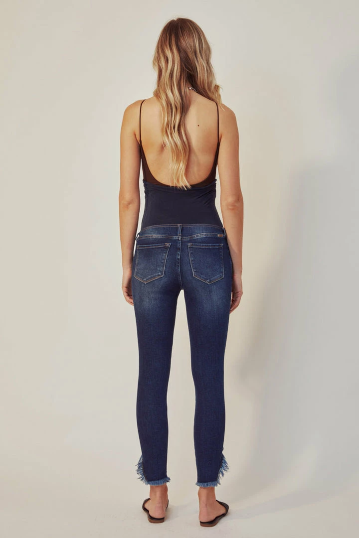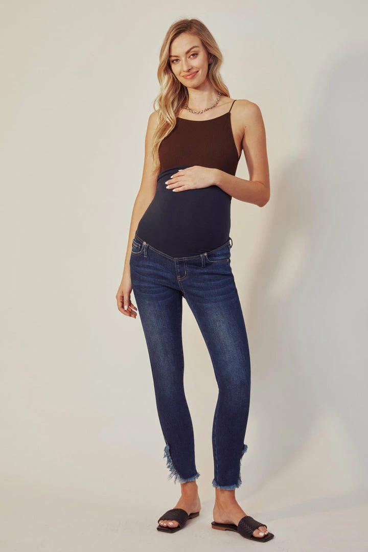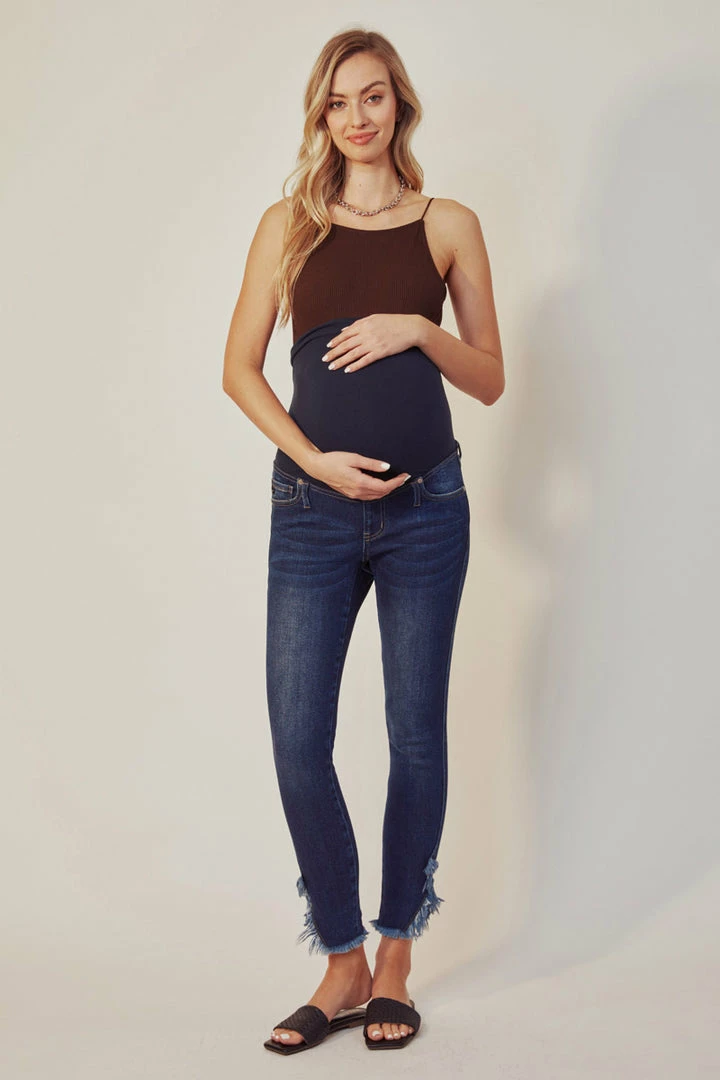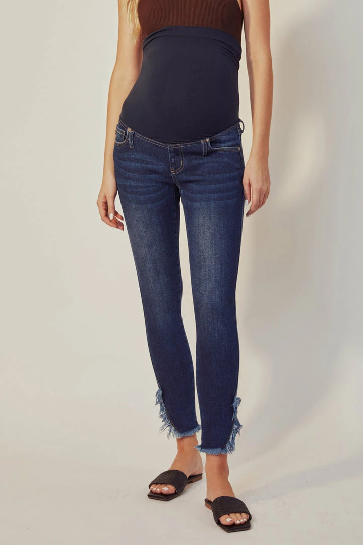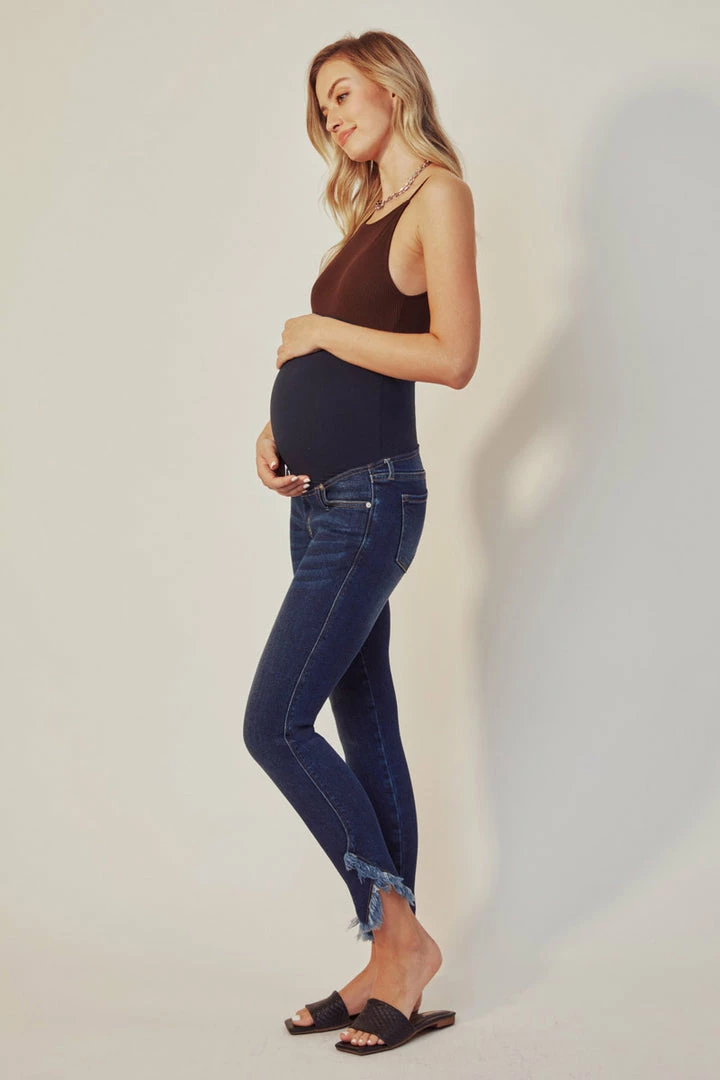 A dark-washed maternity jean featuring a wrap-around stretch waistband. Features slight fading, a distressed hemline, and a classic ankle skinny fit that will keep you stylish even through your third trimester. Comes in a 5.25″ rise and is made with soft, stretch denim for a comfortable and breathable design. Features a classic five-pocket design and sealed closure for easy pull-up wear. Finished with silver-colored hardware.