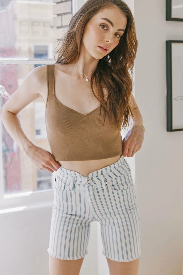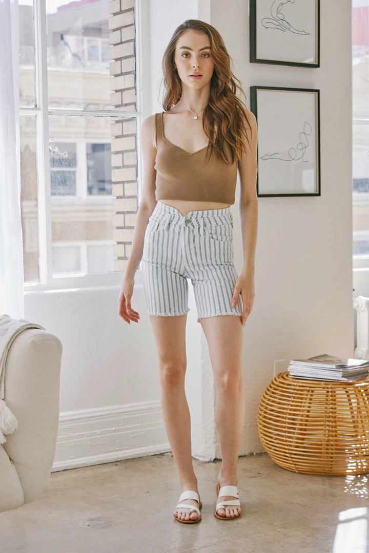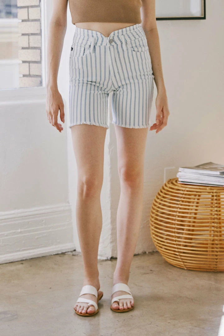 Our Rylee High Rise Bermuda Shorts come in a white and blue pencil striped design featuring a frayed hem for an edgy look. Sits right above the natural waistline for an easy fit that tapers down the thigh for a form-fitting style, perfect for dressing up your summer wardrobe. Made with super-stretch denim that’s breathable and comfortable. Features a classic five-pocket design, single-button front, and zip fly closure. finished with silver-colored hardware.