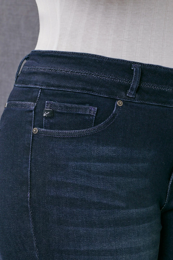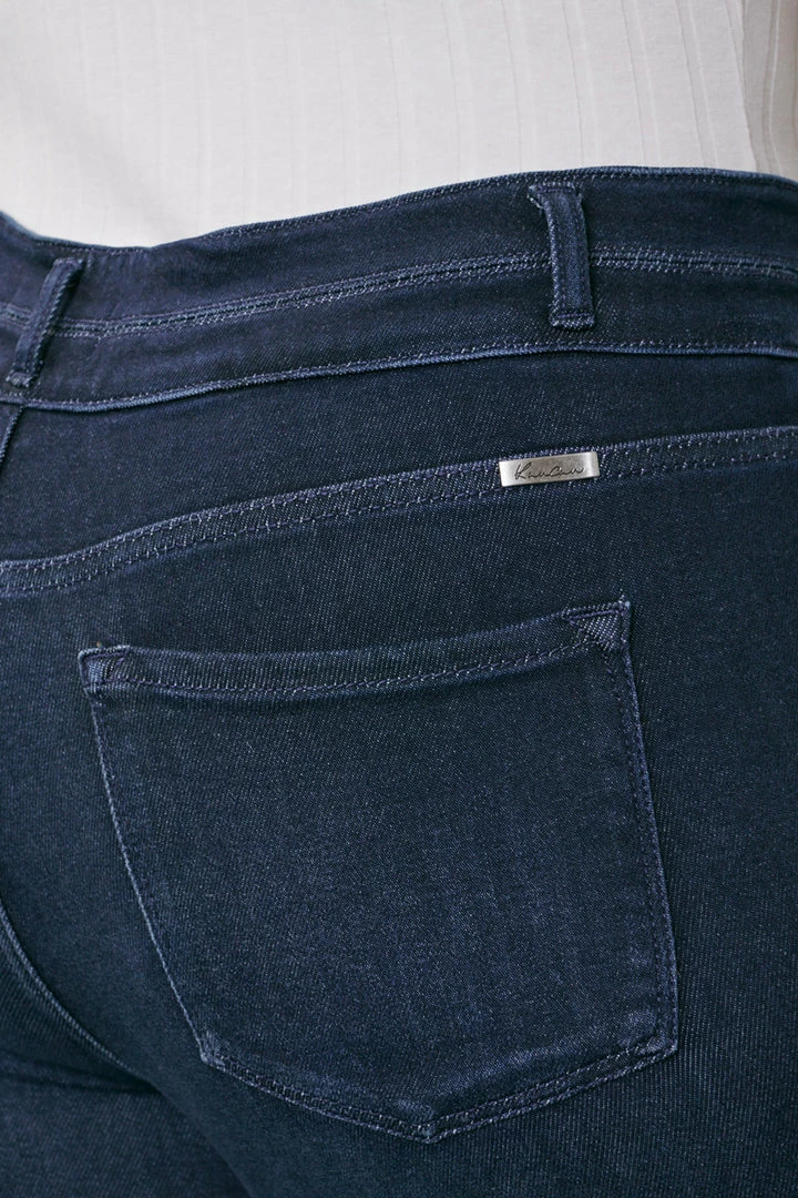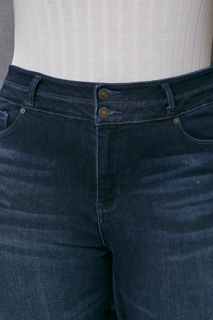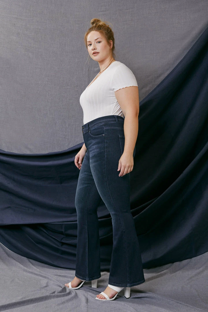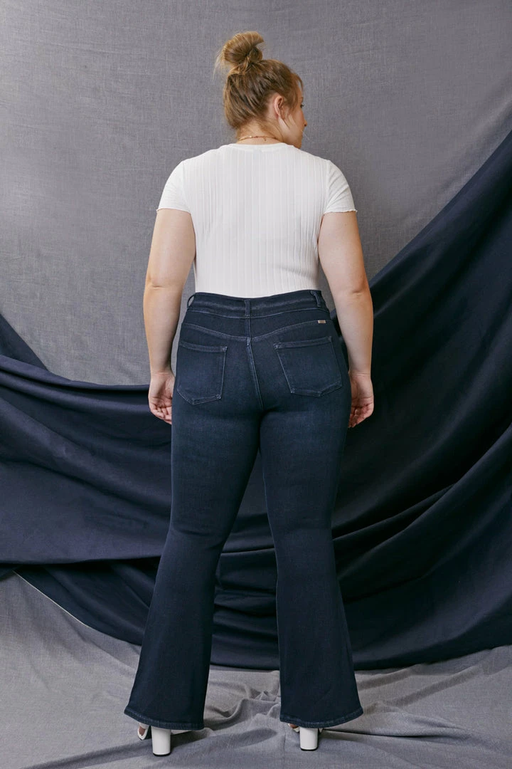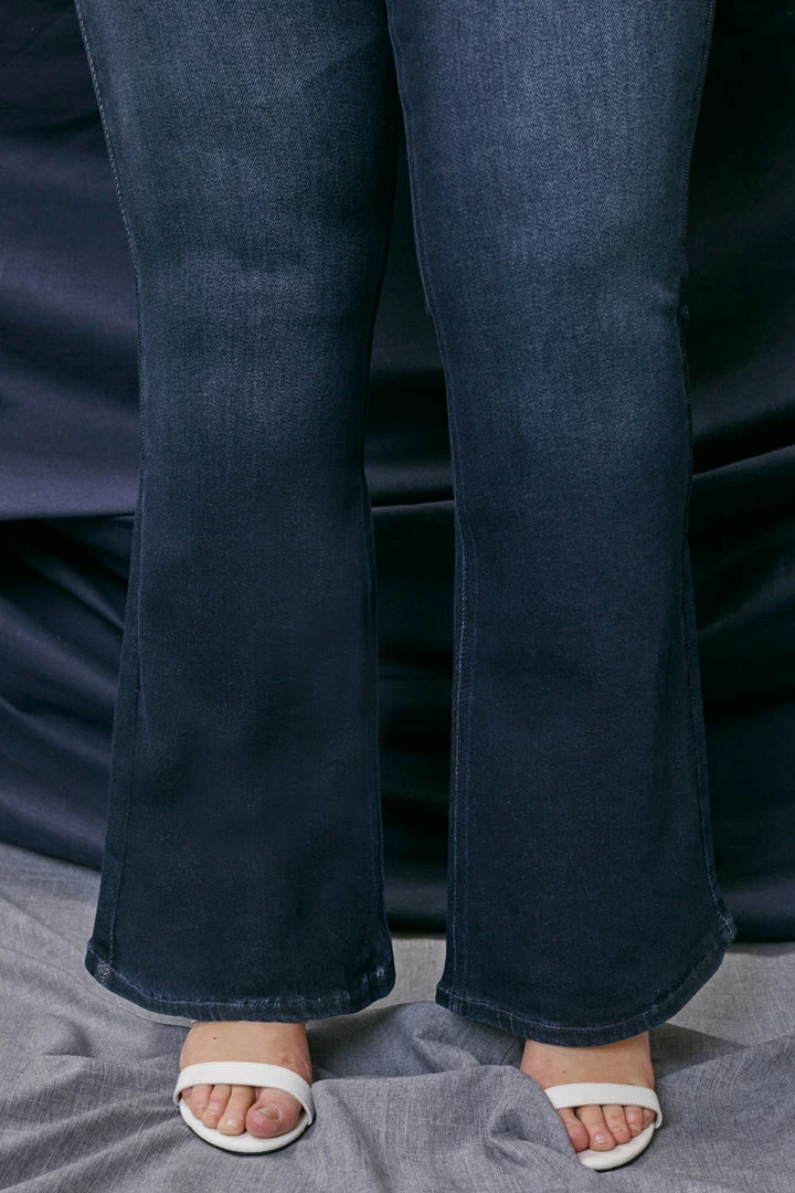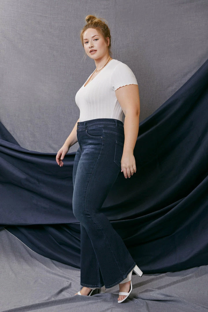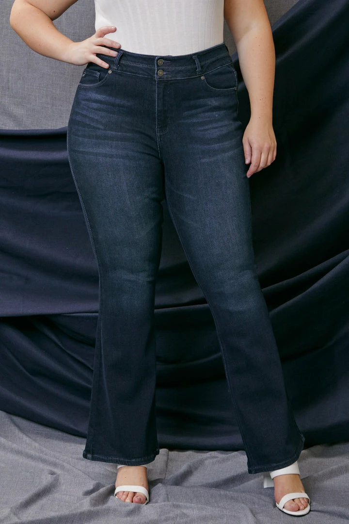 These ultra high-rise flare jeans give a retro take on a classic denim style. Its dark blue wash and double-button front give it a refreshingly stylish look that’s sure to stand out. With subtle whiskering and a light fading throughout, this design was made to be an on-trend closet staple.Â