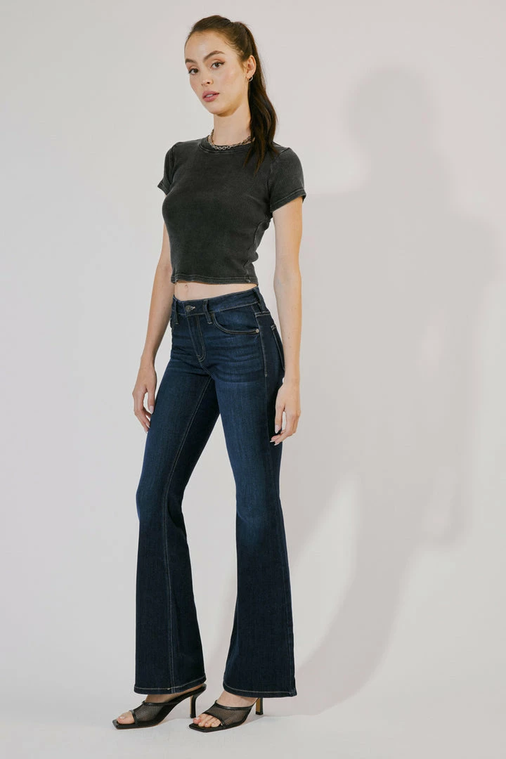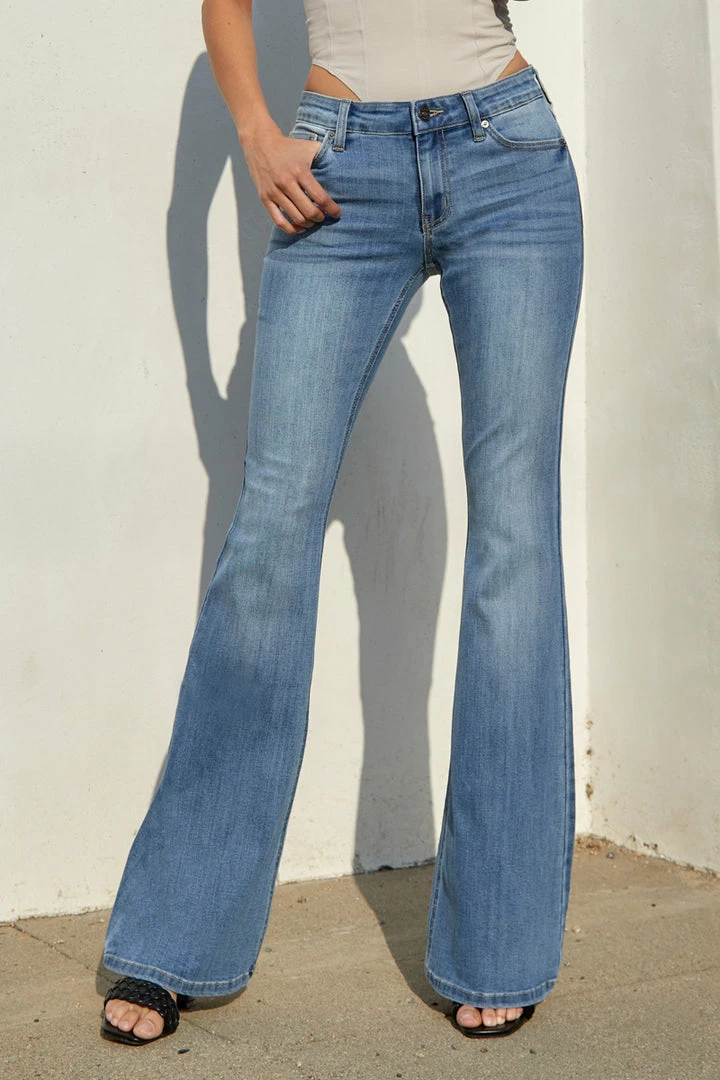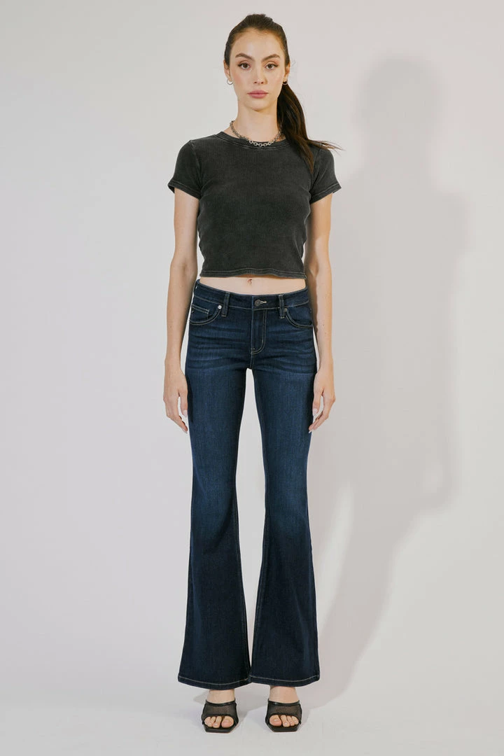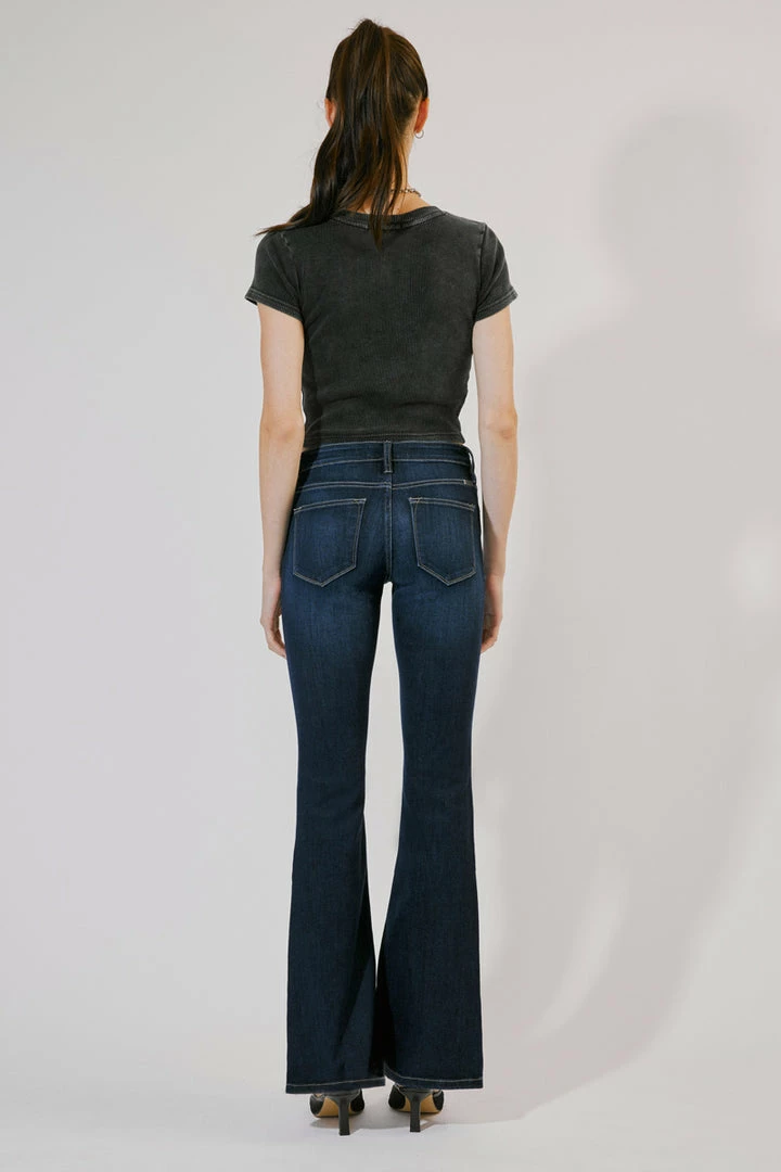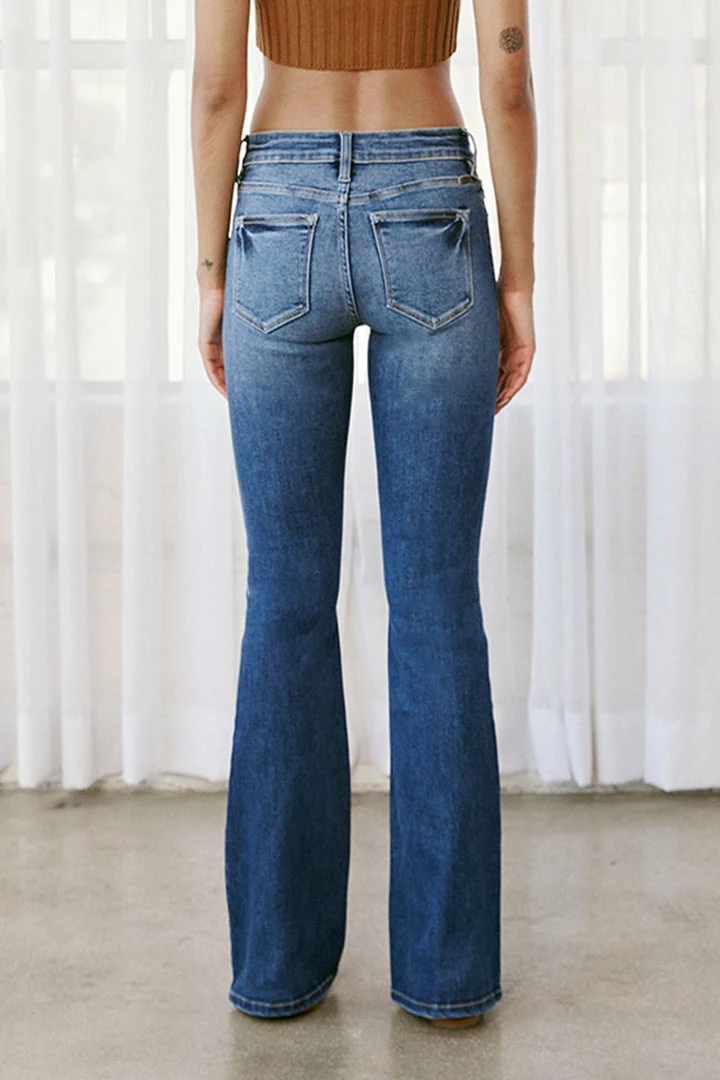 Our Samuel Mid Rise Jeans come in a flattering flared fit with light fading and whiskering for a classic blue jean look. Sits right at the natural waistline as it tapers down the thigh and begins to flare out at the knee. Made with super soft, super-stretch denim that’s breathable, flexible, and durable. Features a classic five-pocket design, single-button front, and zip-fly closure.